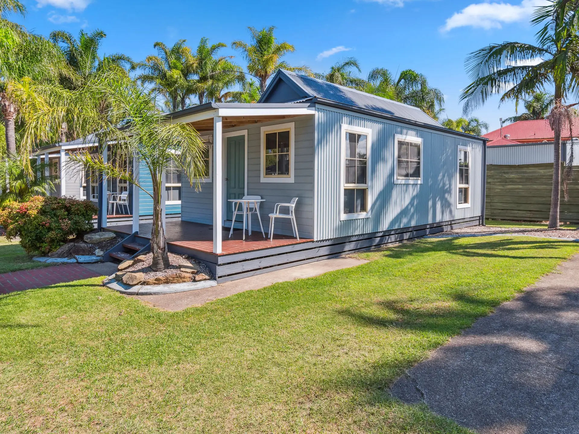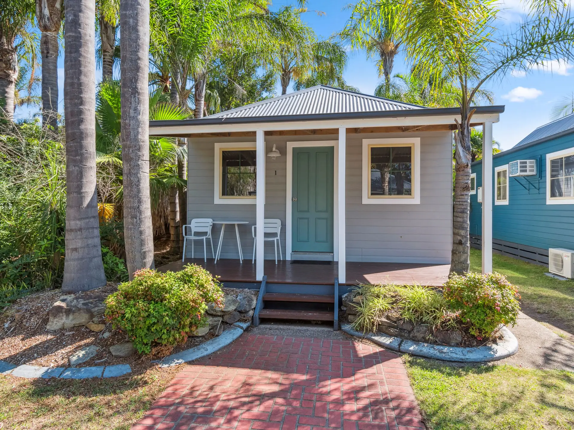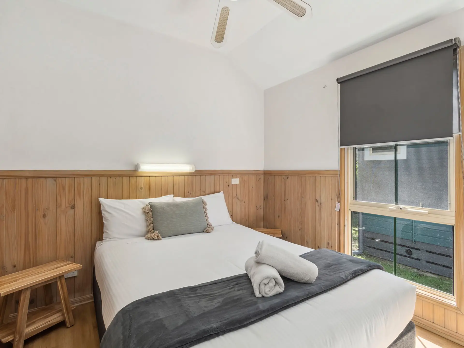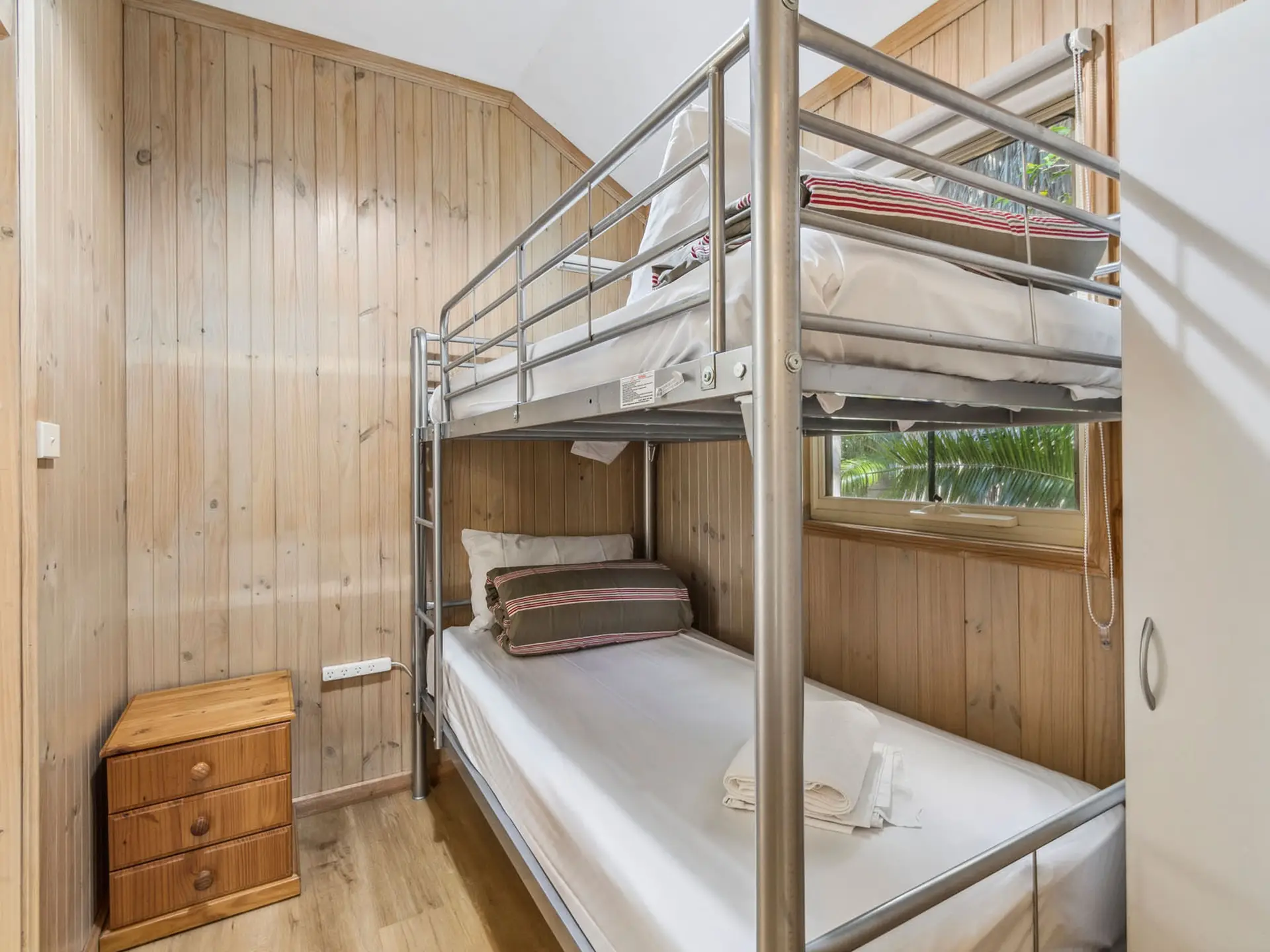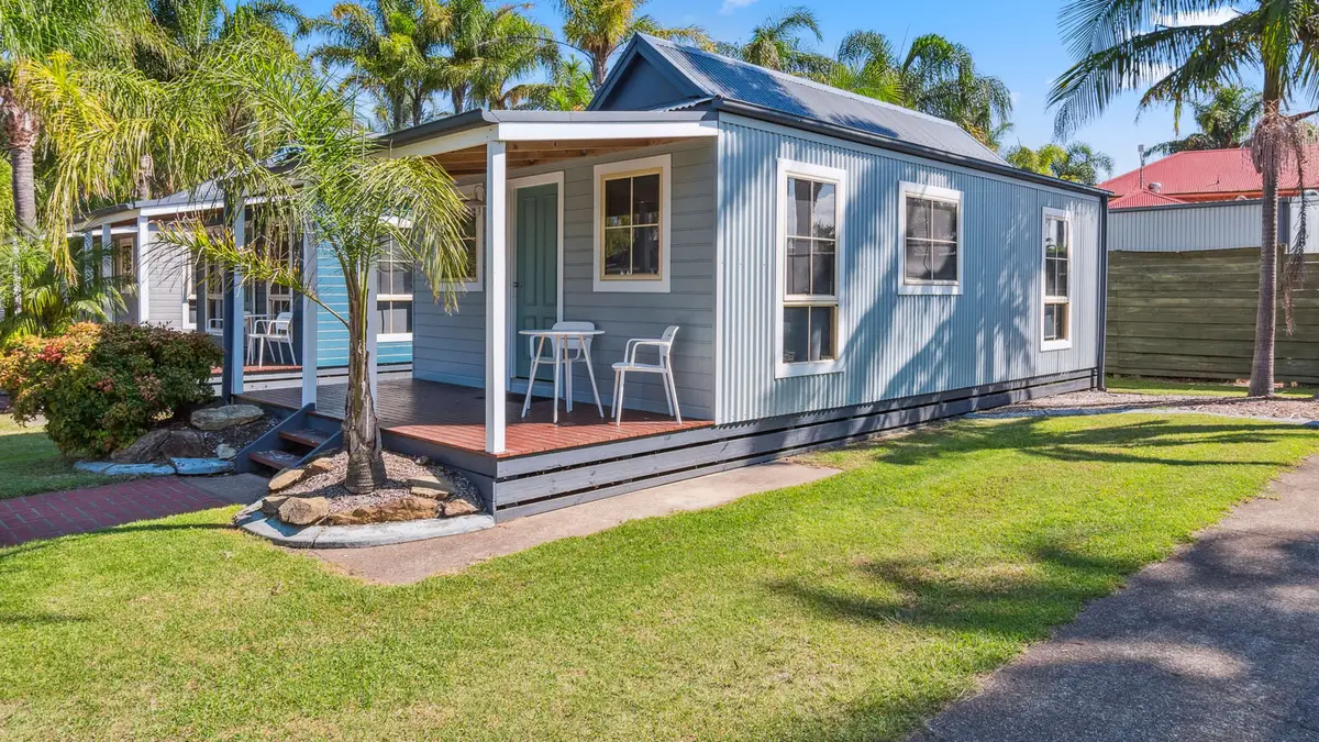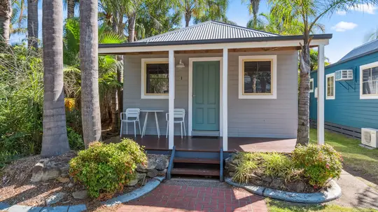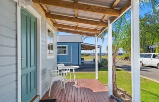 This compact two-bedroom cabin sleeps up to four with one queen bed and one bunk bed, best suited for families. It features a kitchenette with microwave, fridge, and gas cooktop, along with a bathroom and open-plan living. The air-conditioned interior opens to a balcony, and the cabin is pet-friendly.