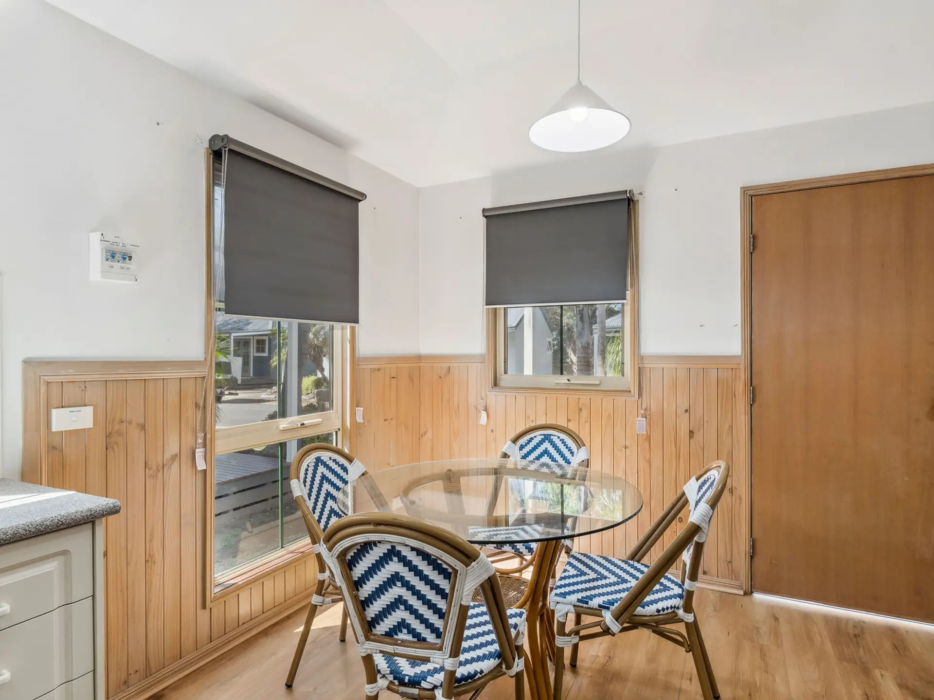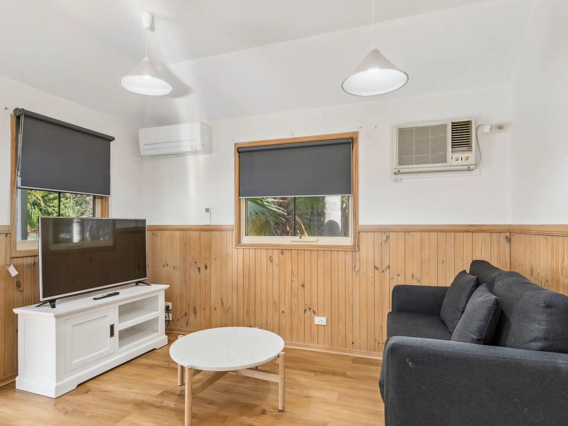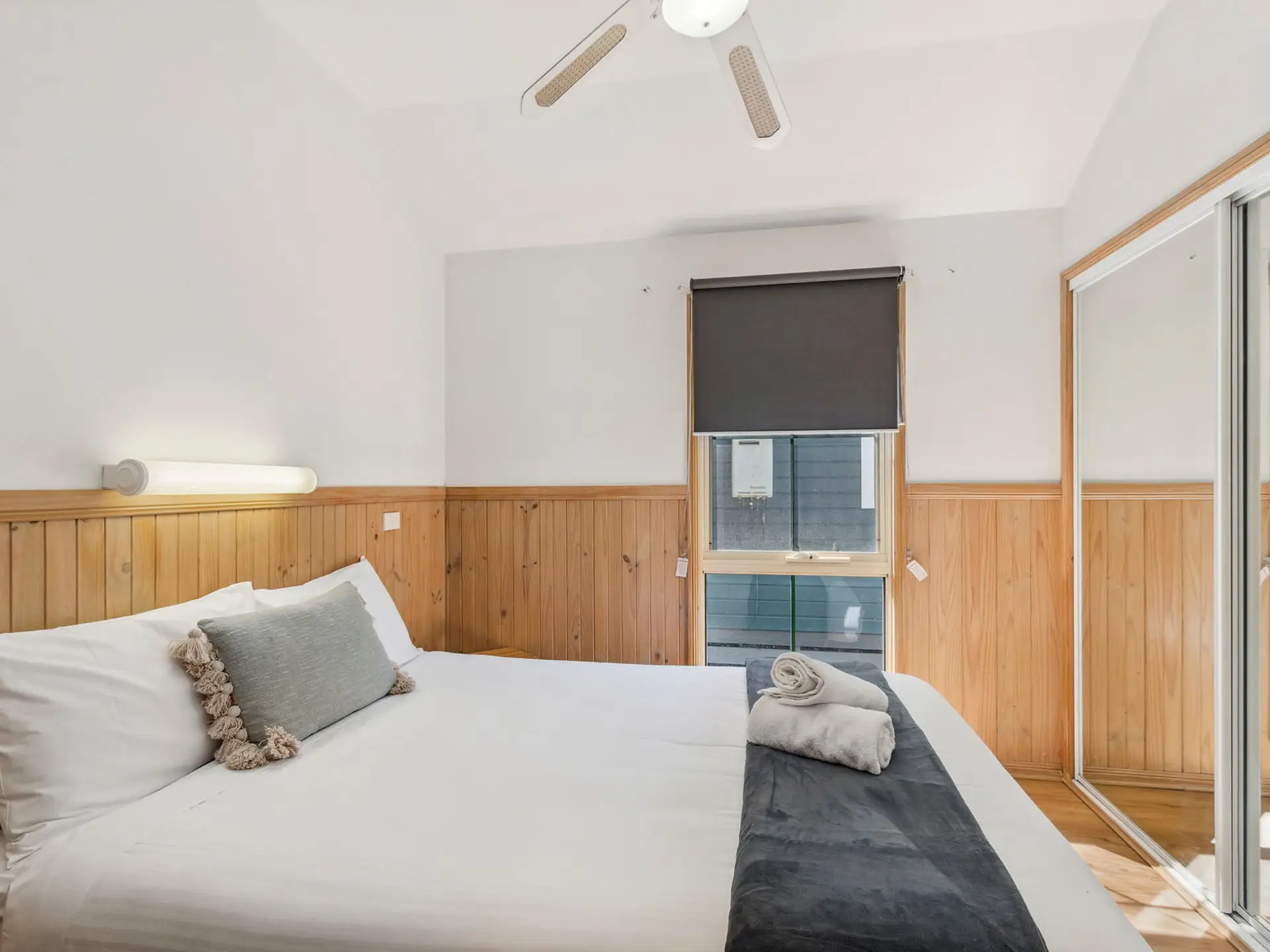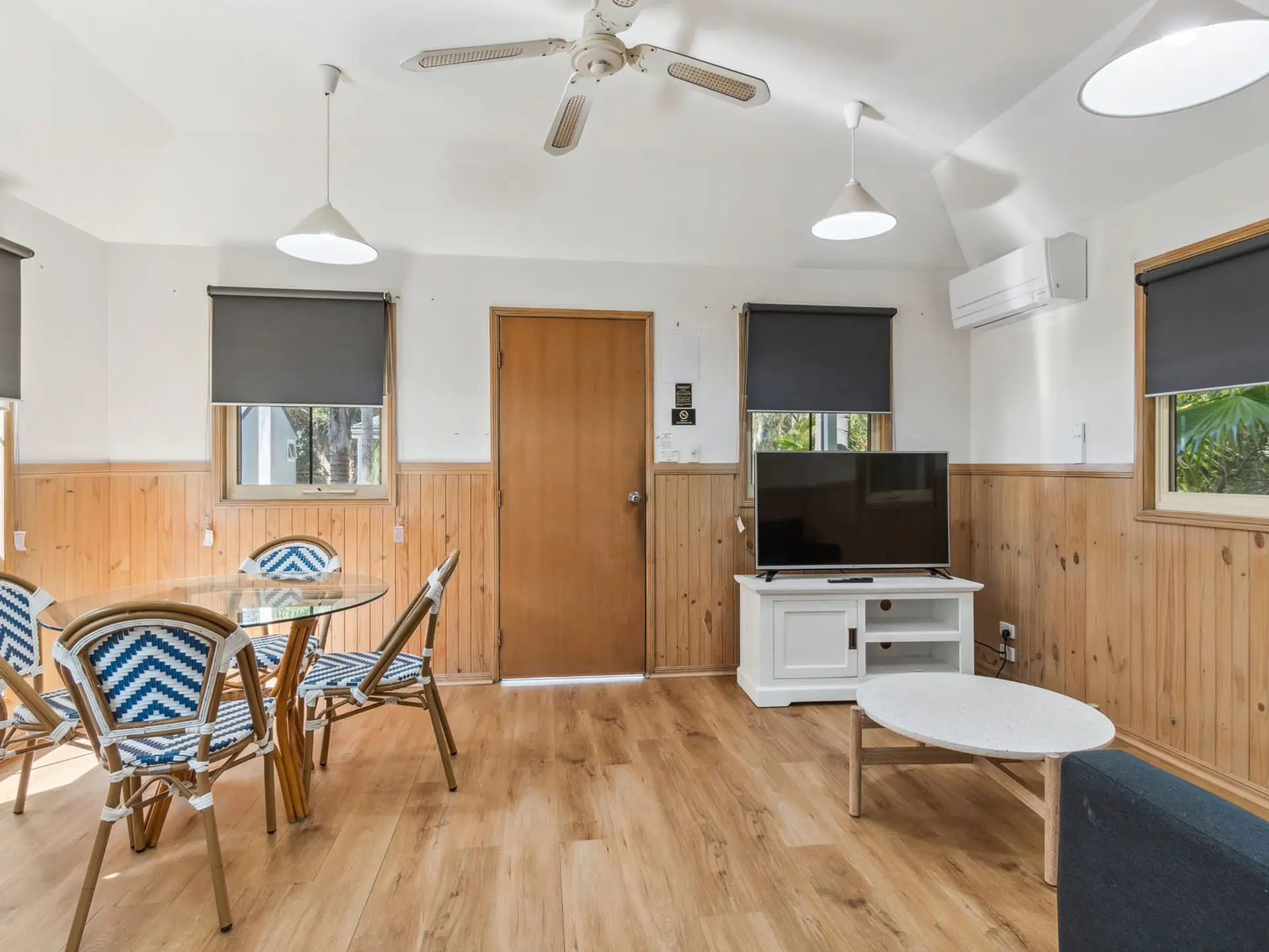 This compact two-bedroom cabin sleeps up to four with one queen bed and one bunk bed, best suited for families. It features a kitchenette with microwave, fridge, and gas cooktop, along with a bathroom and open-plan living. The air-conditioned interior opens to a balcony, and the cabin is pet-friendly.