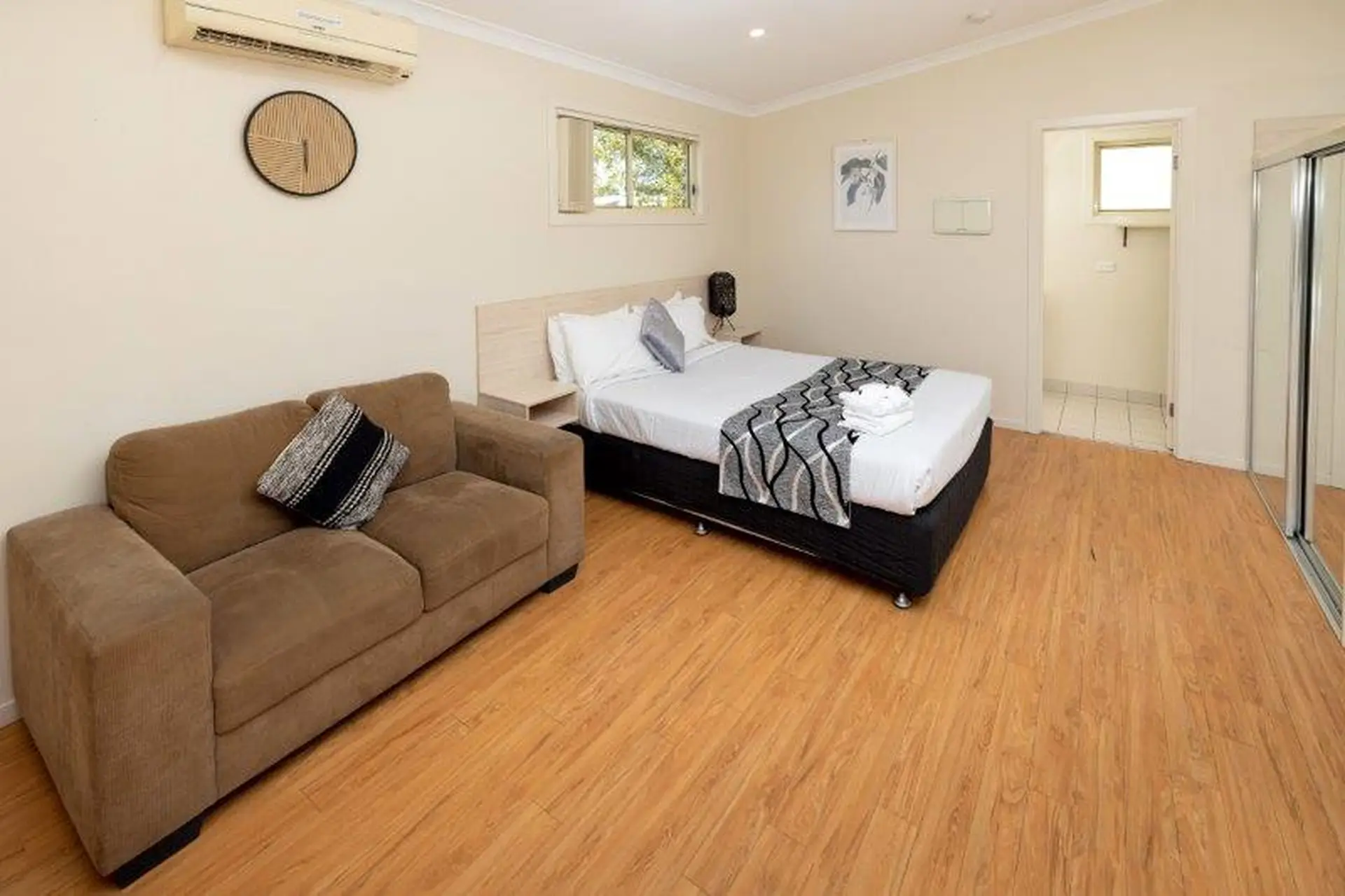 This pet-friendly studio offers a cosy stay for up to three guests with a queen bed. It includes a private bathroom, a well-equipped kitchen with electric cooktop, microwave, and full-size fridge, plus air conditioning and a TV. A great choice for travellers with furry companions.