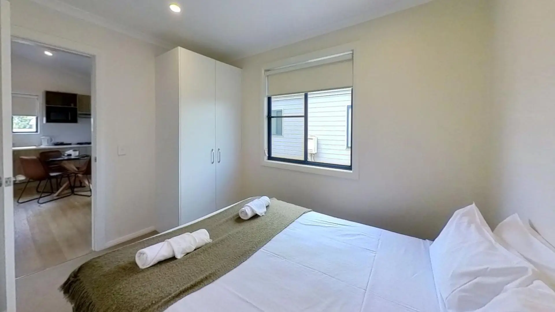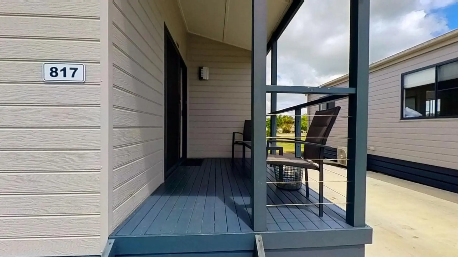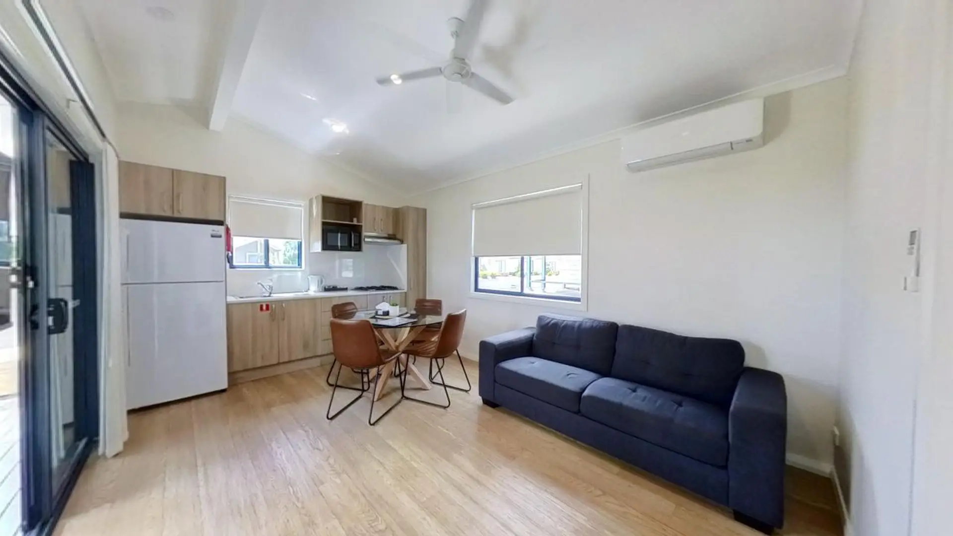 This comfortable two-bedroom cabin is perfect for up to four guests, featuring two queen beds. The air-conditioned living space includes a dining area and TV, while the kitchen comes equipped with an electric cooktop, microwave, and full-size fridge. A spacious undercover deck adds a relaxing outdoor touch.