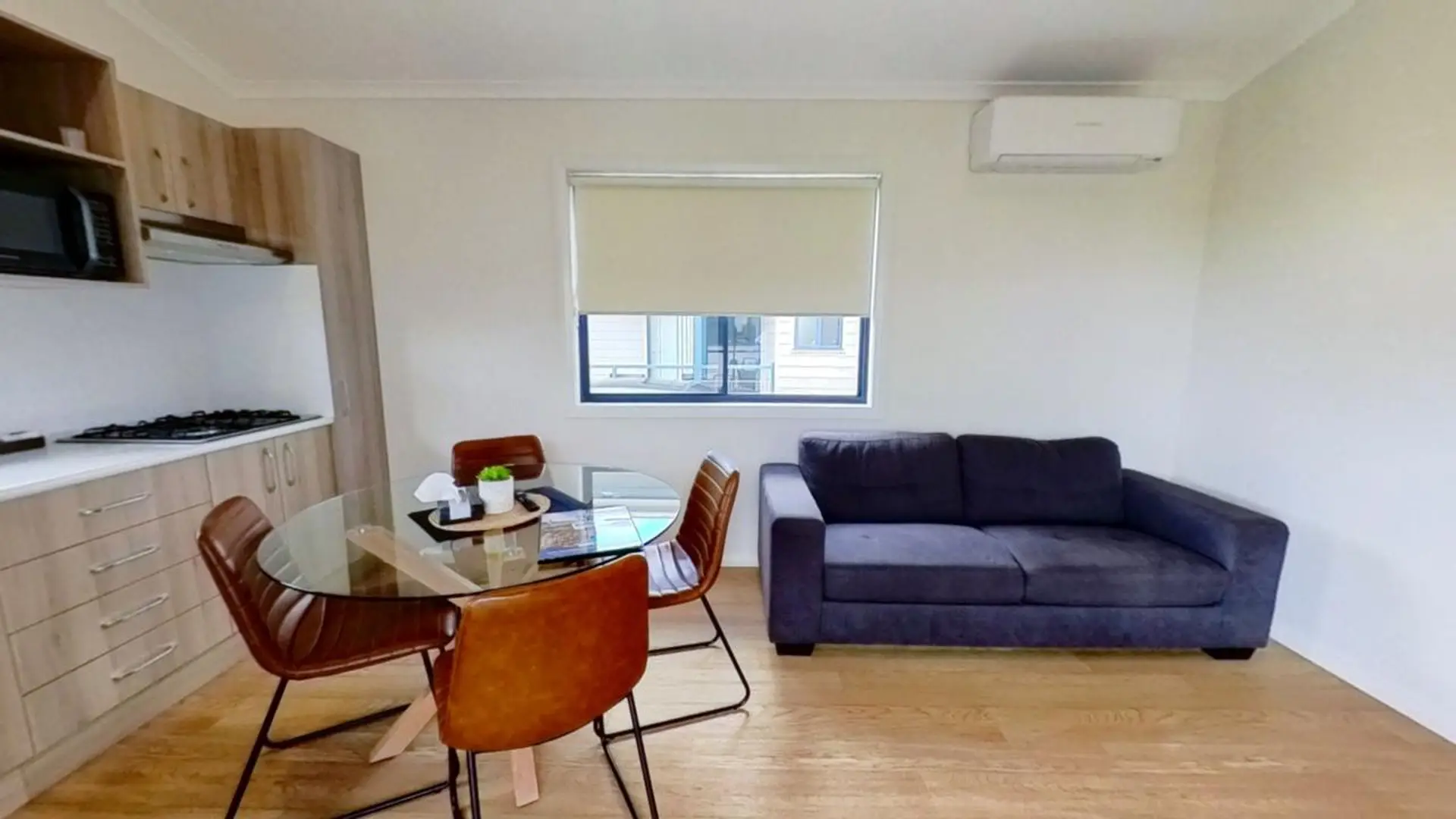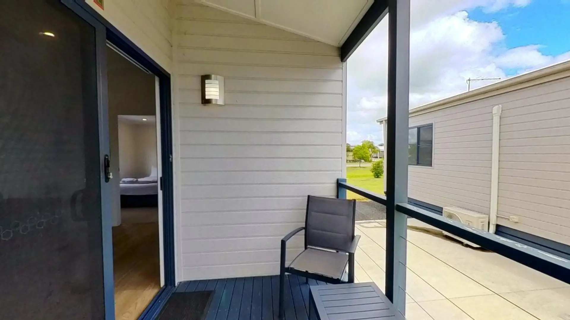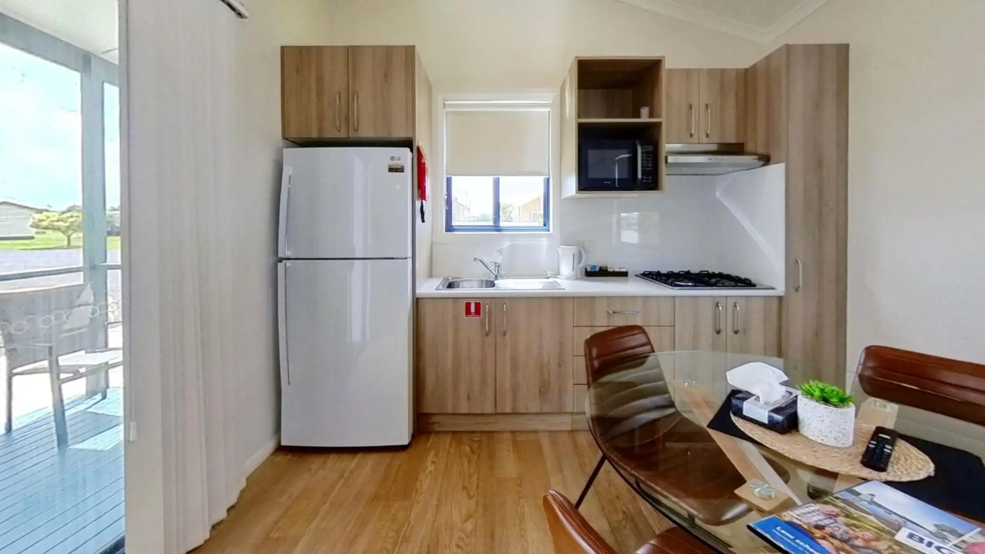 This comfortable two-bedroom cabin is perfect for up to four guests, featuring two queen beds. The air-conditioned living space includes a dining area and TV, while the kitchen comes equipped with an electric cooktop, microwave, and full-size fridge. A spacious undercover deck adds a relaxing outdoor touch.