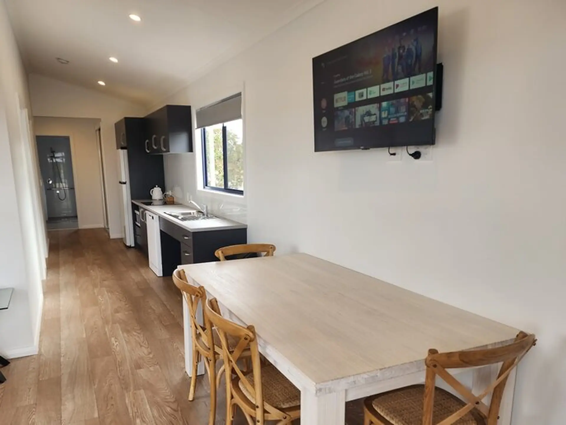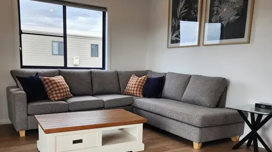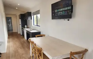 Designed for comfort and accessibility, this three-bedroom cabin sleeps up to six with two queen beds and two king single beds. It features a private bathroom with accessible amenities, full kitchen with electric cooktop, microwave, dishwasher, and full-size fridge. Enjoy reverse cycle air conditioning and a spacious outdoor deck with dining set.