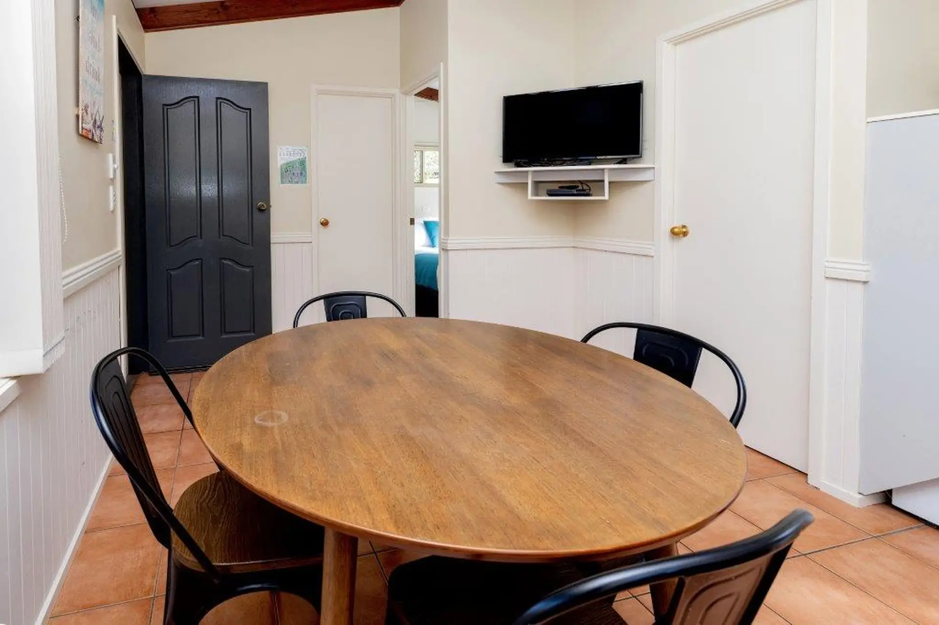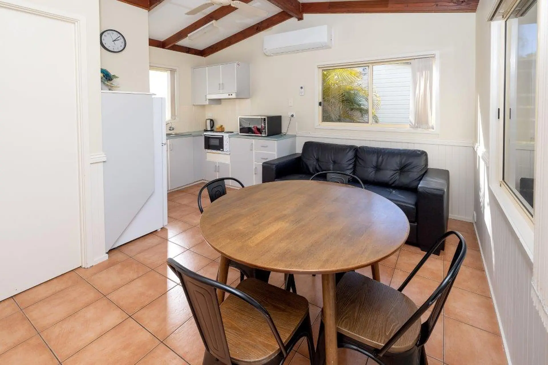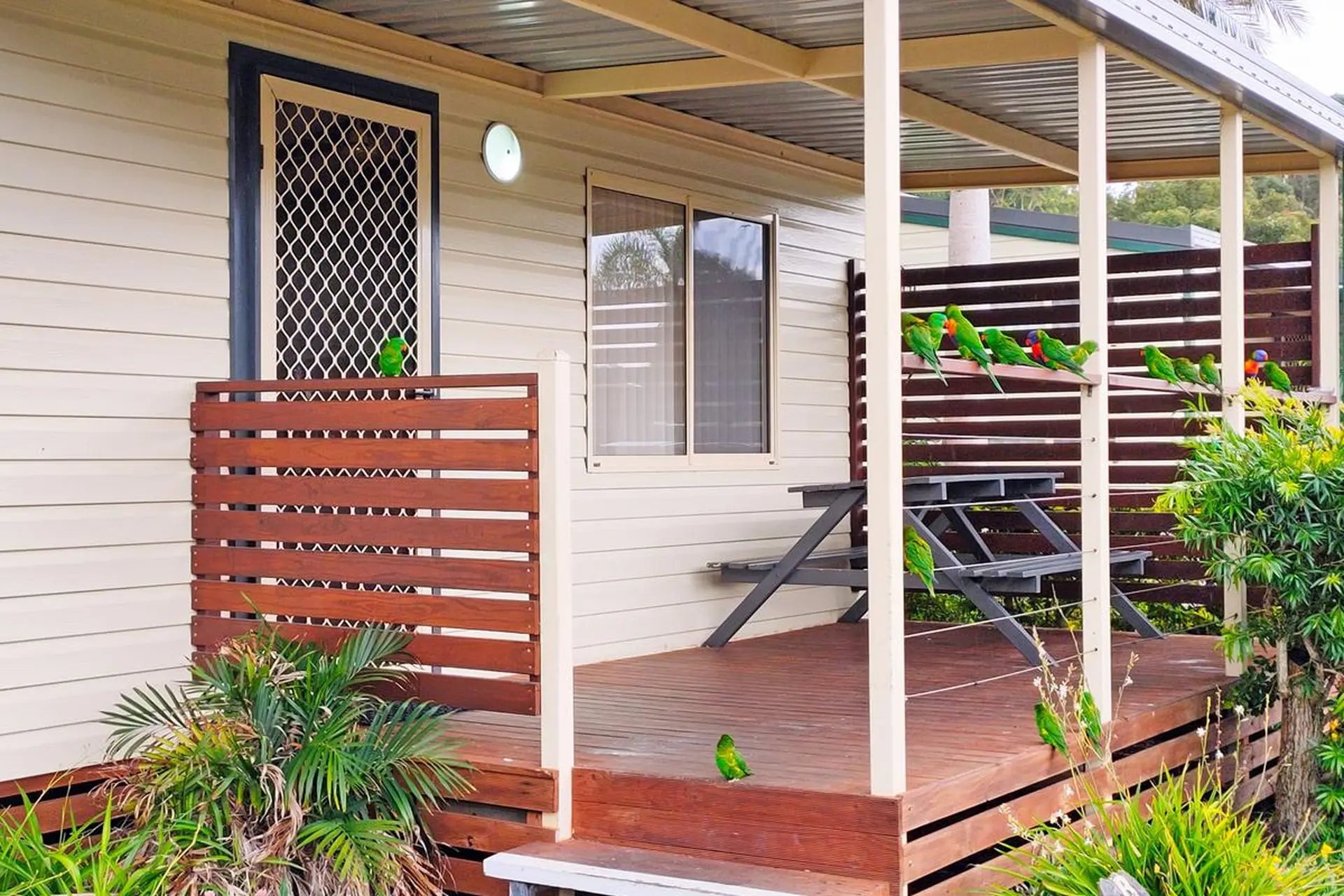 This pet-friendly two-bedroom cabin sleeps up to five with a queen bed and tri-bunk—perfect for families or friends. Enjoy a kitchenette, open living with TV, and fans and heating for comfort. Step out to the covered deck with outdoor seating and unwind with your furry companion. Affordable and welcoming, it’s a relaxed coastal base.