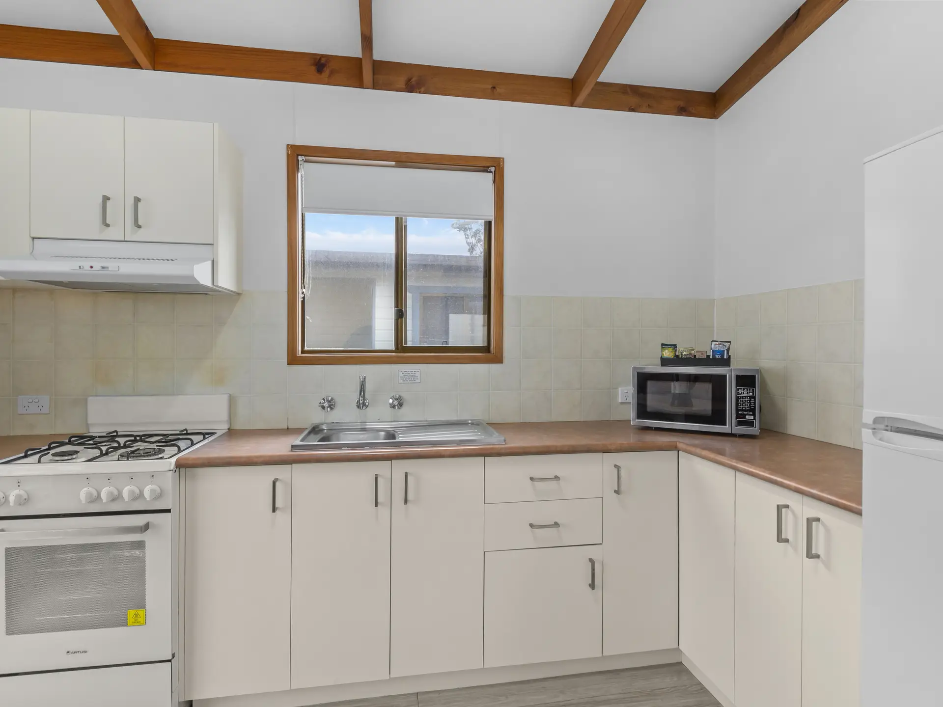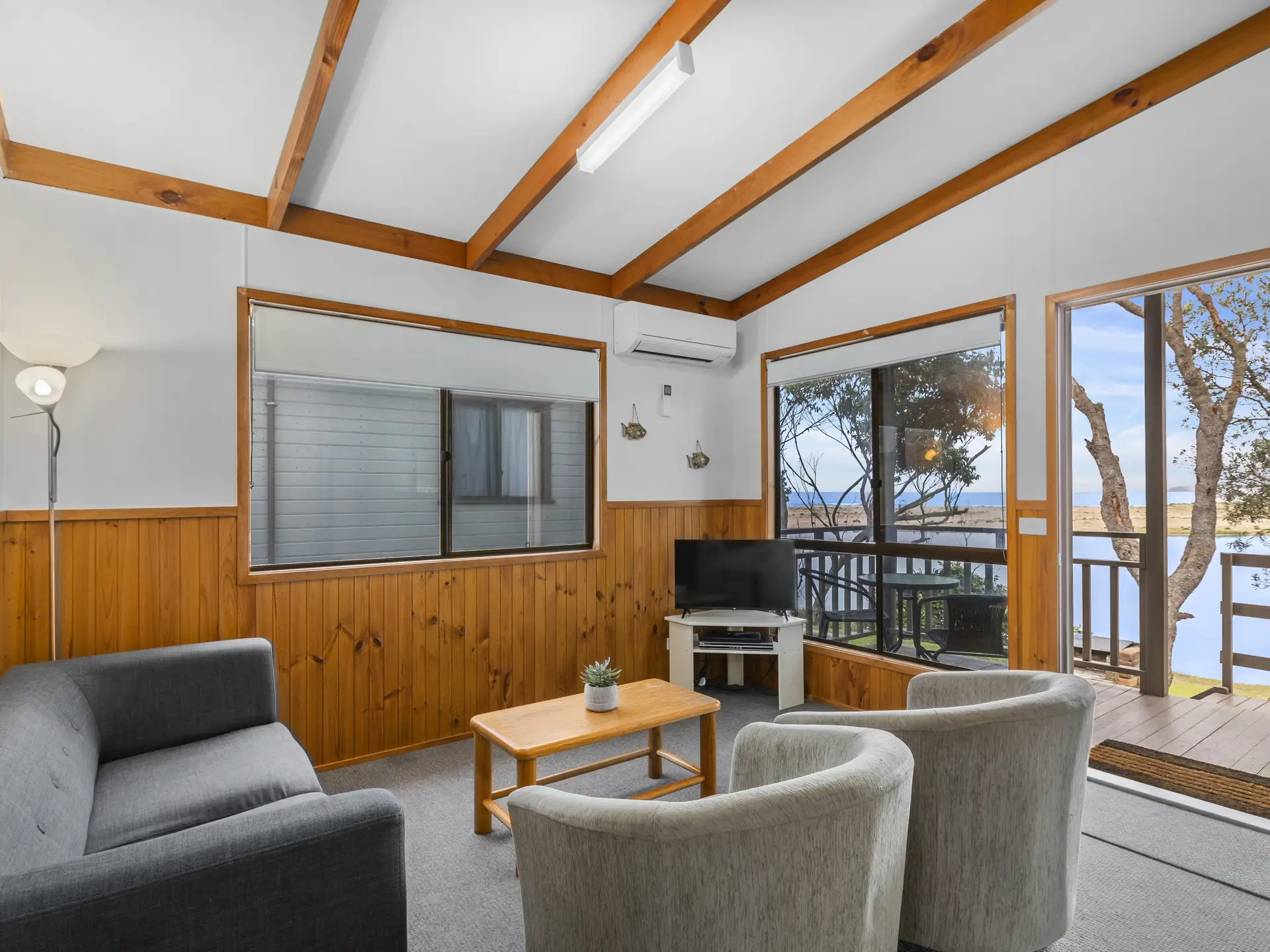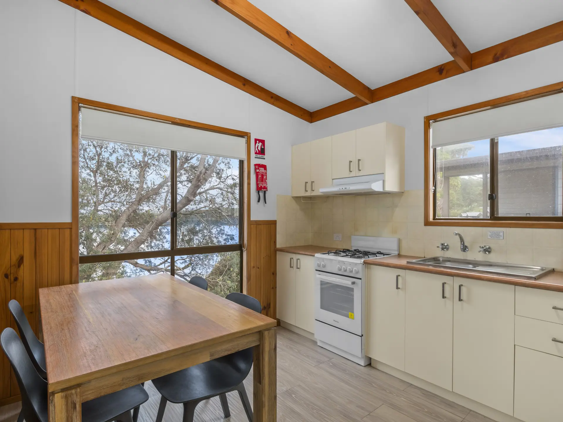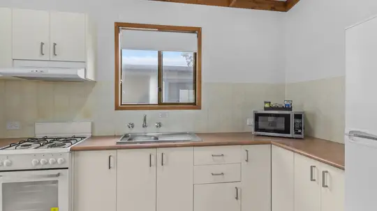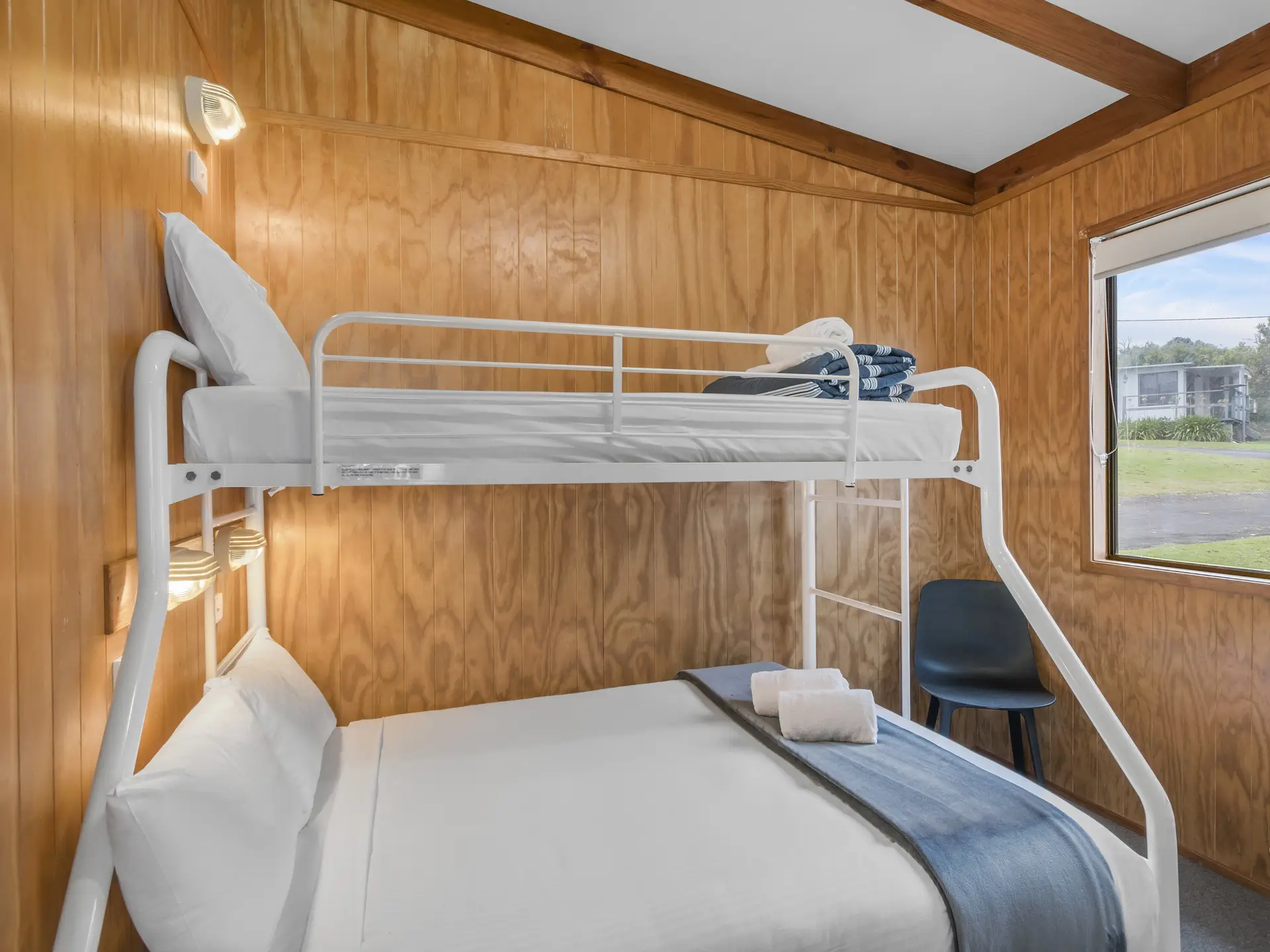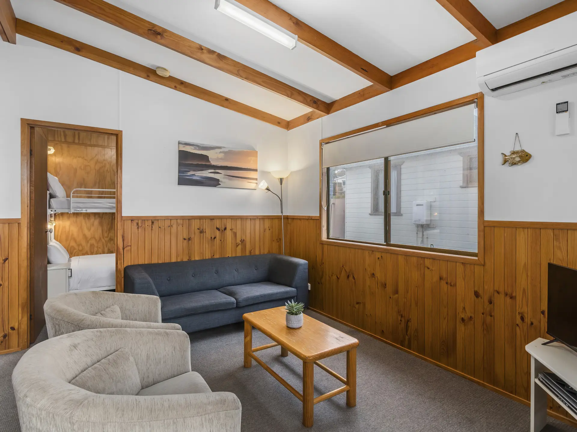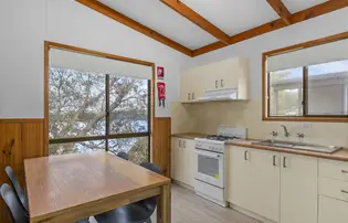 Comfortably accommodating five guests, this two-bedroom cabin features a double bed and a bunk with double base and single top. A full kitchen and dining area offer easy meal prep, while air conditioning and an outdoor area with wood BBQ and seating ensure comfort throughout your stay.