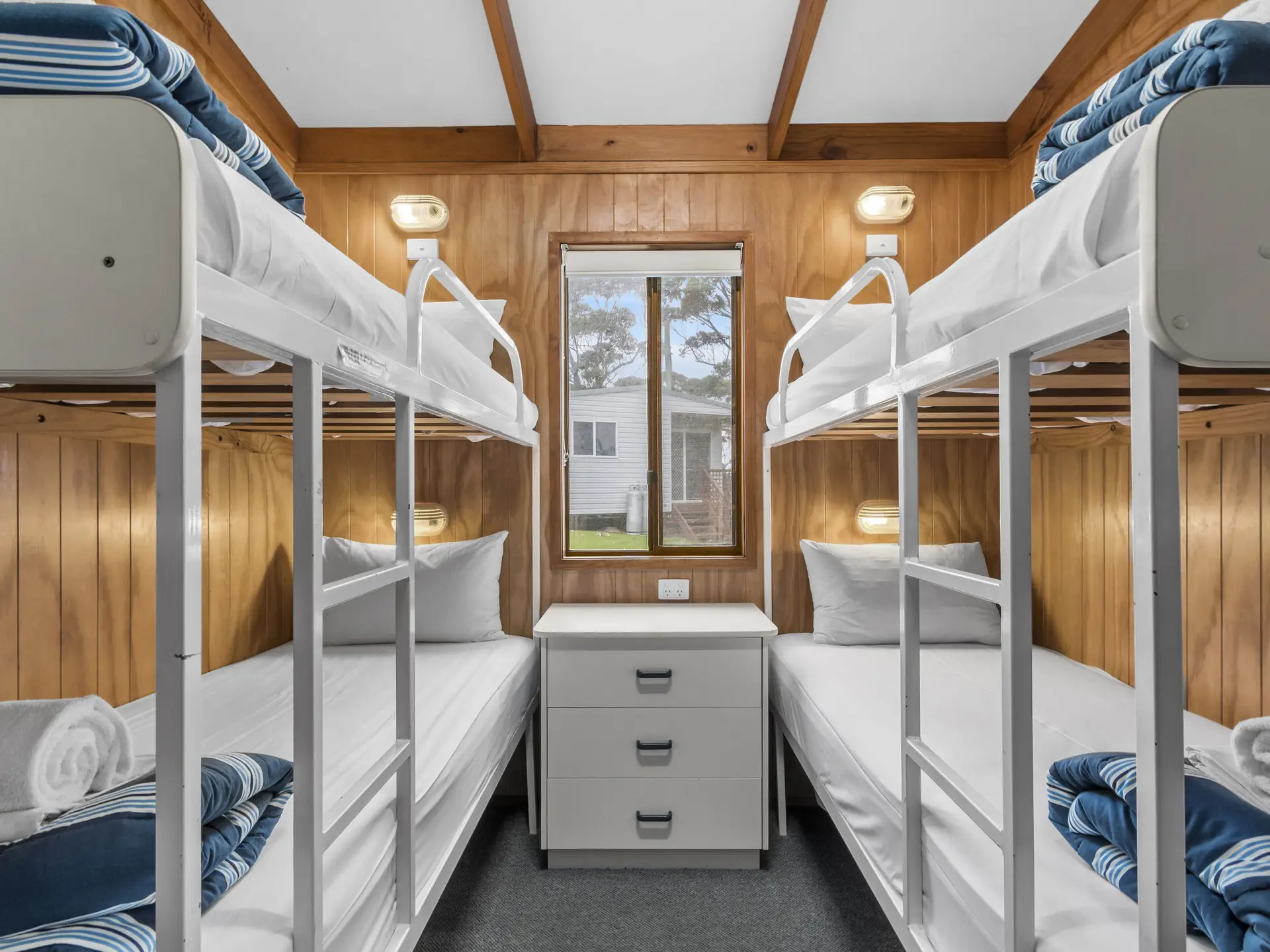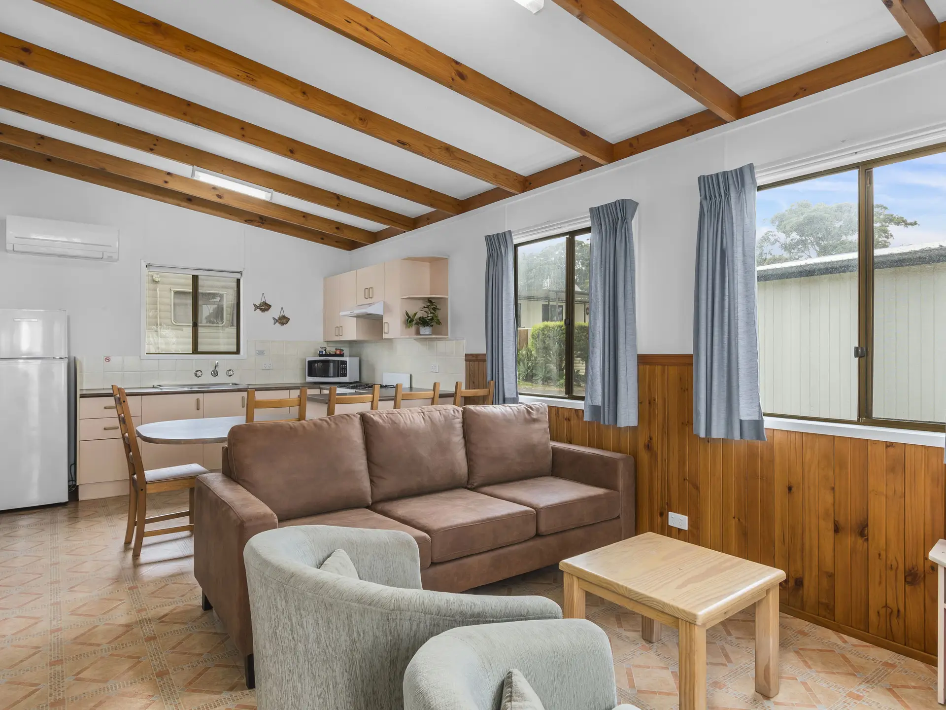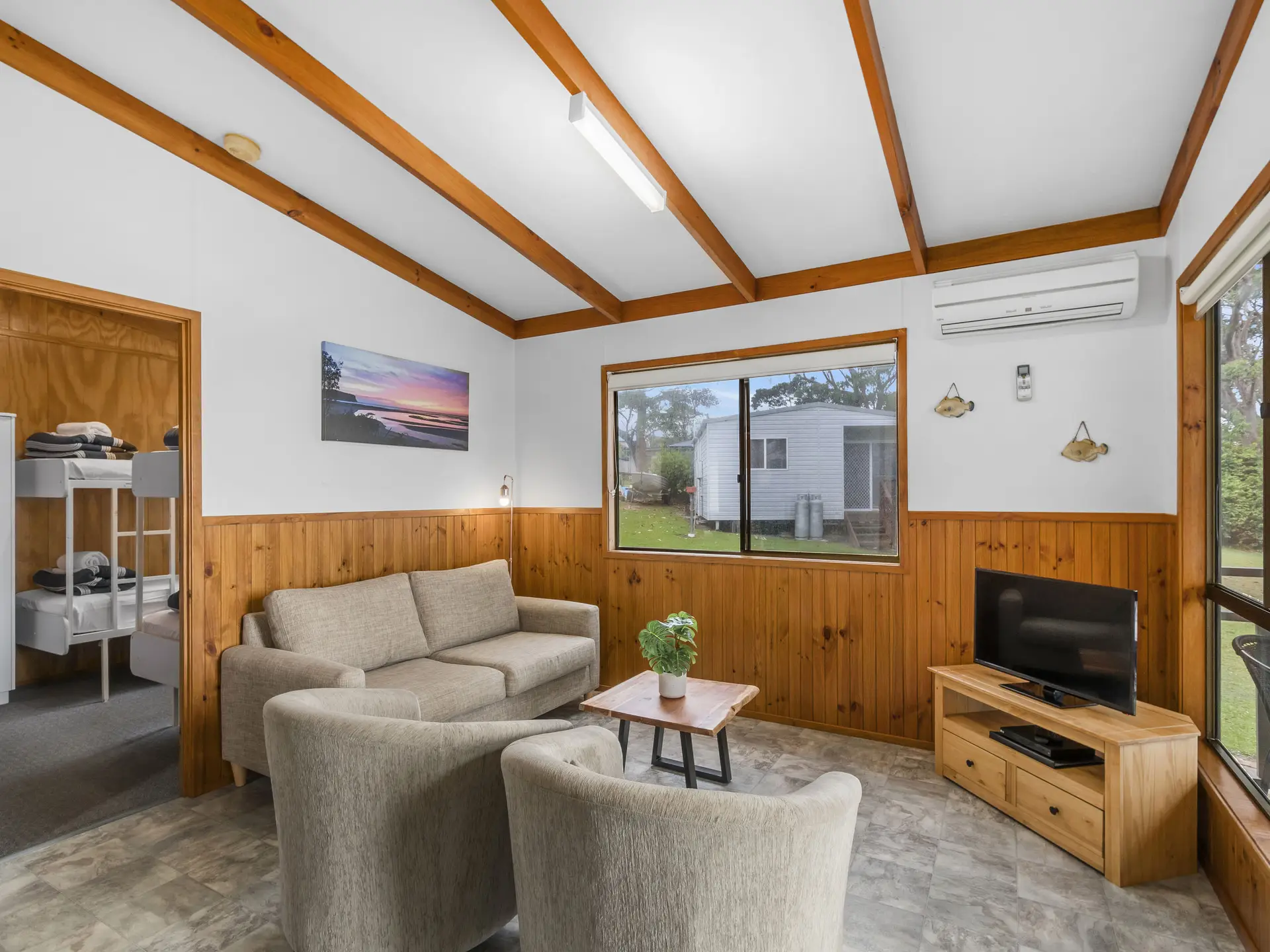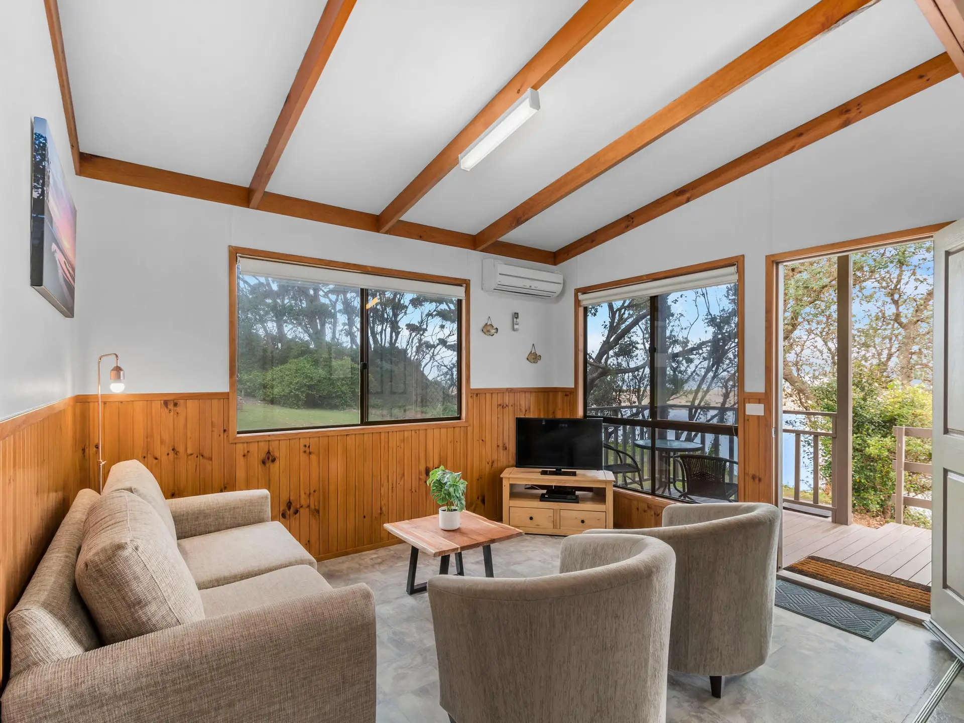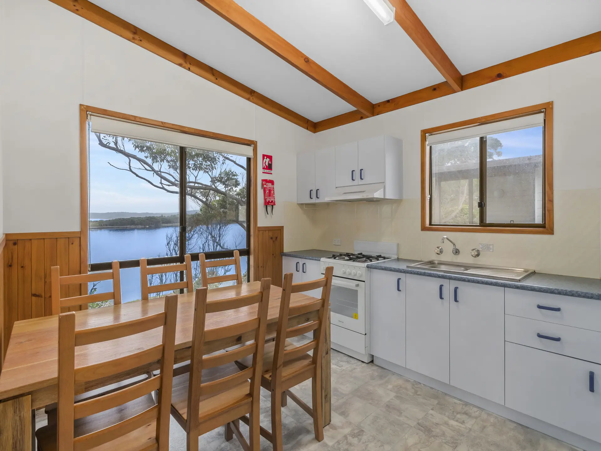Offering comfortable lakeside living for up to six guests, this cabin includes a double bed and two sets of single bunks across two bedrooms. The full kitchen has a gas cooktop, oven, and full fridge. Enjoy meals on the shaded verandah with seating or cook on your own private wood fire. Air conditioning and a lounge area complete the stay.