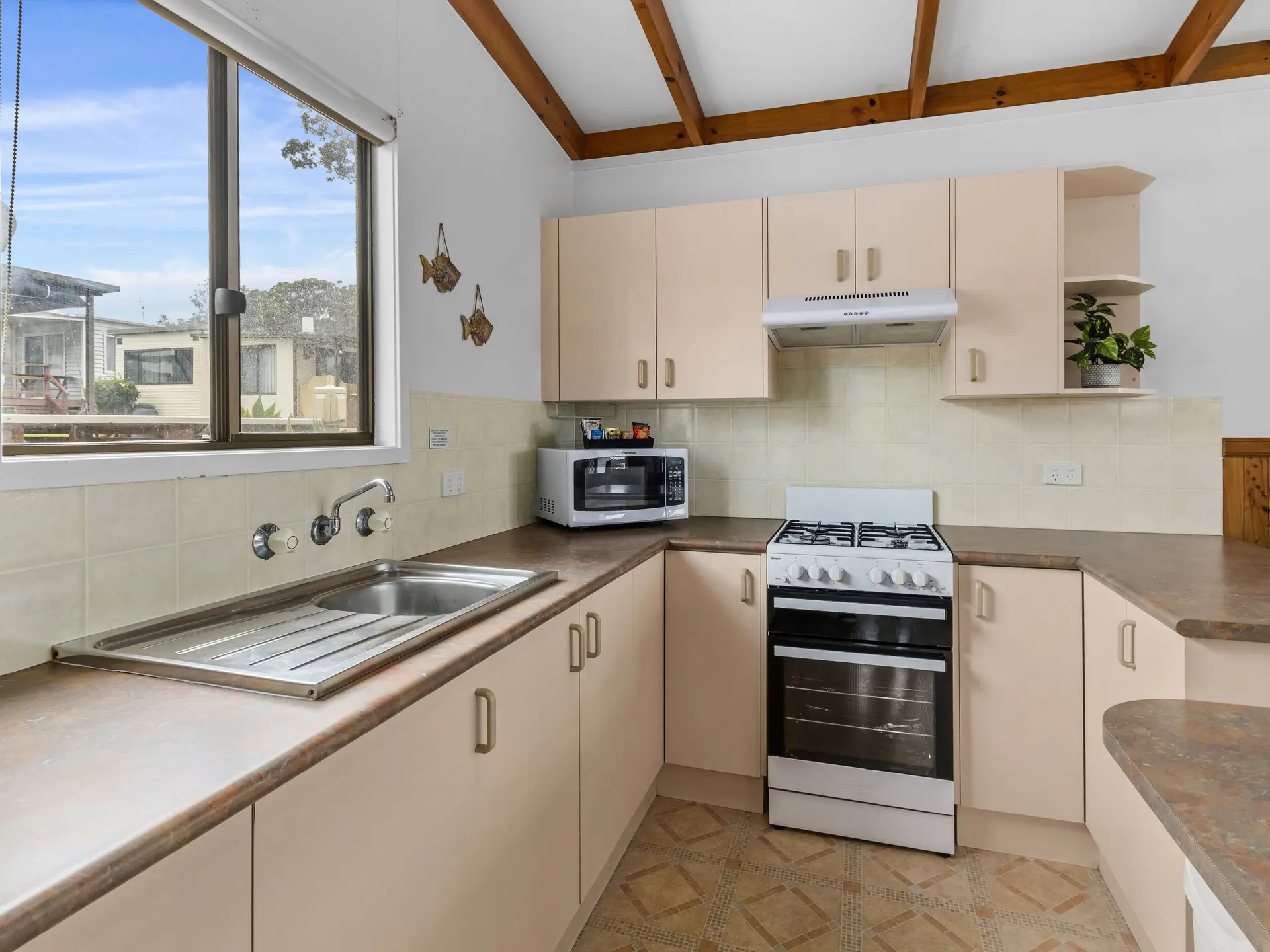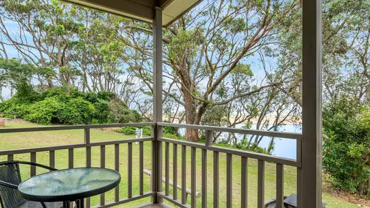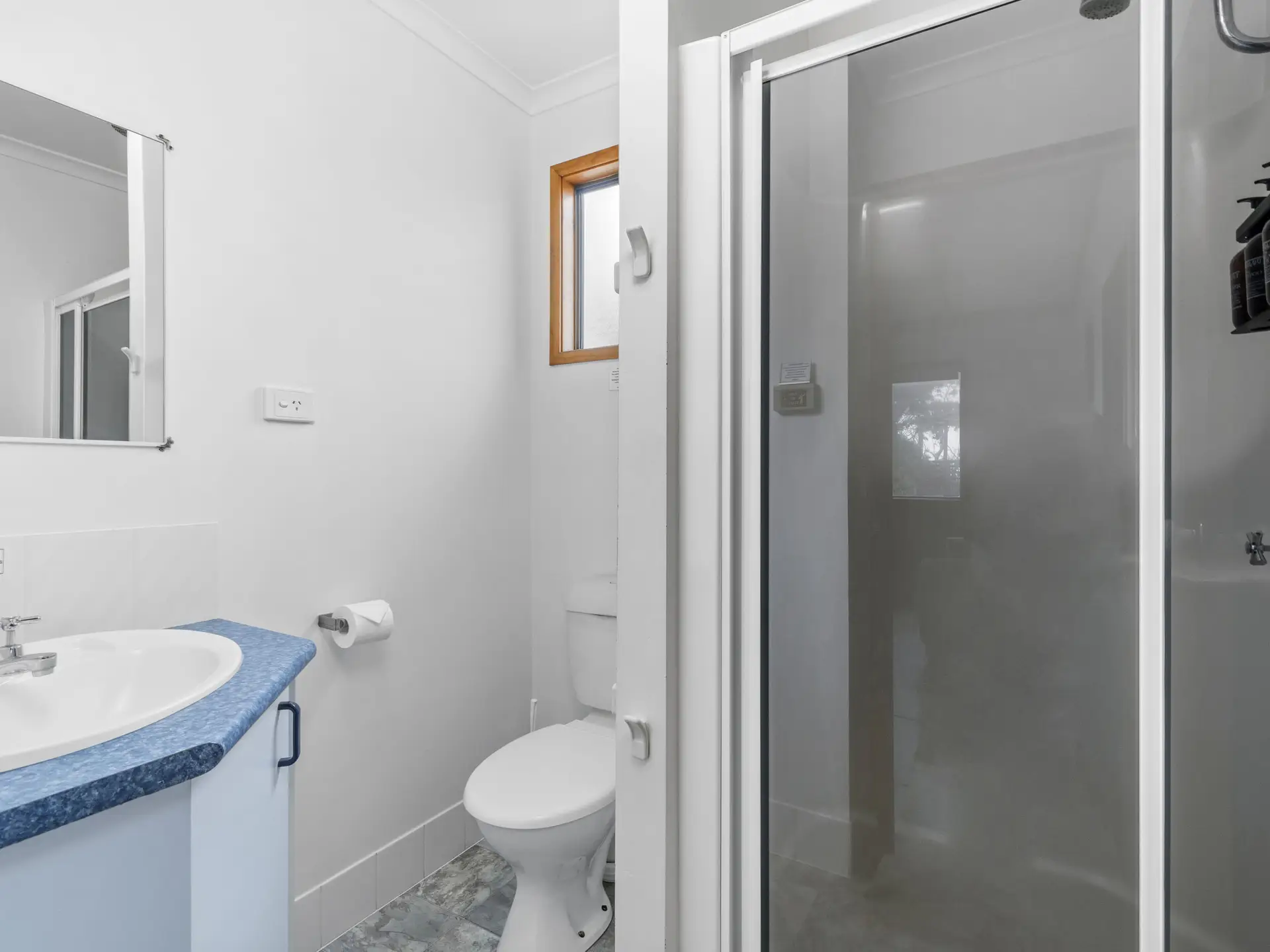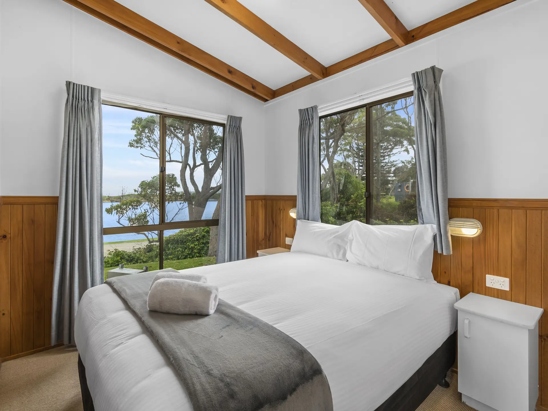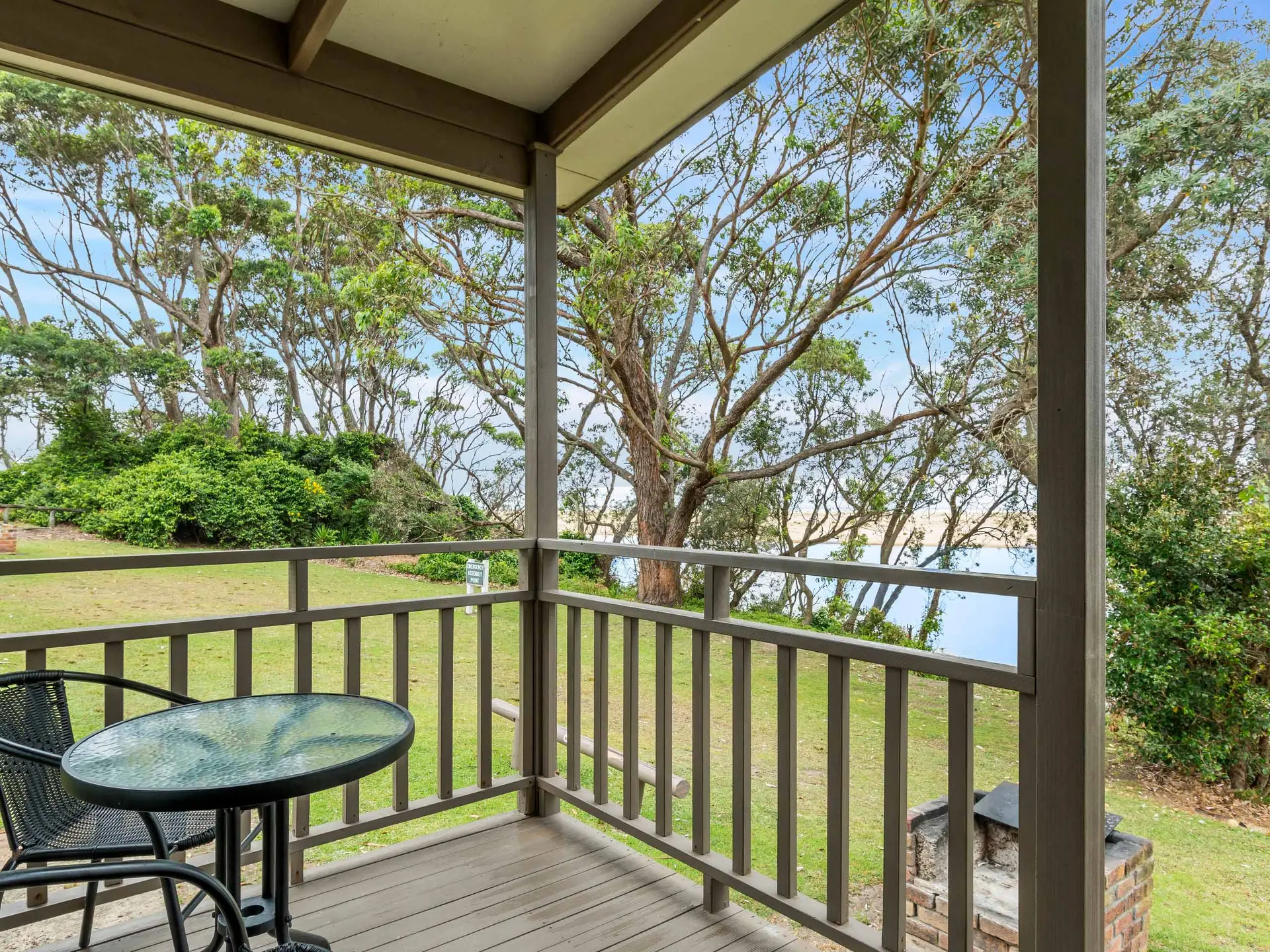 Offering comfortable lakeside living for up to six guests, this cabin includes a double bed and two sets of single bunks across two bedrooms. The full kitchen has a gas cooktop, oven, and full fridge. Enjoy meals on the shaded verandah with seating or cook on your own private wood fire. Air conditioning and a lounge area complete the stay.
