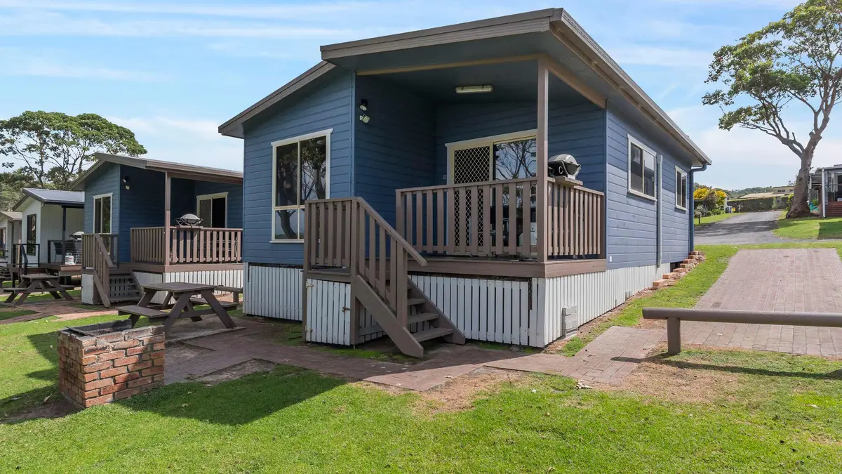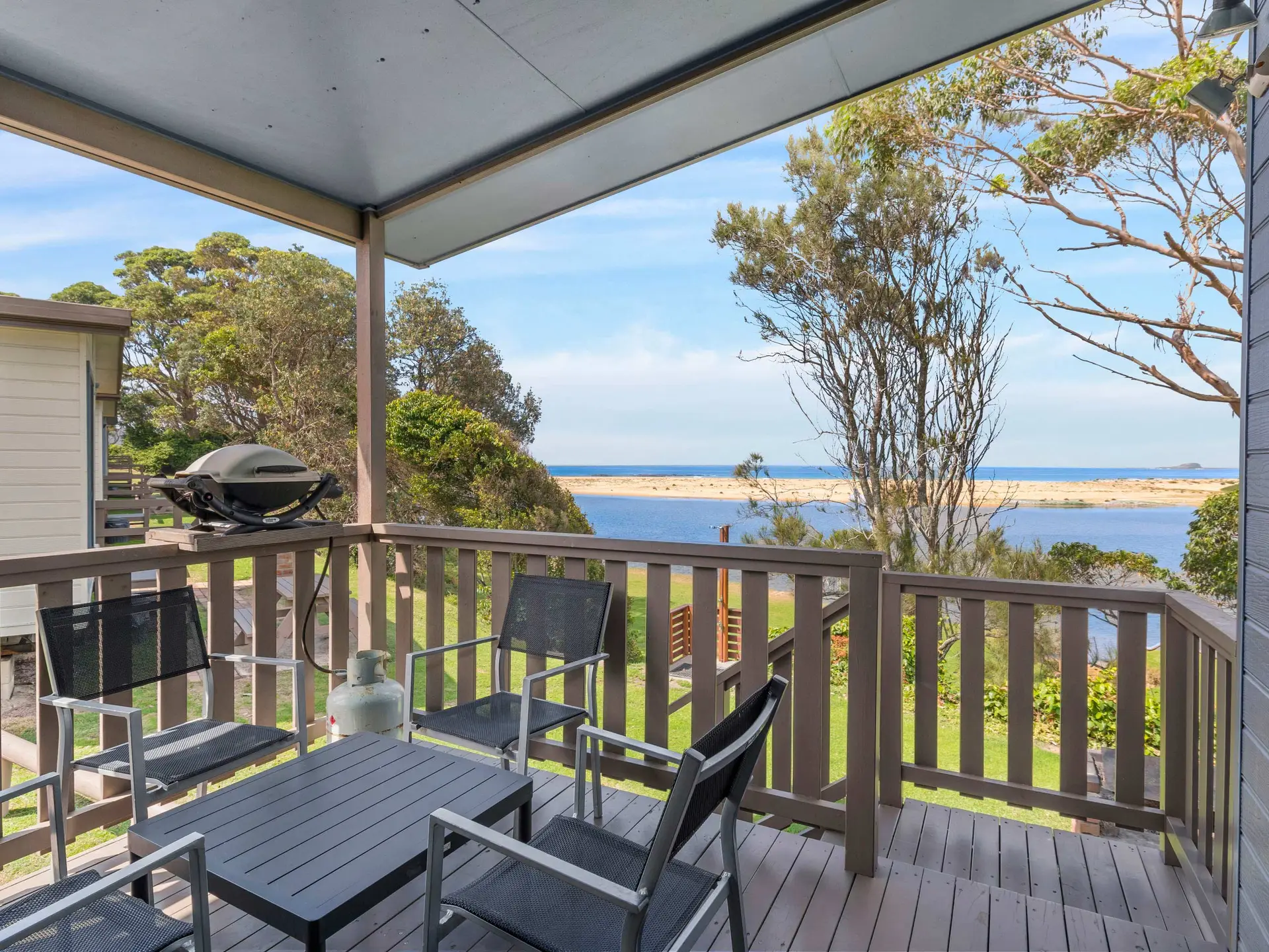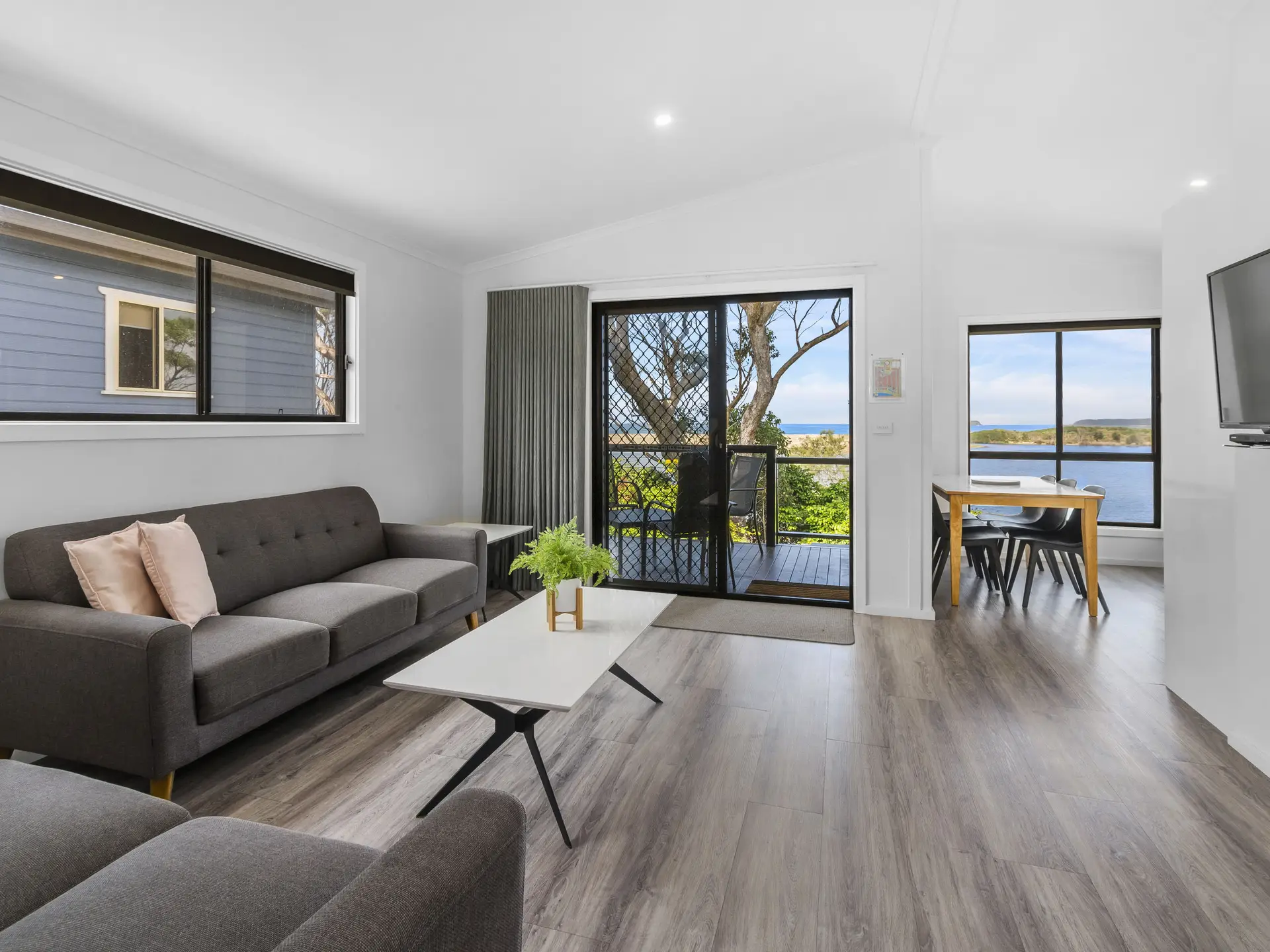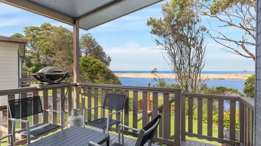 Wake up to water views in this stylish cabin designed for comfort and convenience. Sleeping four guests, it features a queen bed and two singles that can convert to a king. A fully equipped kitchen with gas cooktop, electric oven, coffee machine, and dishwasher makes self-catering easy. Relax in air-conditioned comfort or unwind on the verandah with outdoor seating, gas BBQ and private fireplace.