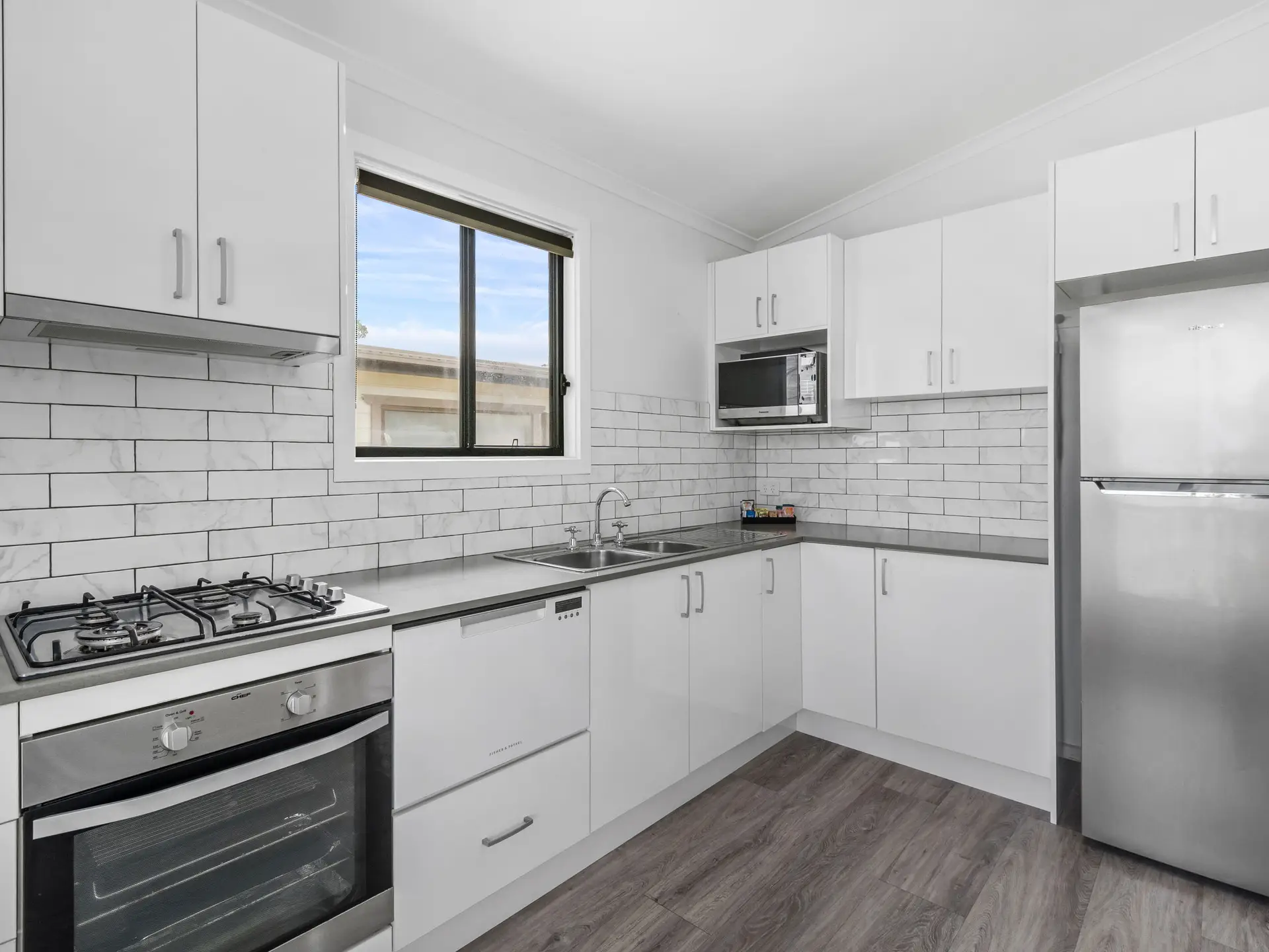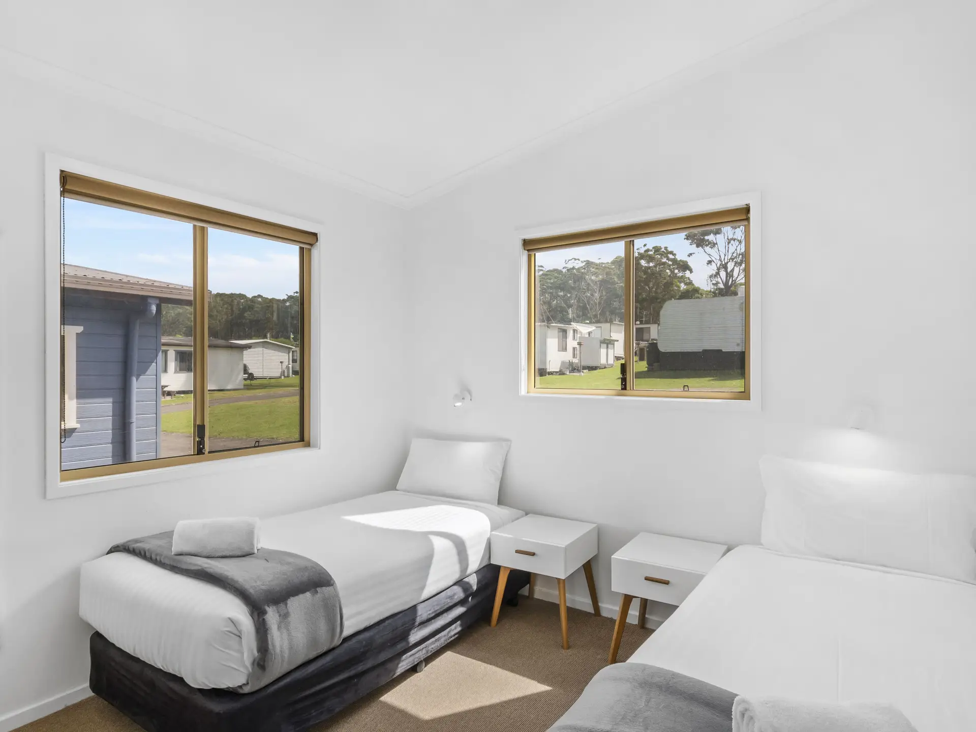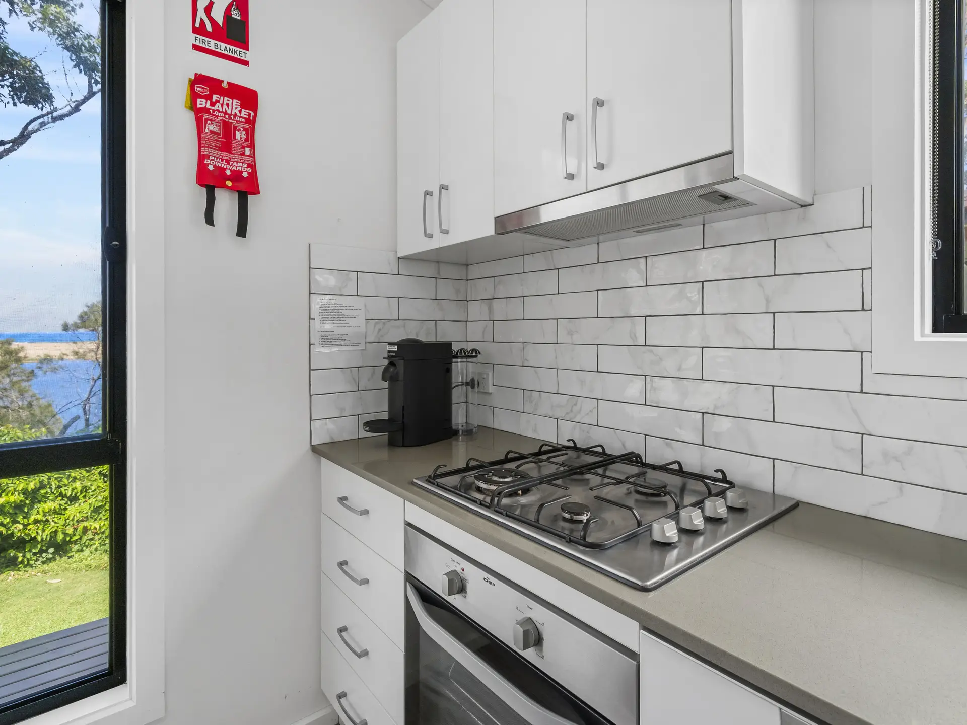 Wake up to water views in this stylish cabin designed for comfort and convenience. Sleeping four guests, it features a queen bed and two singles that can convert to a king. A fully equipped kitchen with gas cooktop, electric oven, coffee machine, and dishwasher makes self-catering easy. Relax in air-conditioned comfort or unwind on the verandah with outdoor seating, gas BBQ and private fireplace.