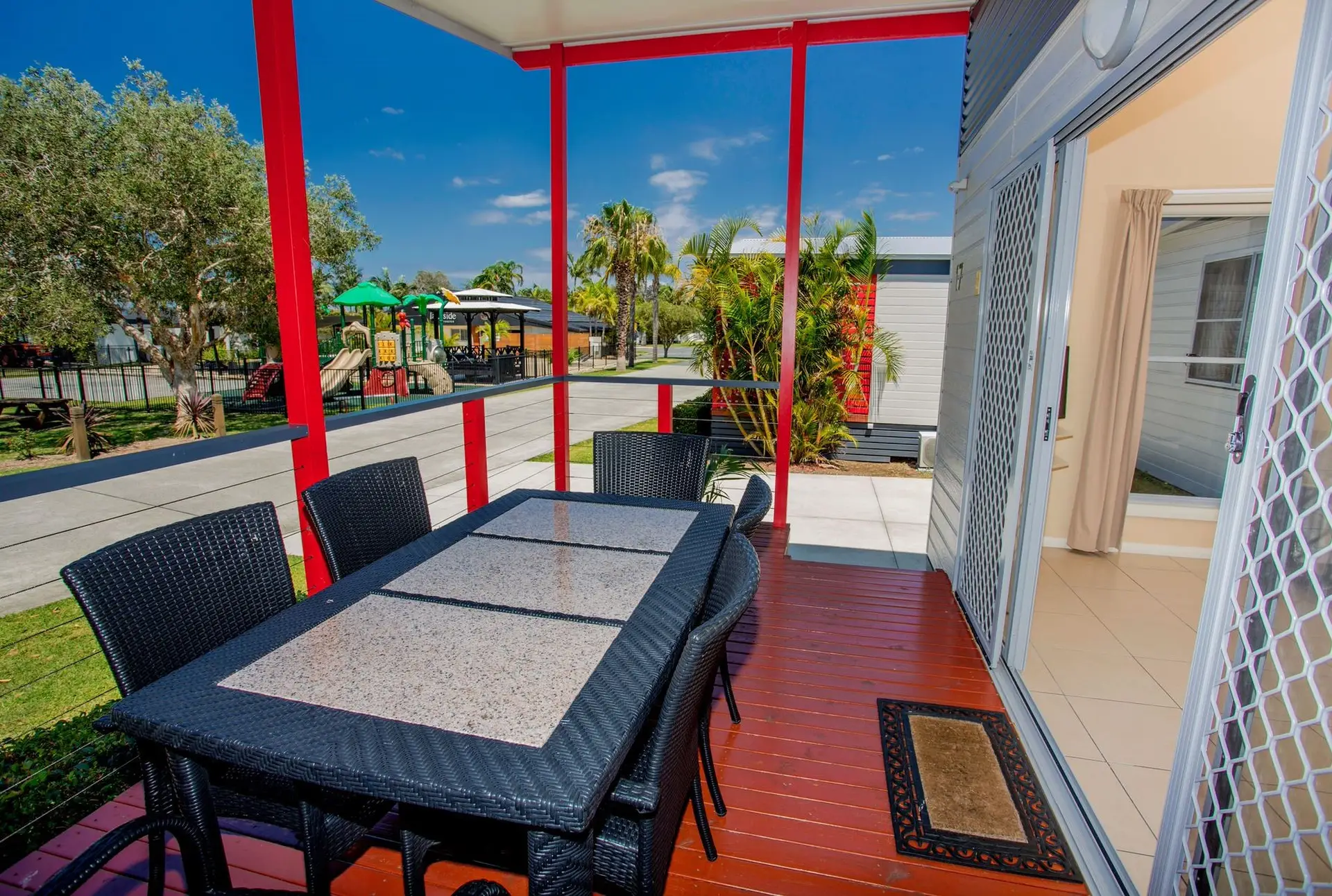 Positioned near the pool, this cabin sleeps five with one queen bed, one single bed and one bunk bed across two bedrooms. The kitchen includes a cooktop, microwave, dishwasher, and fridge. The living and dining areas open onto a private deck with a BBQ.