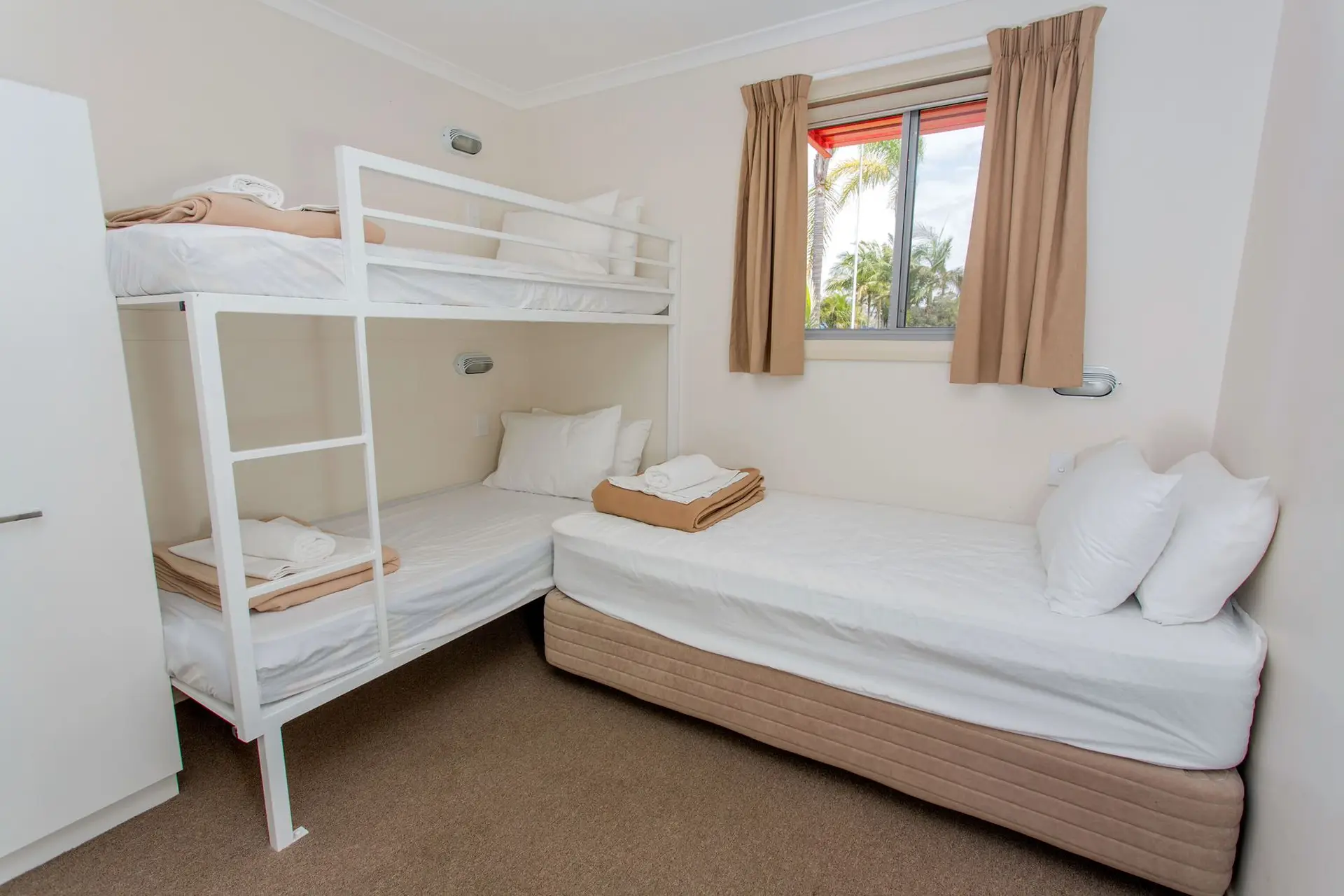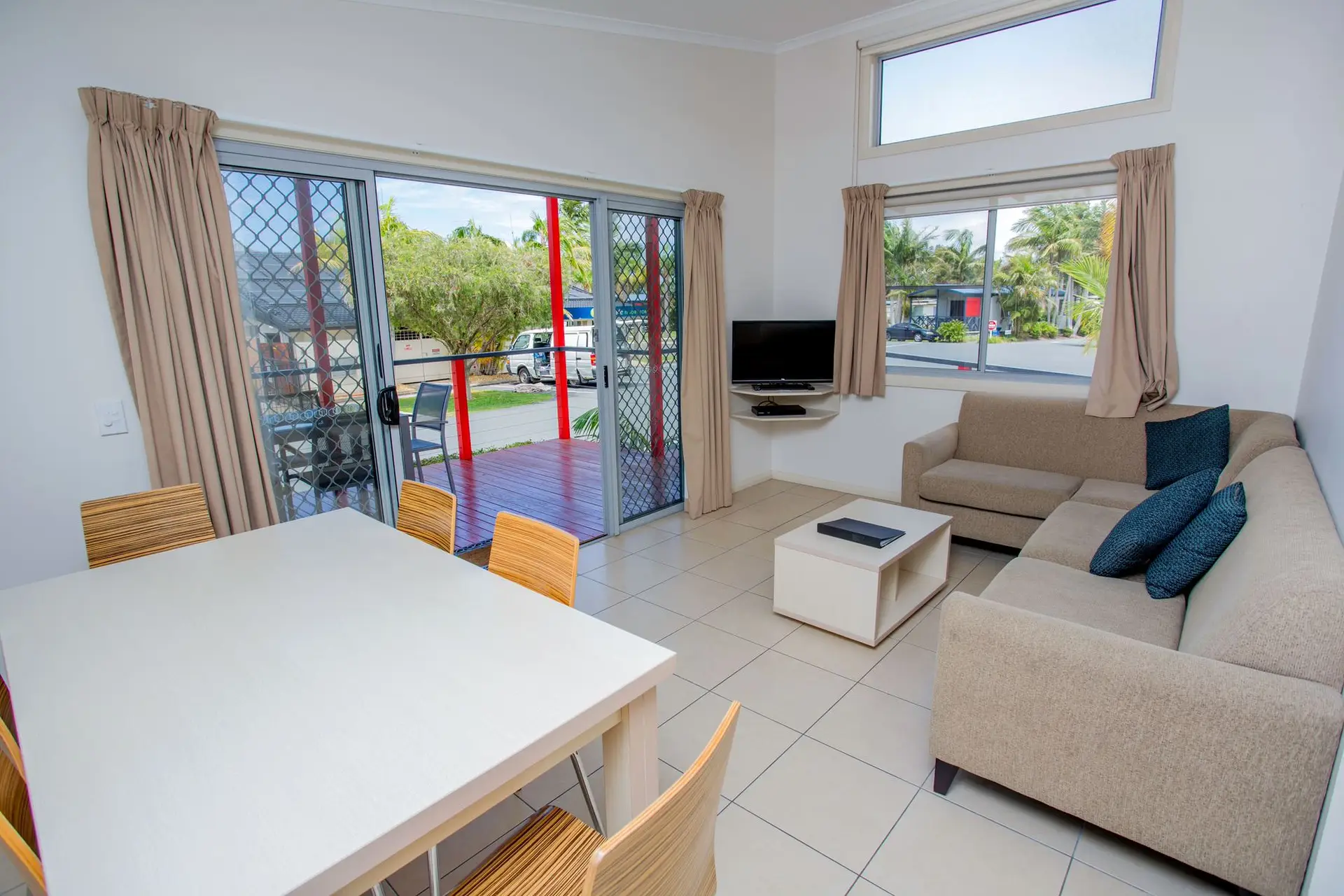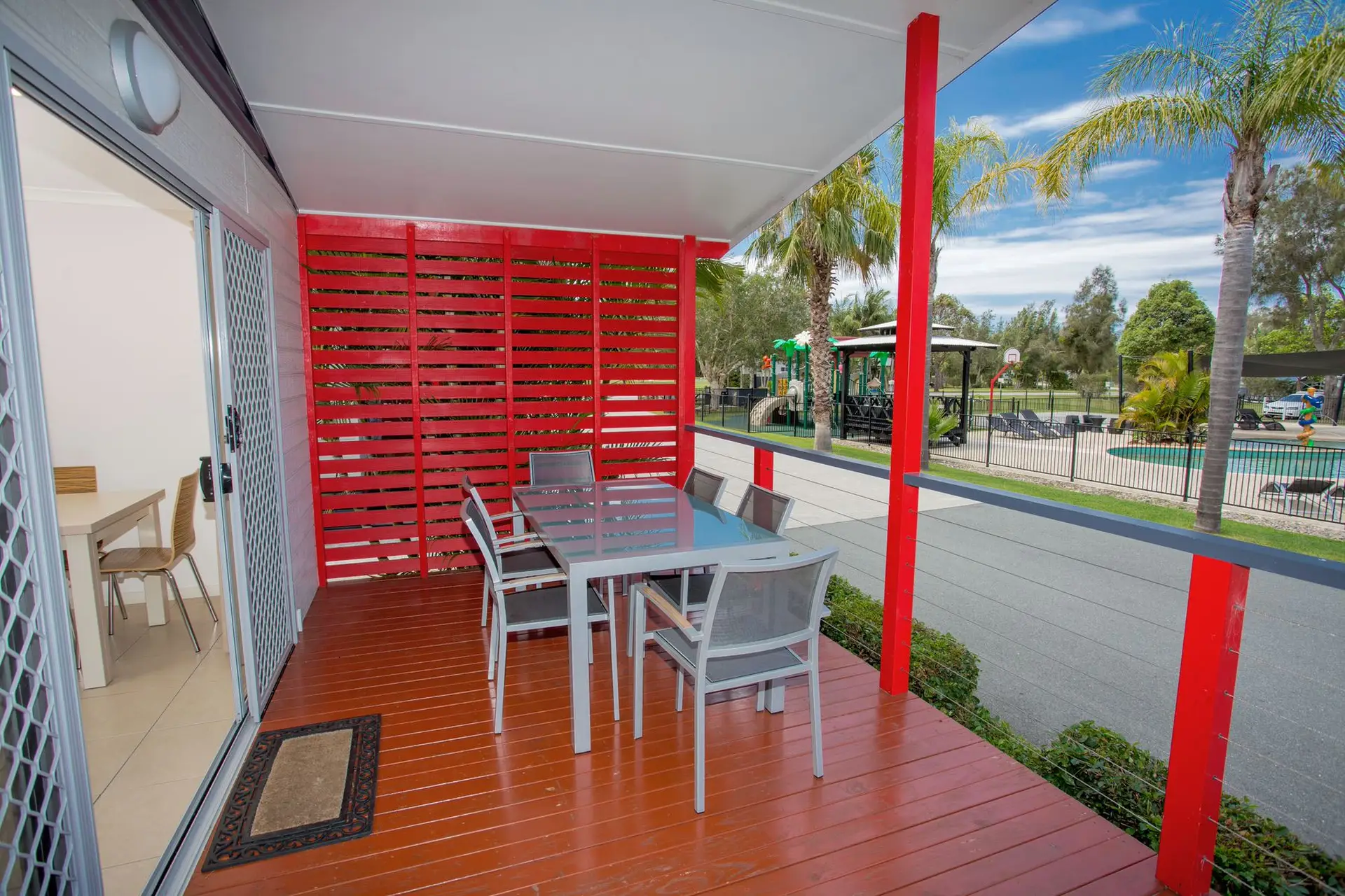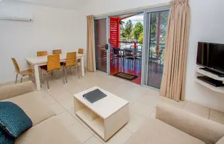 Enjoy stunning pool views from this thoughtfully designed, accessible villa that sleeps up to five guests across two bedrooms. The master bedroom features a queen bed, while the second bedroom includes a single bed and a bunk bed—ideal for families or small groups. The well-equipped kitchen offers a stovetop, microwave, dishwasher, and fridge. Step outside to a private deck with a BBQ, perfect for relaxing and taking in the serene poolside atmosphere.