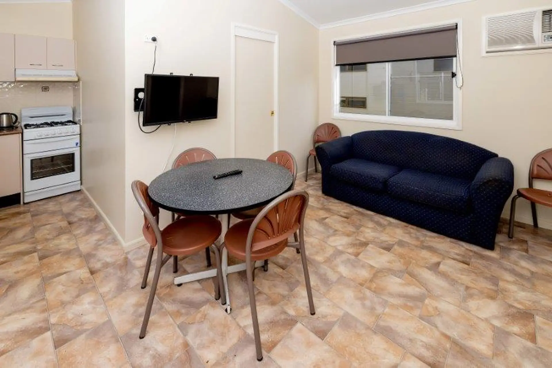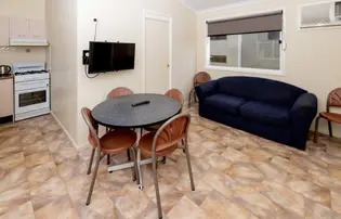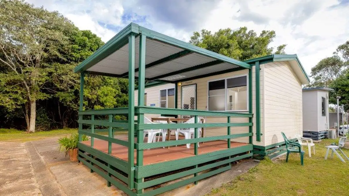 Ideal for budget-conscious families, this two-bedroom cabin comfortably sleeps up to six. It features a double bed in the main bedroom and two sets of single bunks in the second. A private bathroom adds convenience to your stay. The fully self-contained kitchen includes a gas oven, stovetop, microwave, and full-size fridge—everything you need for easy meals. Enjoy dining and downtime in the indoor area with a TV, or unwind outside on the private verandah. Air-conditioned and located near park facilities, it’s a great-value coastal escape.