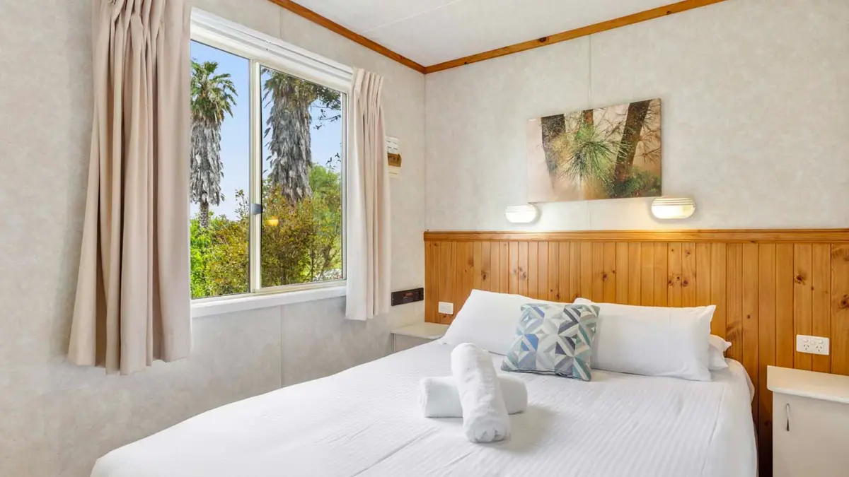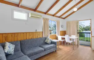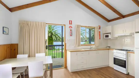Soak up sweeping river views in this two-bedroom spa villa, ideal for up to five guests. The master bedroom has a queen bed, while the second bedroom features a double bed with a single bunk overhead. A highlight is the corner spa bath, perfect for unwinding after a day out. Enjoy a full kitchen with gas oven, microwave, and fridge, plus air conditioning and a private deck with outdoor setting for al fresco dining.