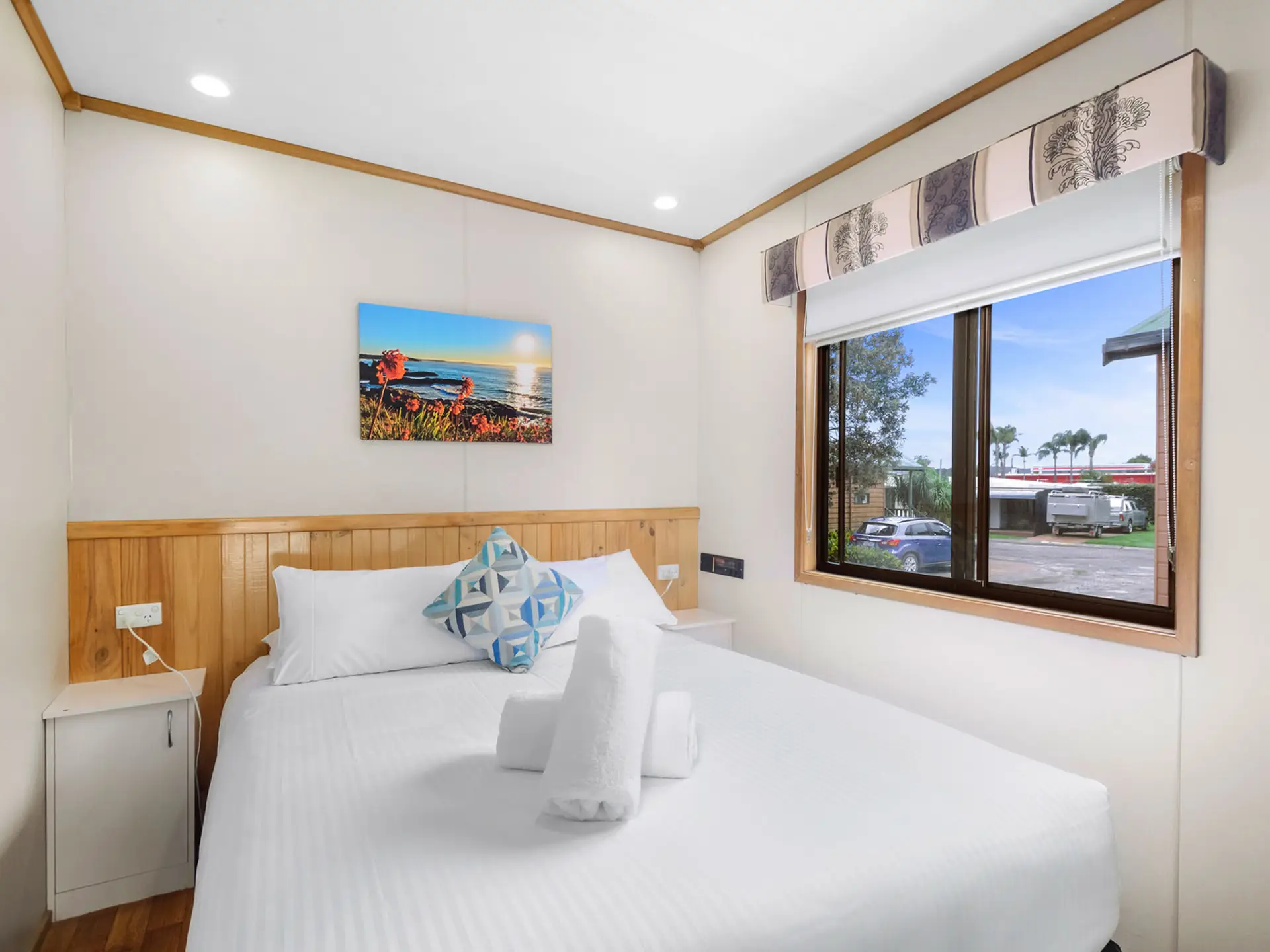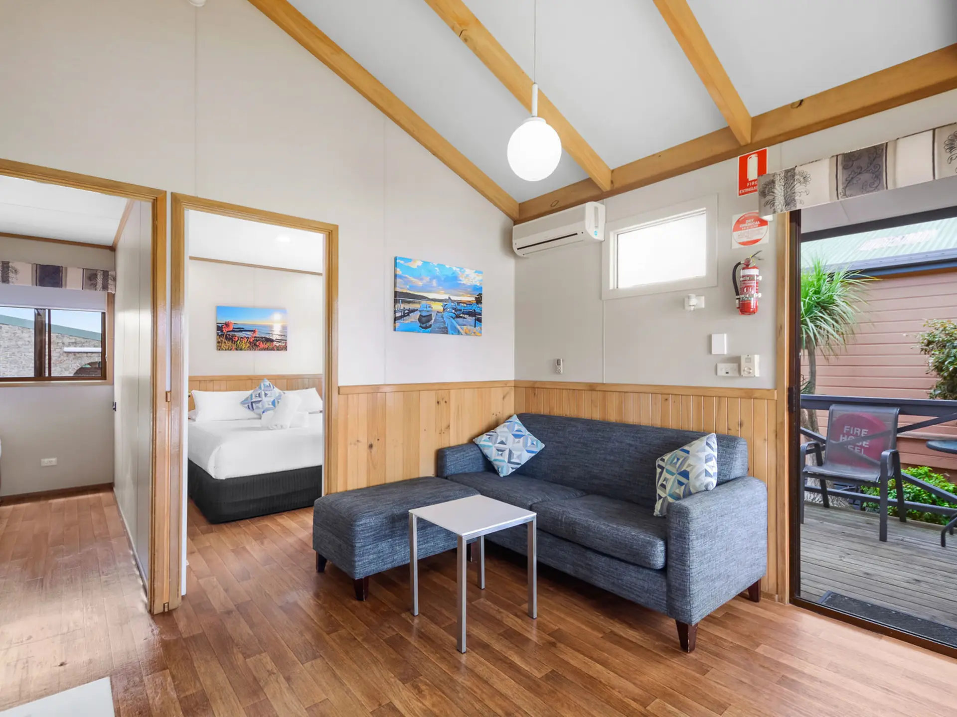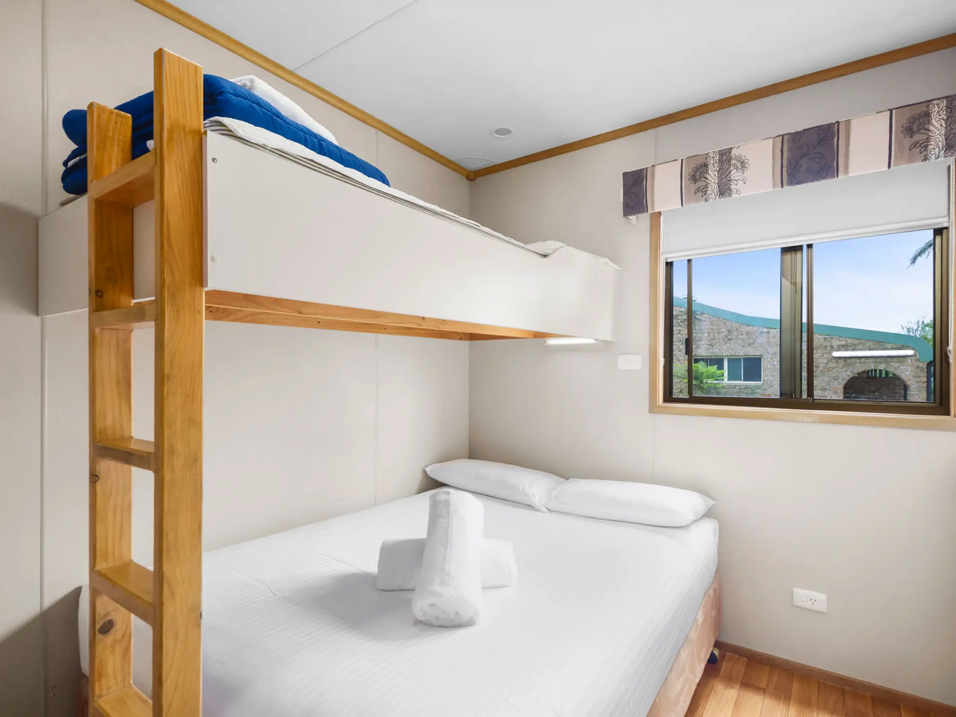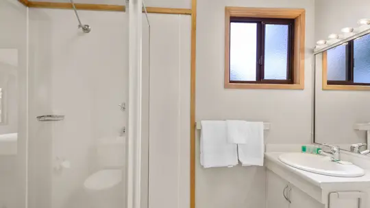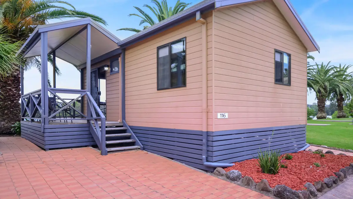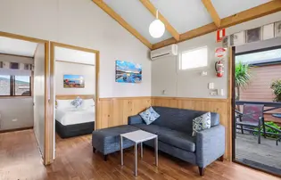 Enjoy uninterrupted river views in this elevated two-bedroom cabin, ideal for up to five guests. Featuring a queen bed in the main bedroom and a double bed with single bunk overhead in the second bedroom, it’s perfect for small families. The full kitchen includes a gas oven, microwave, and fridge, while air conditioning and ceiling fans ensure year-round comfort. A spacious private deck with outdoor setting invites you to relax and soak up the scenery.