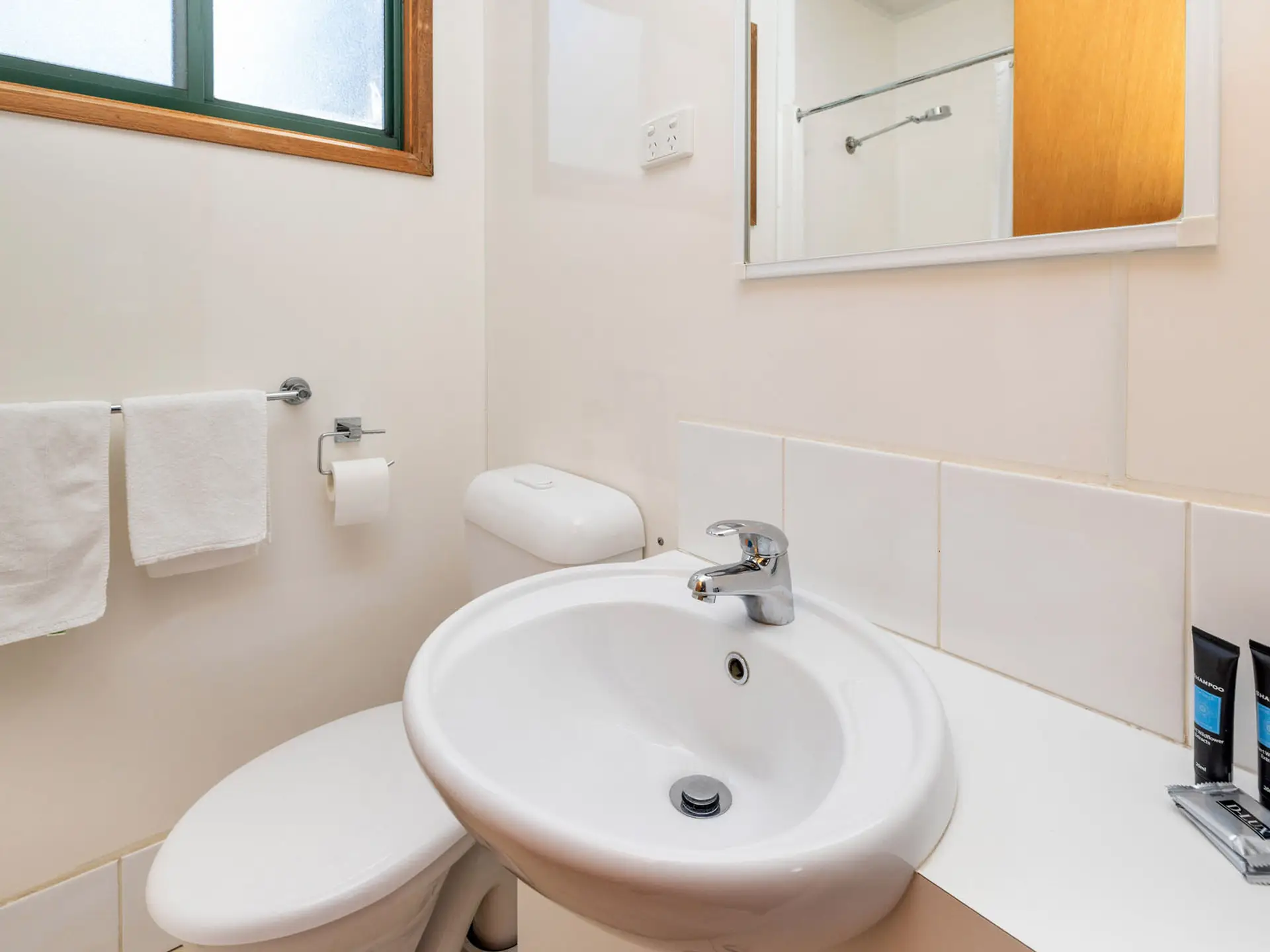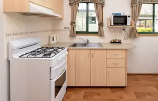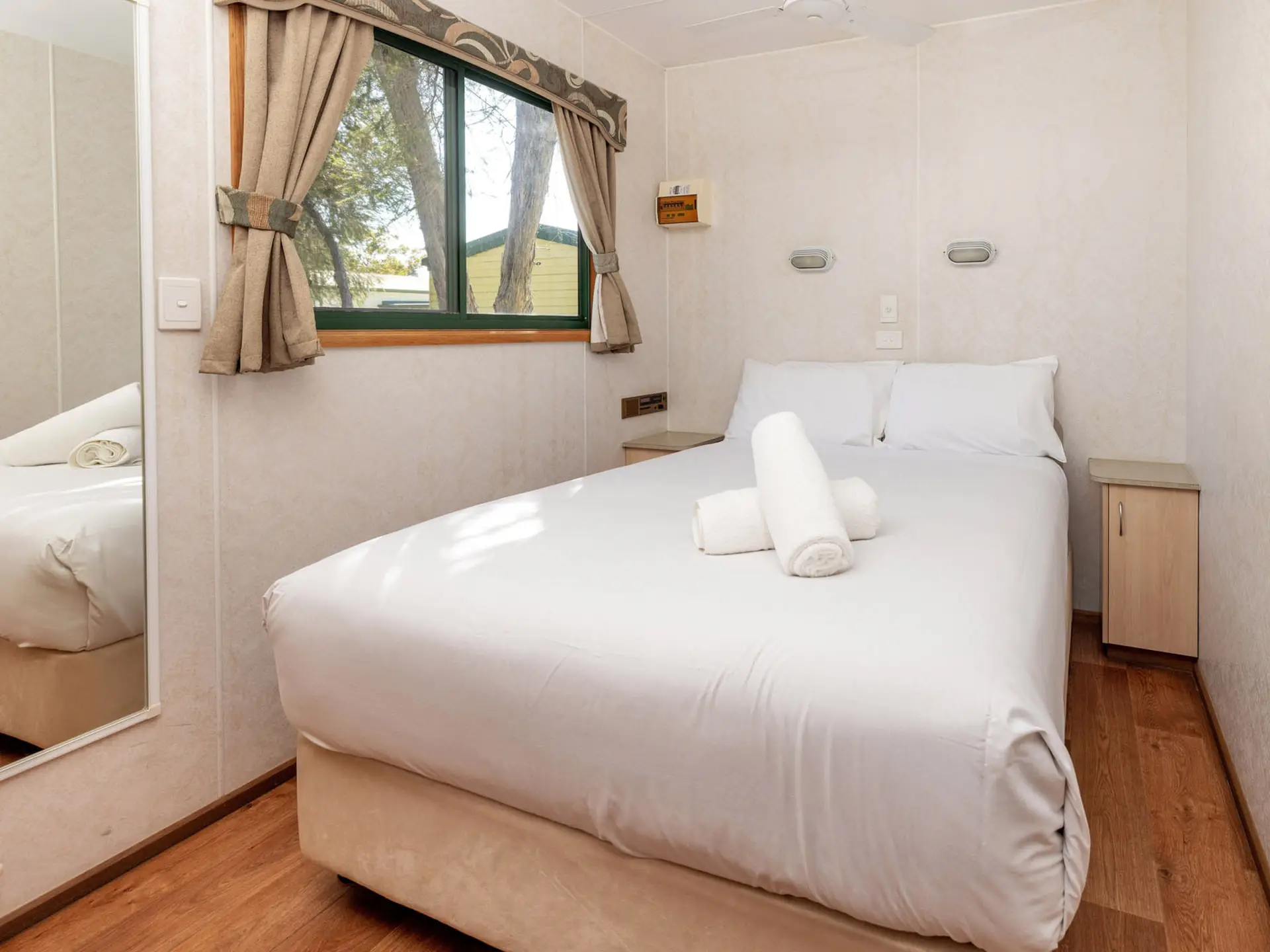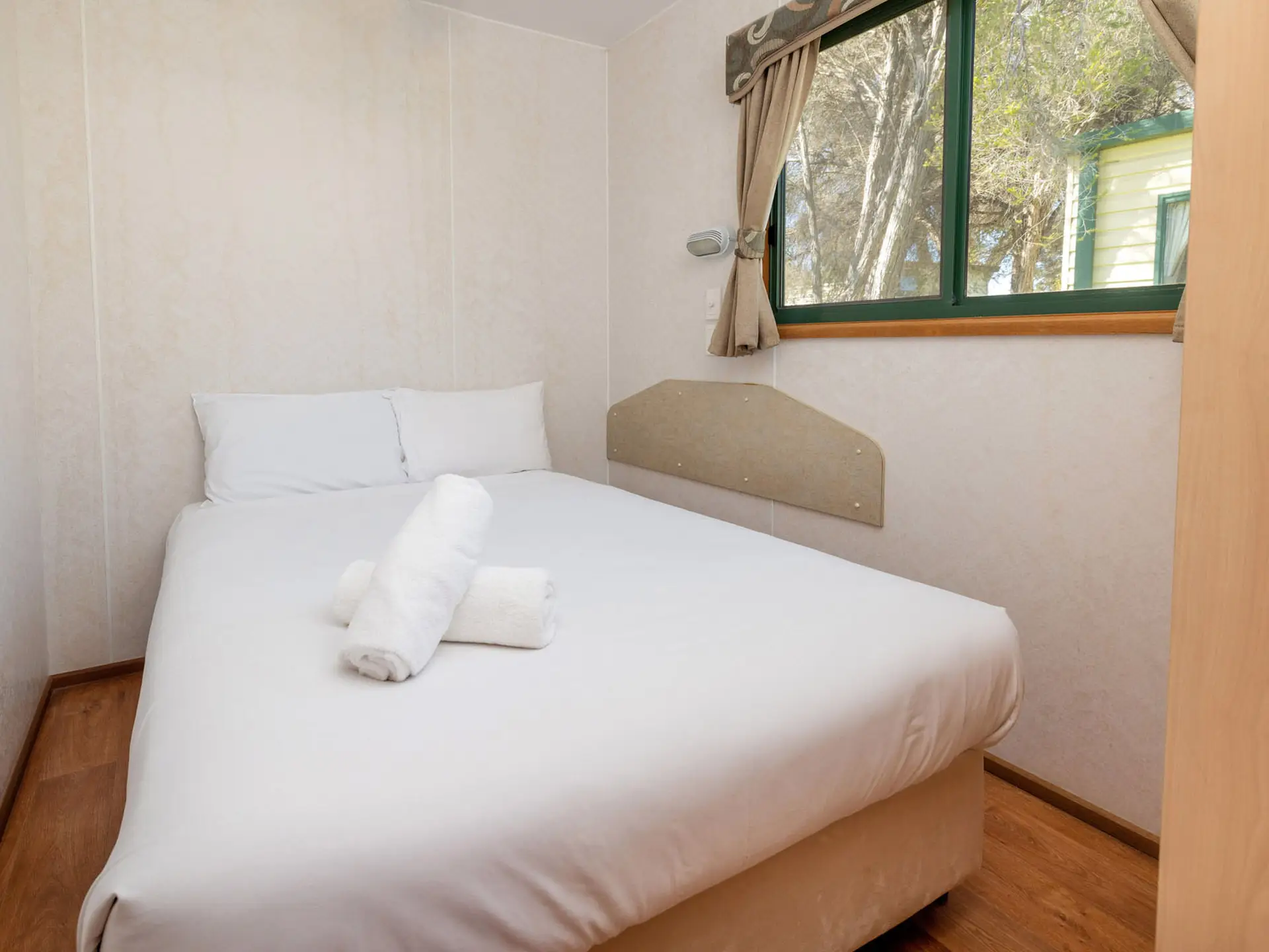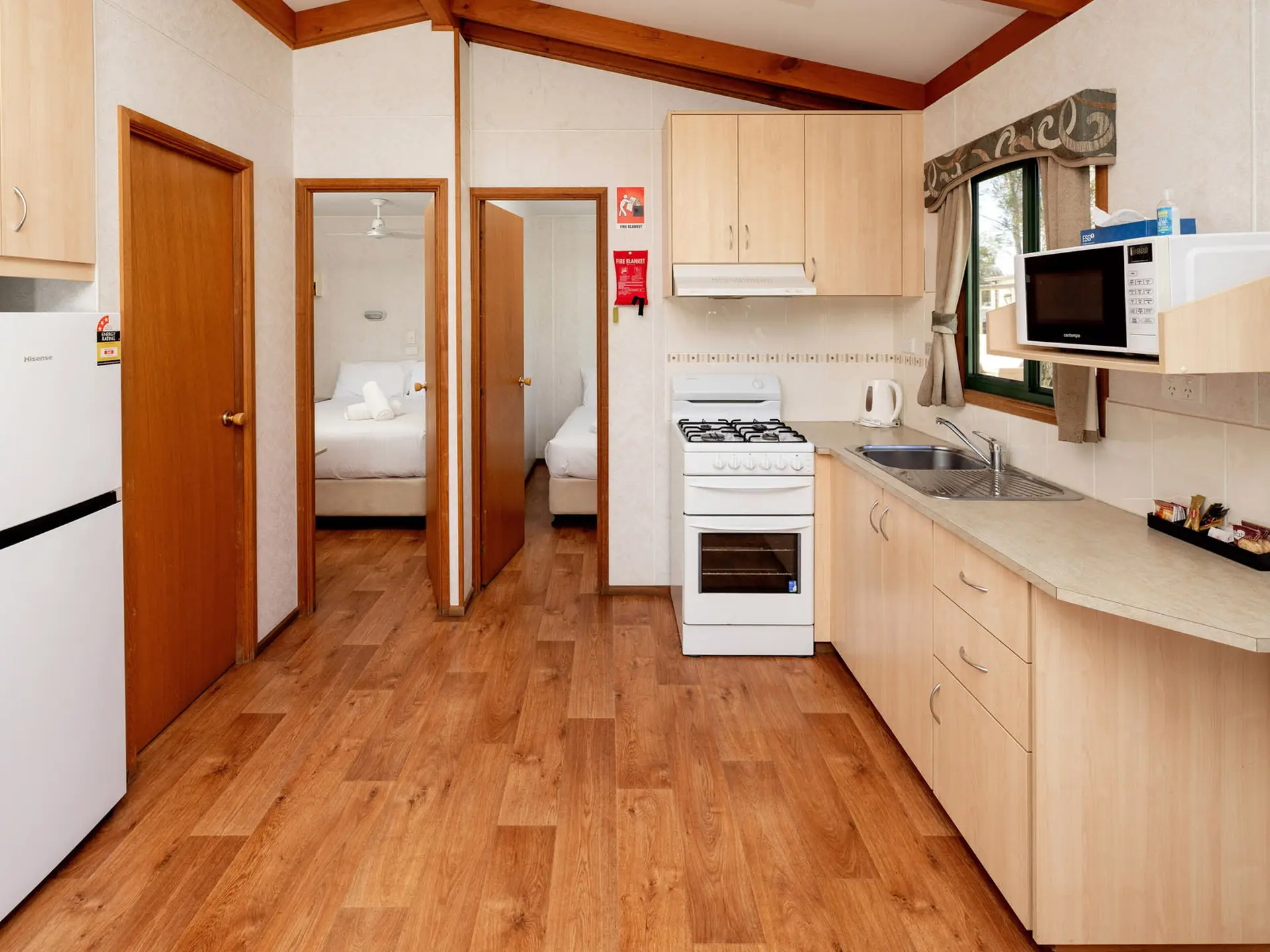 Ideal for families or two couples, this self-contained two-bedroom cabin comfortably sleeps up to five guests with two double beds and a sofa bed. It features a full kitchen, dining area, lounge with TV, and air conditioning, providing everything you need for a relaxing and convenient stay.