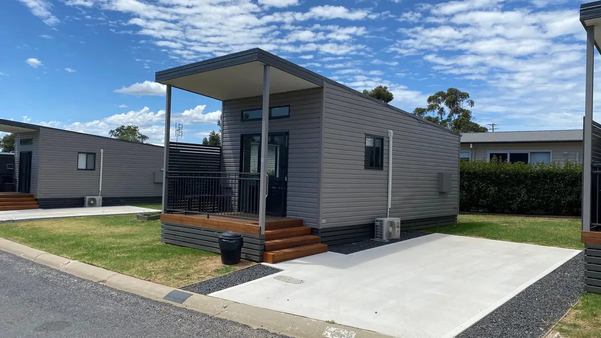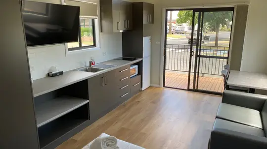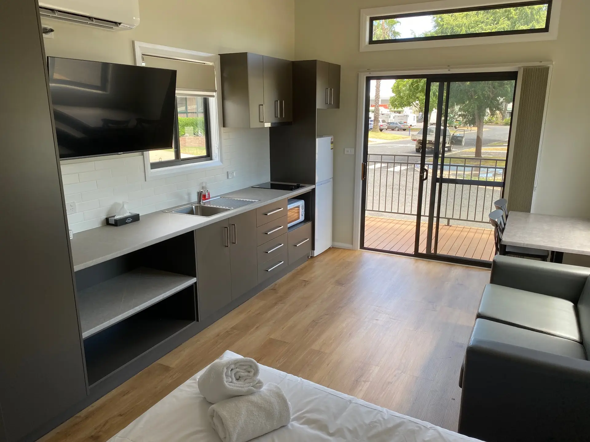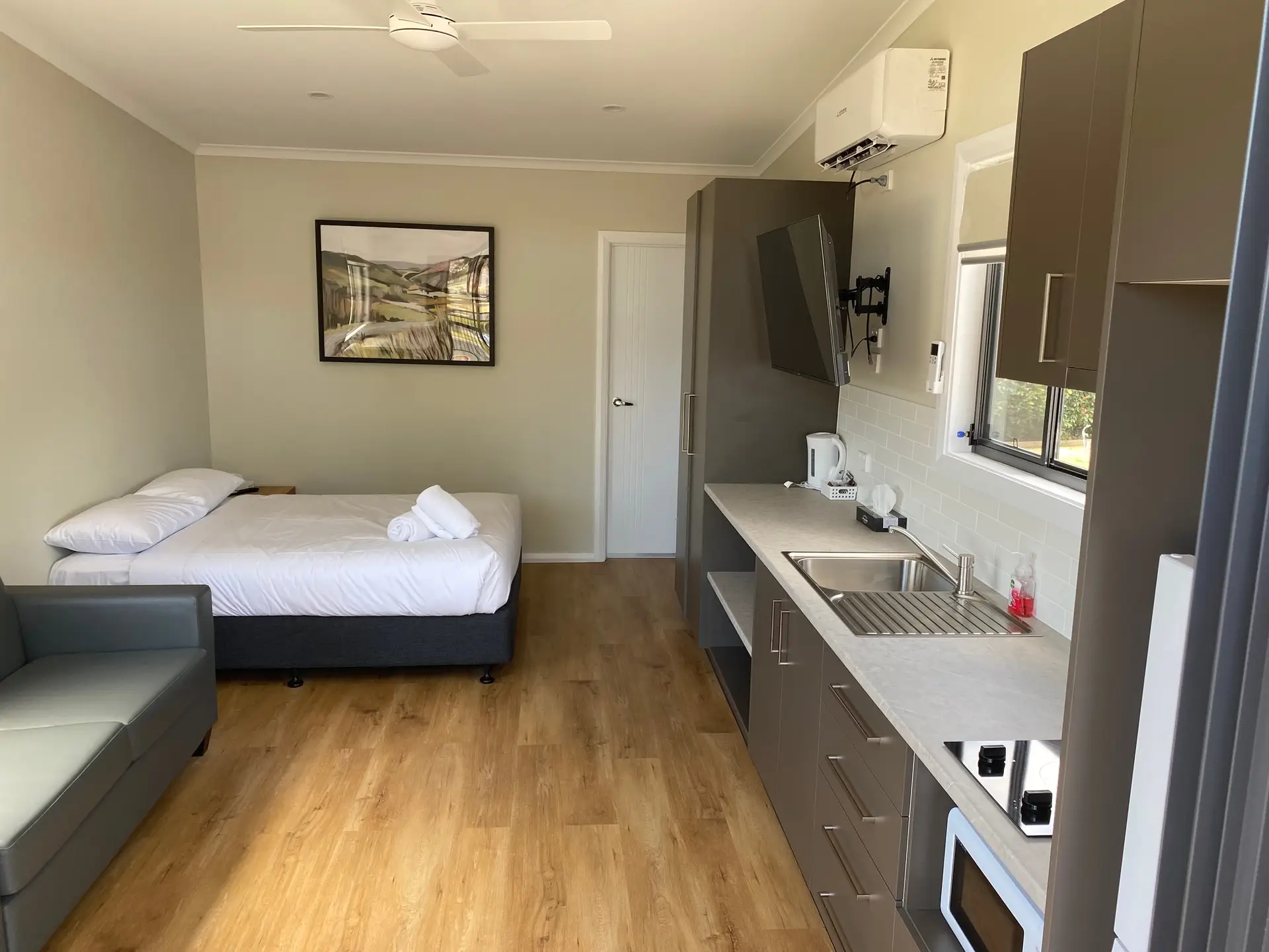 Our modern Deluxe Studios feature a double bed in the open plan living area, kitchenette with full sized fridge, cooktop and microwave, a small dining suite, sofa, separate ensuite at the rear and a private verandah with outdoor seating. These reverse cycle air-conditioned cabins are ideal for both singles and couples.