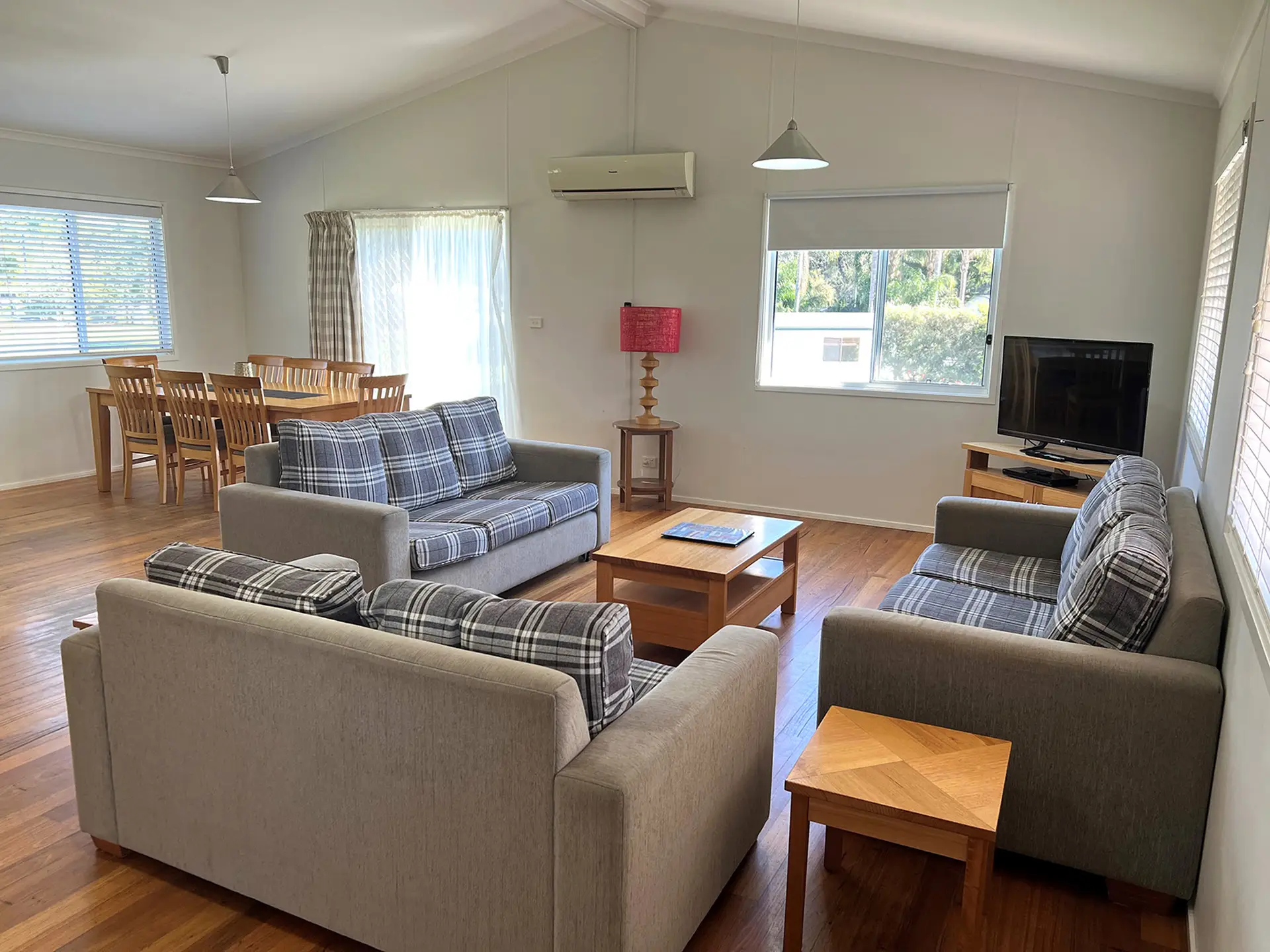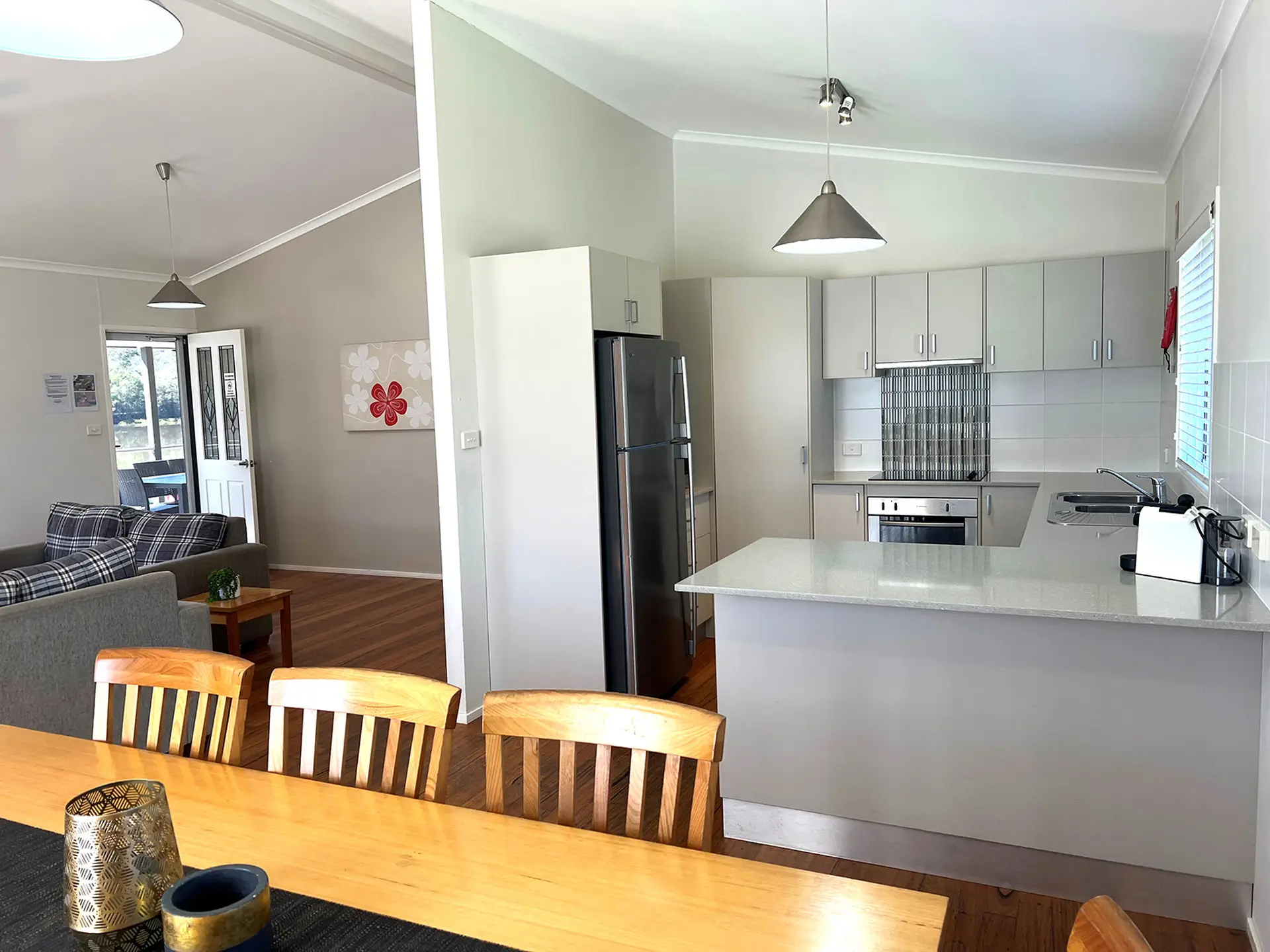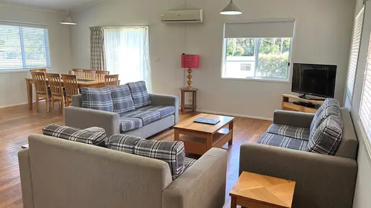This three-bedroom house sleeps up to eight with a king, queen and two sets of bunks. It includes two bathrooms, a full kitchen, laundry and open-plan living. The elevated timber deck with BBQ and river views makes it ideal for groups or families seeking extra space and privacy close to the water.