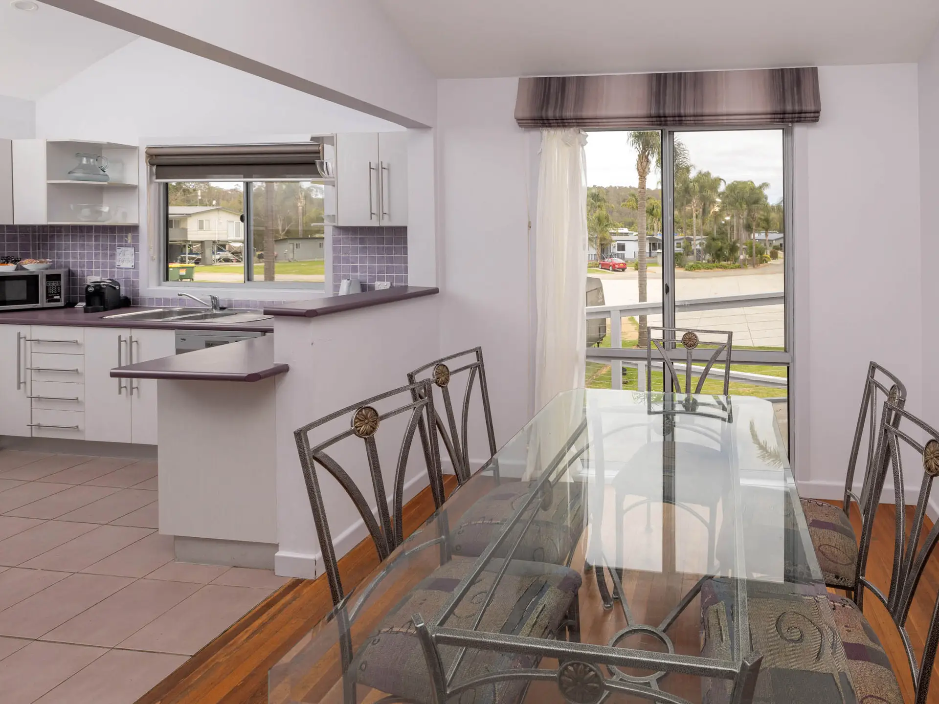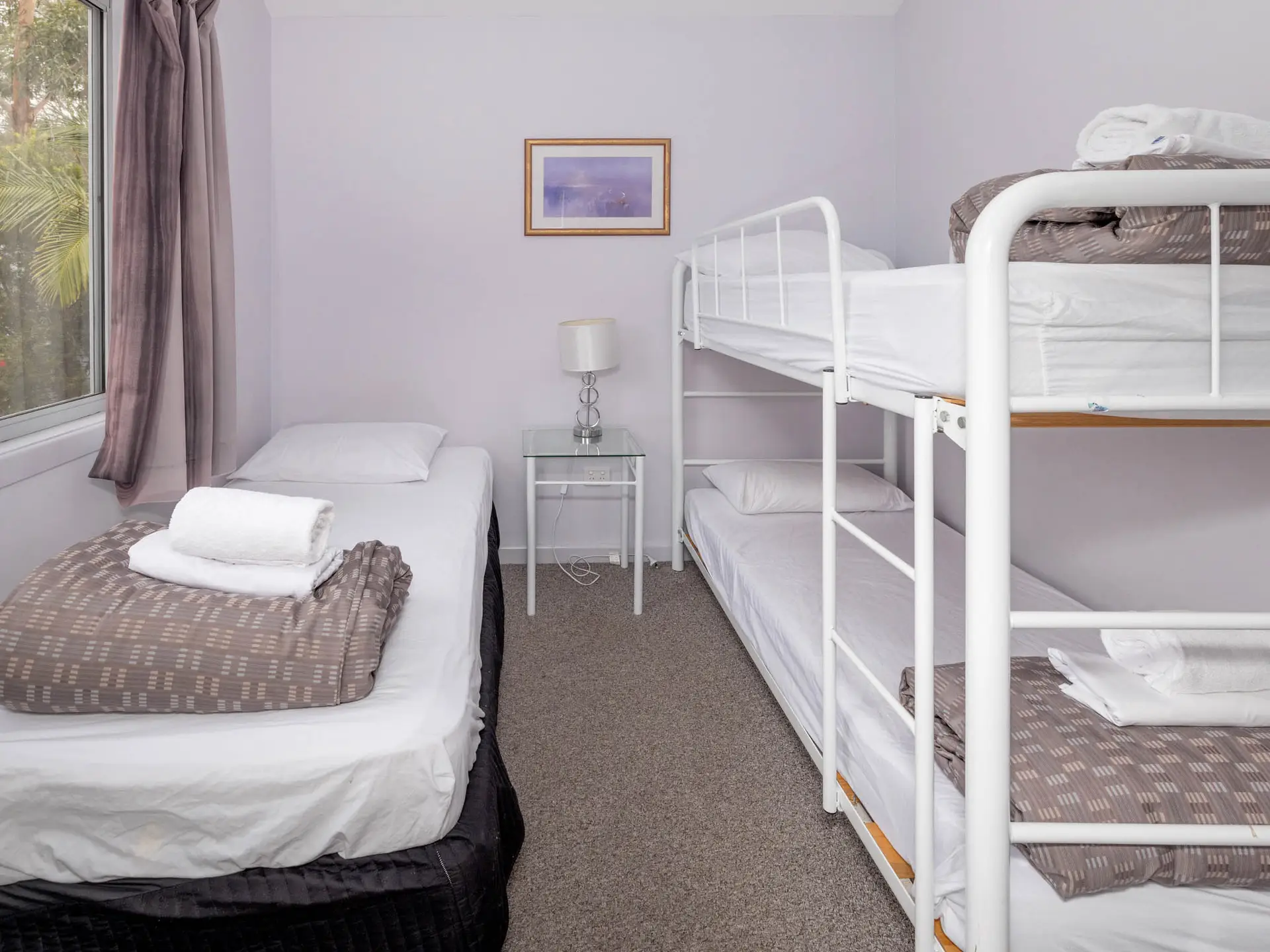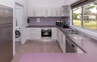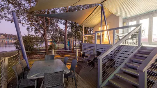 This spacious house sleeps up to seven guests across three bedrooms, with king, queen, single and bunk beds. It includes two bathrooms, full kitchen, laundry and open-plan living. Large glass doors open onto a private deck with BBQ, offering relaxing river views. Ideal for families or groups seeking a fully self-contained stay by the water.