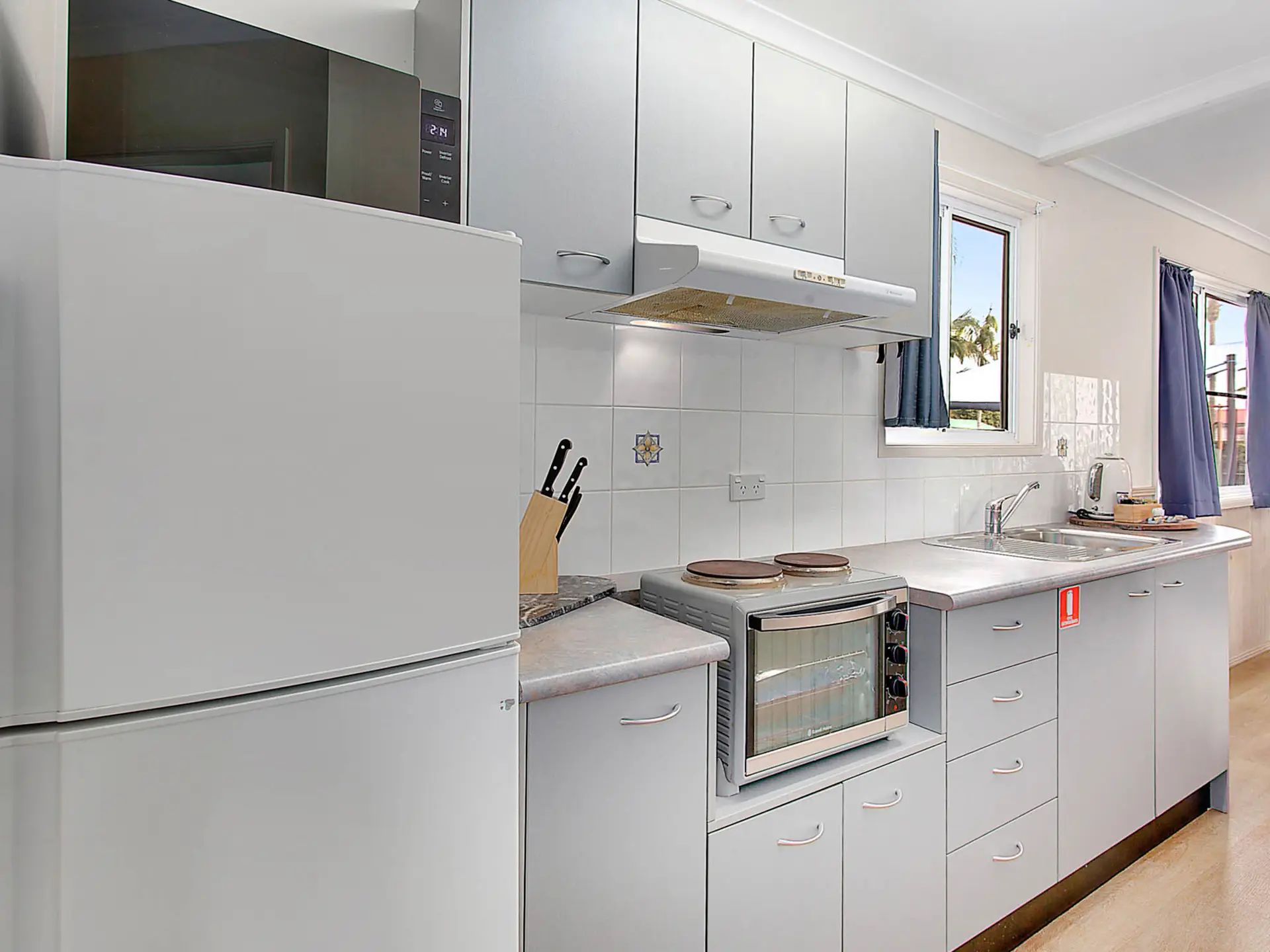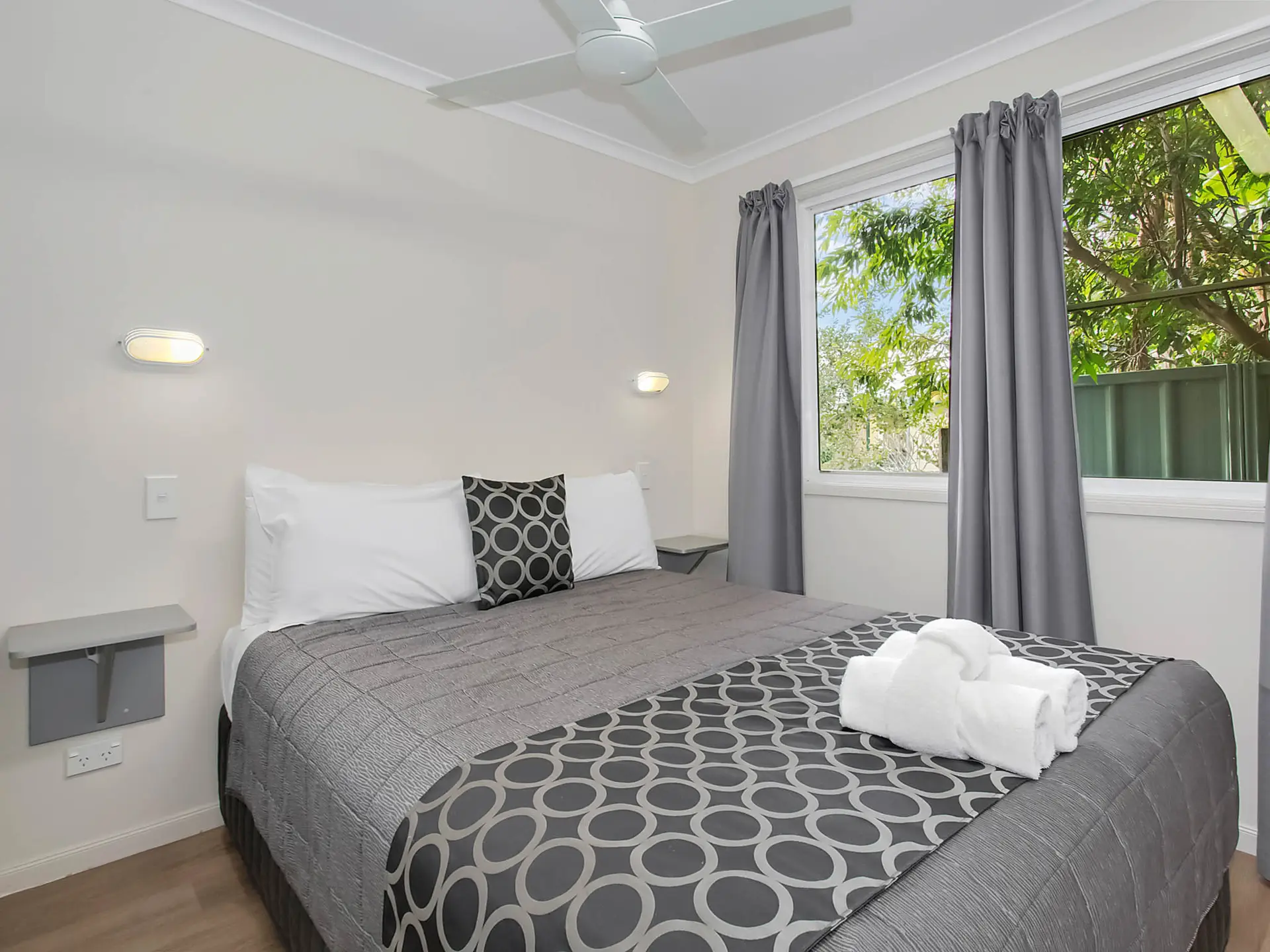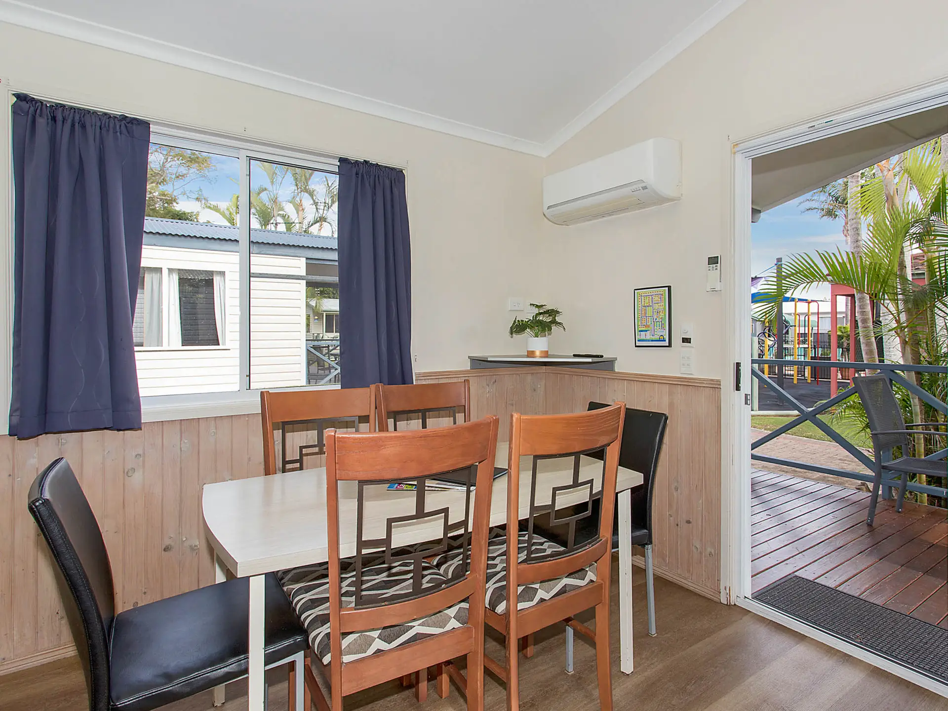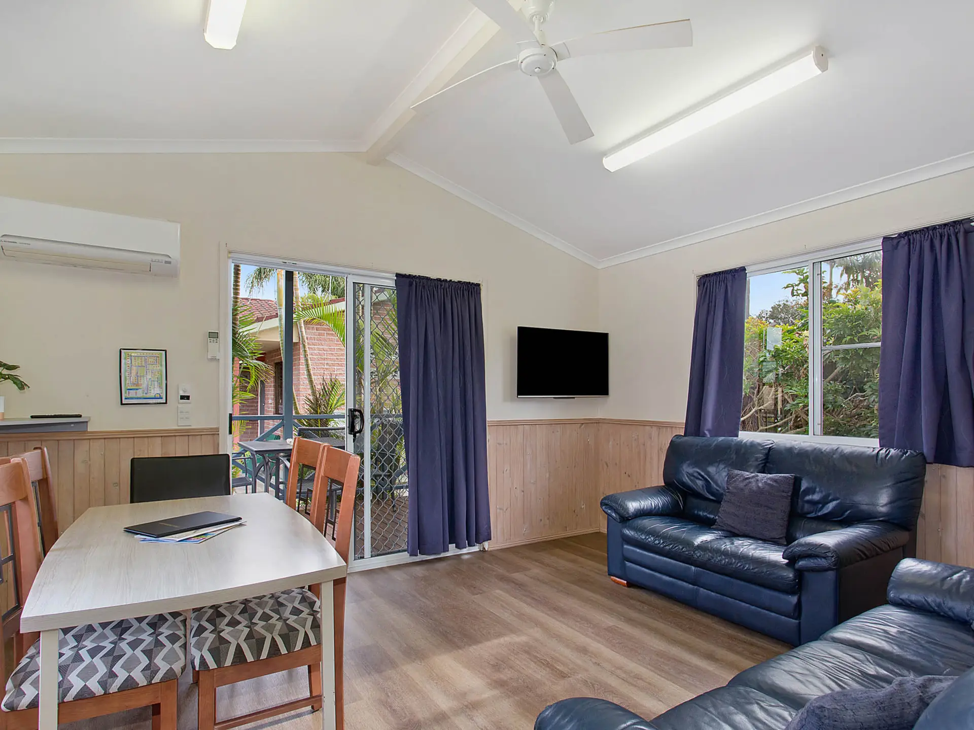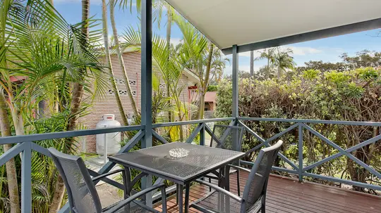 Located near the lagoon pool, this spacious two-bedroom villa sleeps up to six guests. It features a queen bed in the main bedroom and two sets of single bunks in the second. The self-contained kitchen includes an electric cooktop, microwave, and full-size fridge. With a dining area, TV, and air-conditioning, plus a private bathroom and large outdoor deck, it’s ideal for relaxed family stays.
