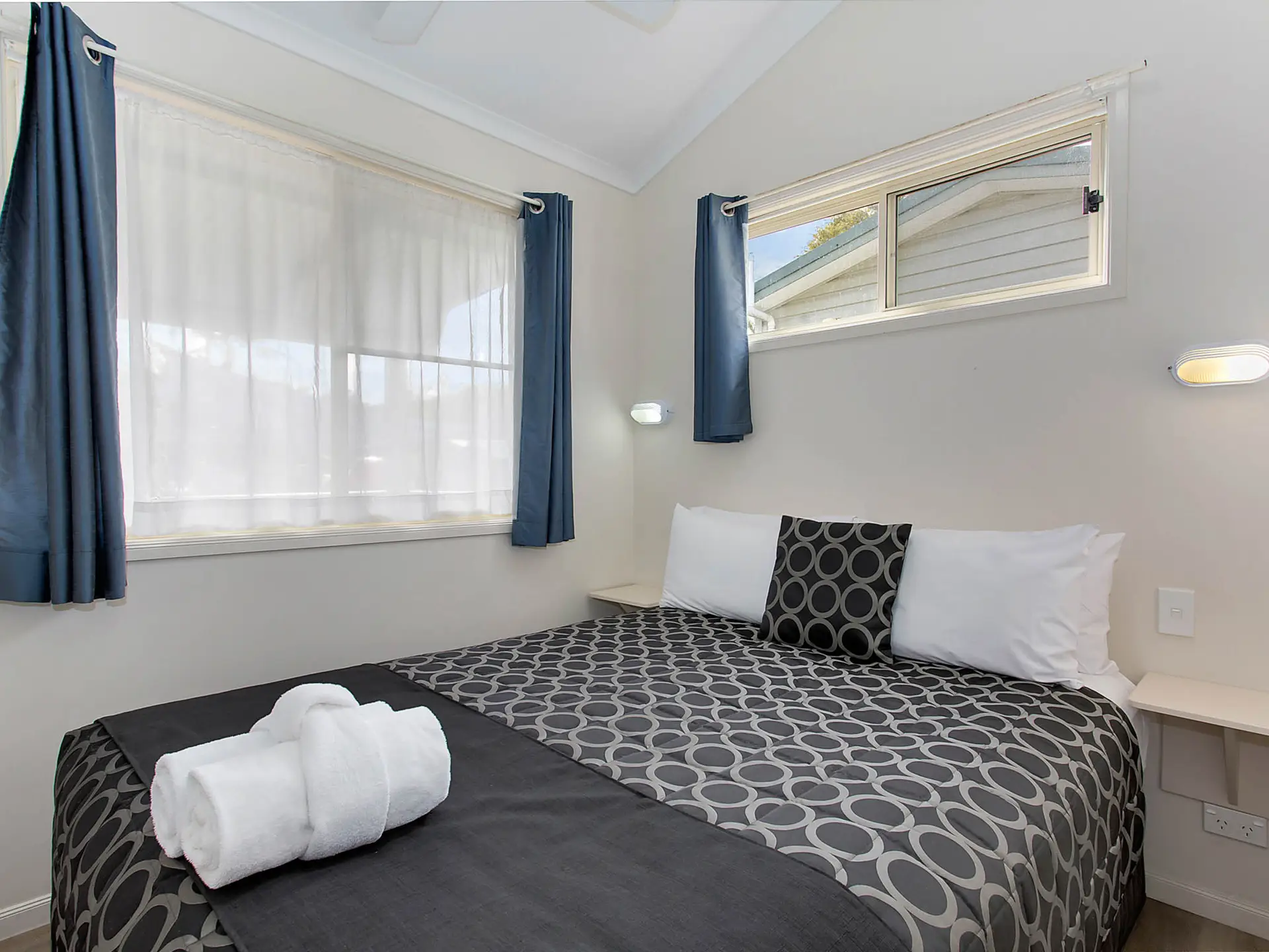 Situated just steps from the lagoon pool, this two-bedroom cabin sleeps up to five guests with a double bed in the main bedroom and a tri-bunk in the second. It features a full kitchen with electric cooktop, microwave, toaster, and full-size fridge. Inside you’ll find a dining area, TV, and air-conditioning, while outside a large balcony with seating invites you to unwind. Includes a private bathroom with all essentials.