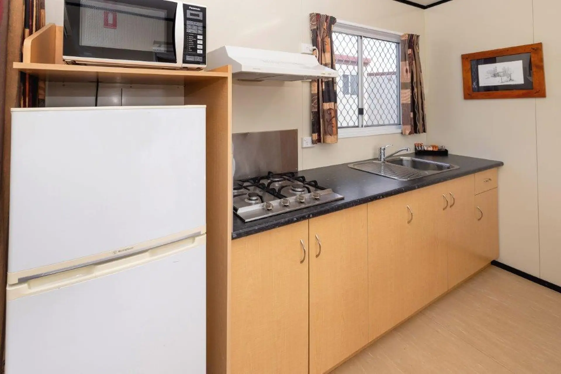 This pet-friendly studio sleeps up to six, with a queen bed and two single bunk sets in an open-plan layout—ideal for families travelling with pets. It includes a kitchenette with cooktop, microwave, and fridge, along with air conditioning and a TV. Enjoy time outside on the private patio with outdoor seating.