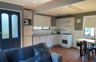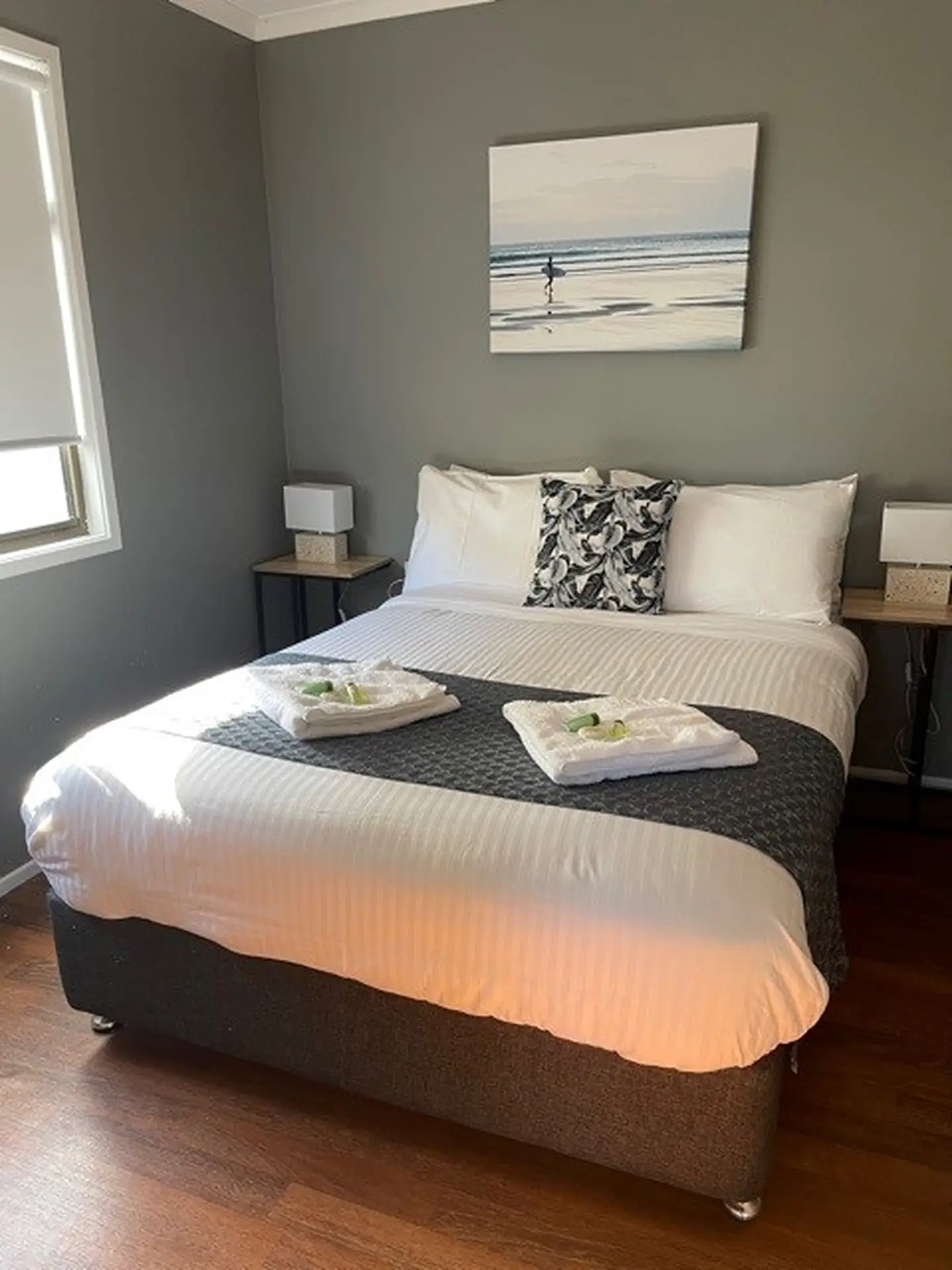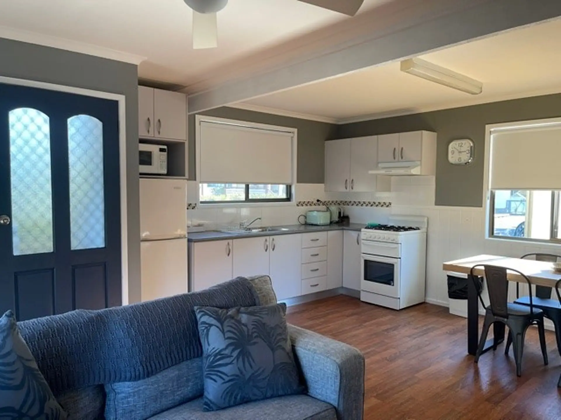Perfect for families, this standard two-bedroom cabin sleeps up to four guests with a queen bed and bunk bed. Enjoy the convenience of a full kitchen with gas oven, private ensuite, dining area, TV, and reverse-cycle air conditioning—all within easy reach of park facilities and the beach.