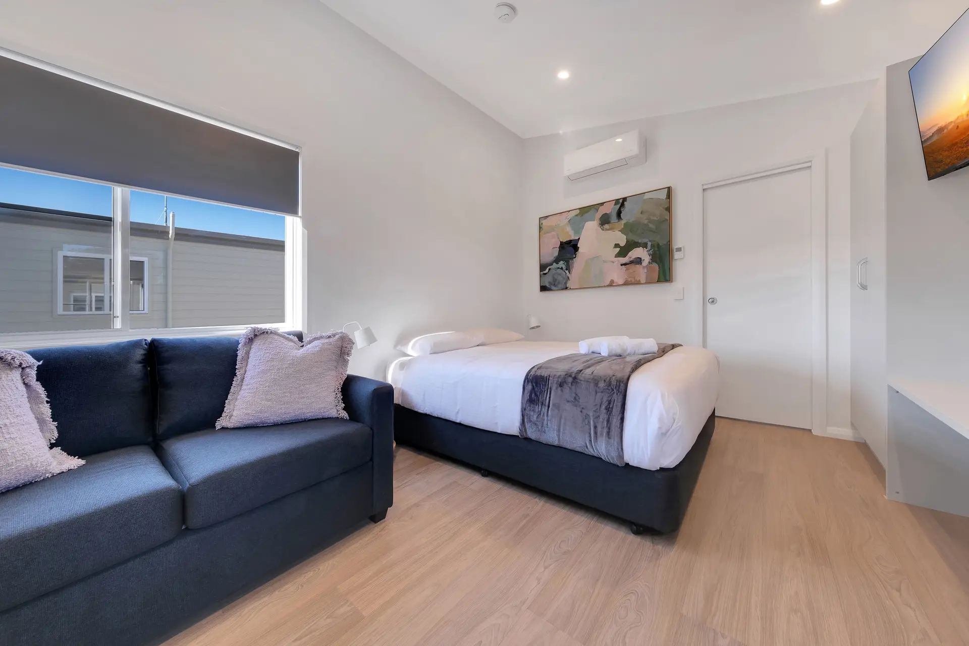 Unwind in this cosy studio, ideal for two guests. Featuring a comfortable double bed and private bathroom, it includes a well-equipped kitchenette with an electric cooktop, microwave, toaster, and bar fridge. Air-conditioning ensures comfort year-round. Step out onto your private patio, furnished with a table, chairs, and two barstools, the perfect spot for an afternoon drink while overlooking the city.
