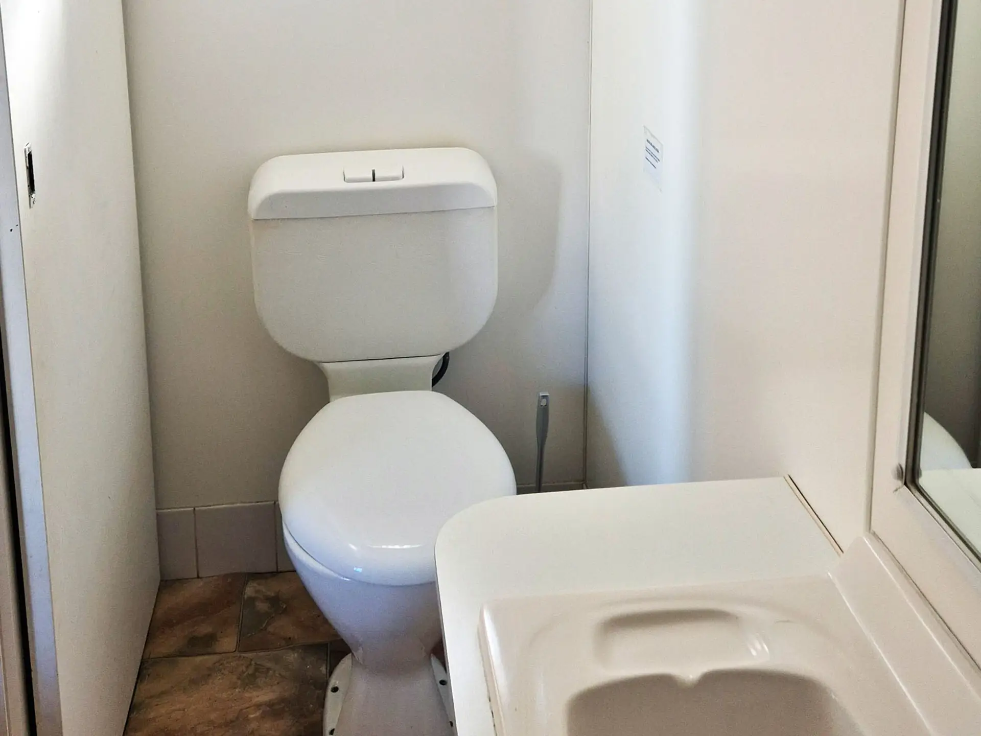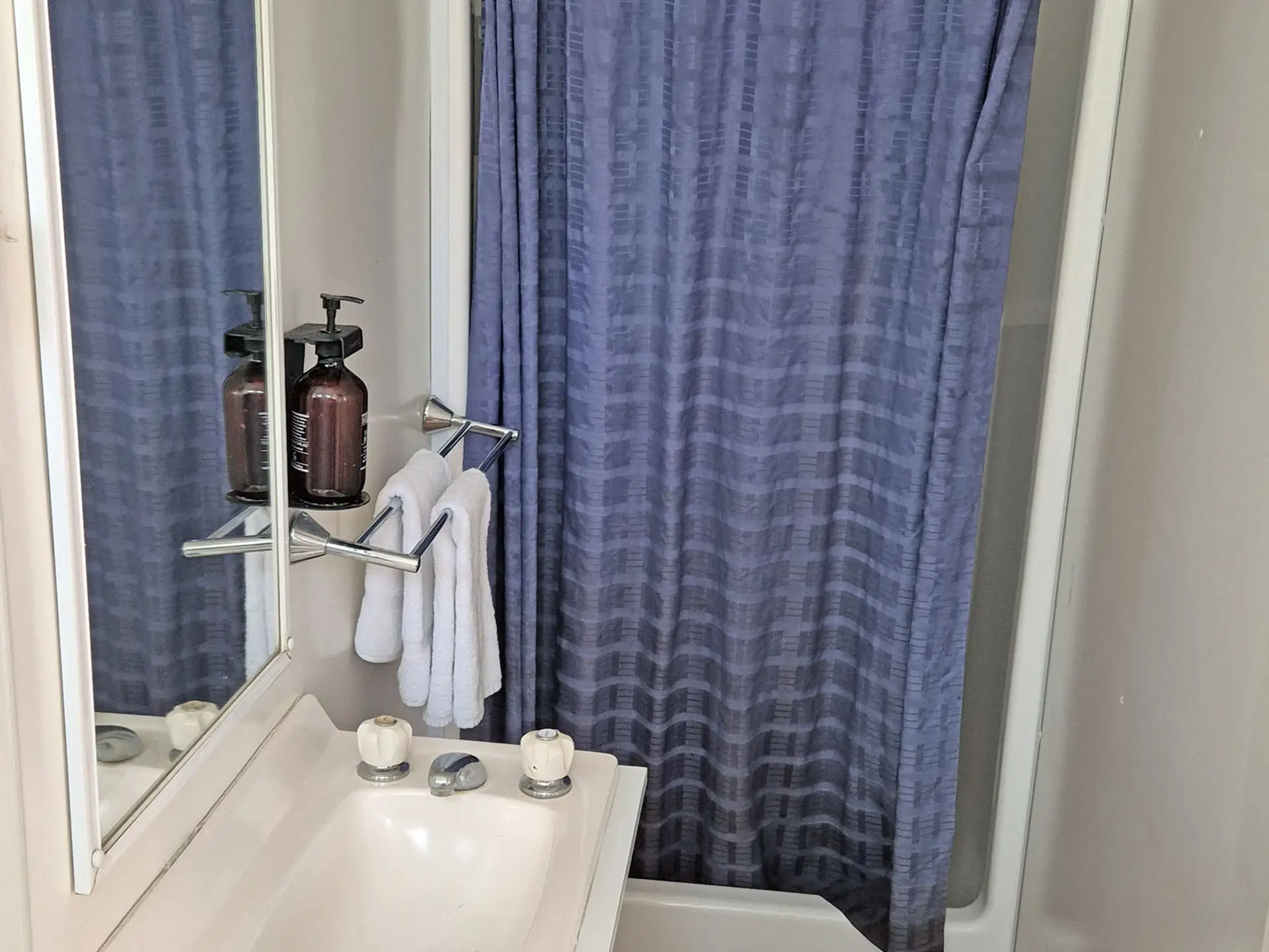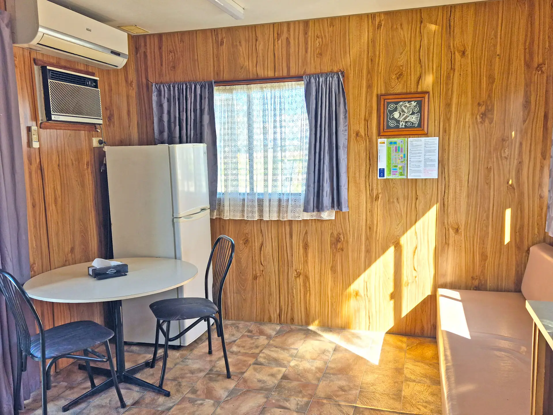 This studio sleeps up to two guests with a queen bed and includes a private bathroom. The kitchenette is equipped with an electric cooktop, microwave, toaster, and full-size fridge, making it easy to prepare simple meals. Air-conditioning, a TV, and a dining area offer a comfortable and practical space for short or extended stays.