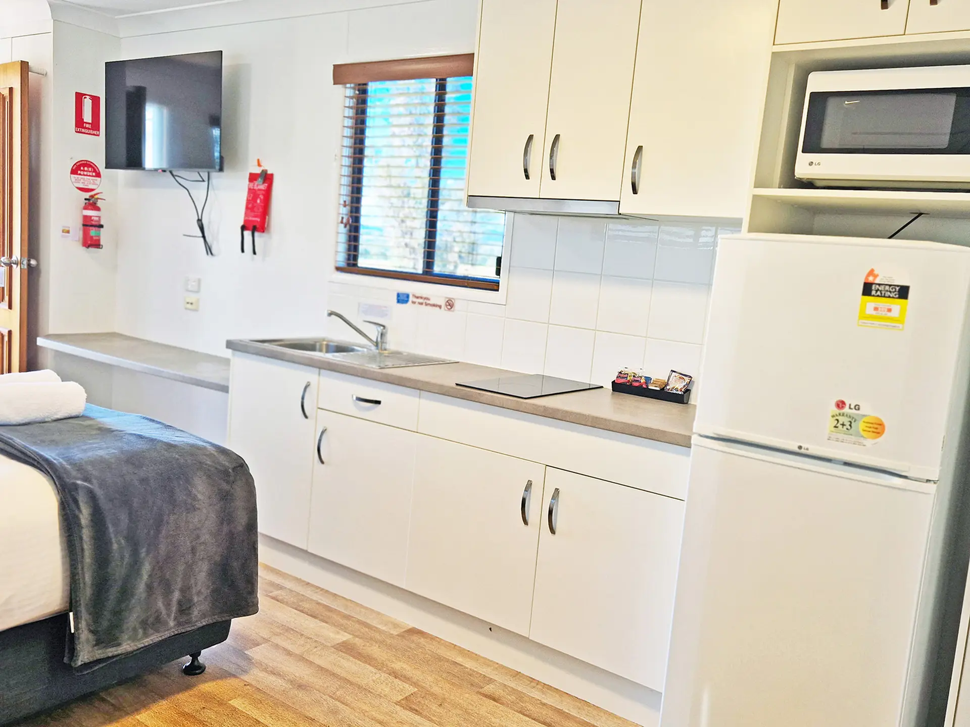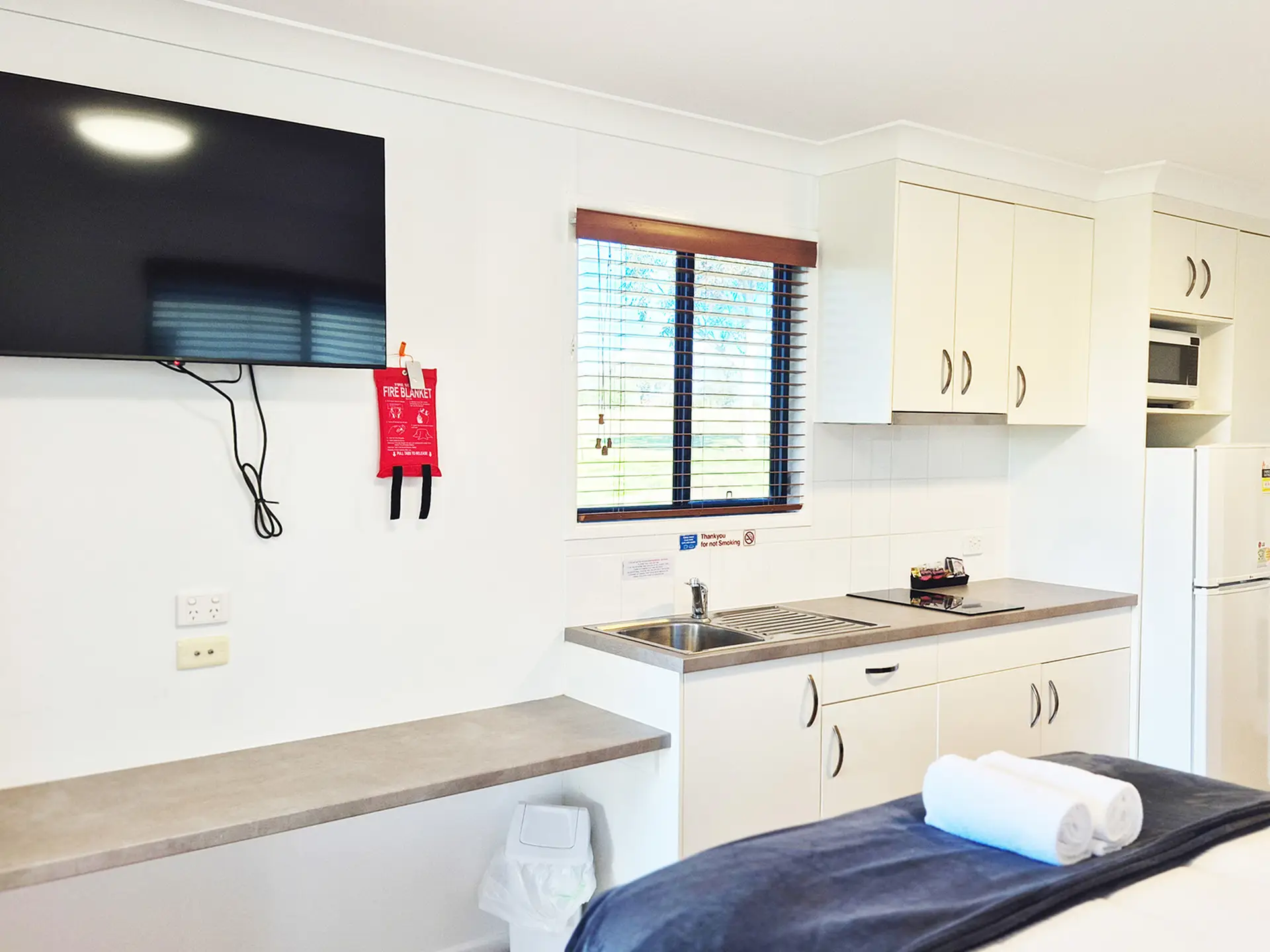 This open-plan studio sleeps up to two guests with a queen bed, private bathroom, and reverse cycle air-conditioning. The kitchenette is equipped with an electric cooktop, microwave, toaster, and full-size fridge. Relax indoors with a TV or step outside to enjoy the mountain views from the front patio with outdoor seating.