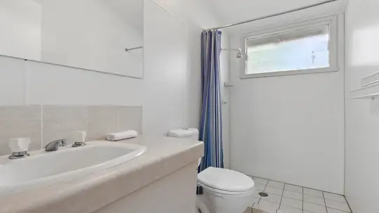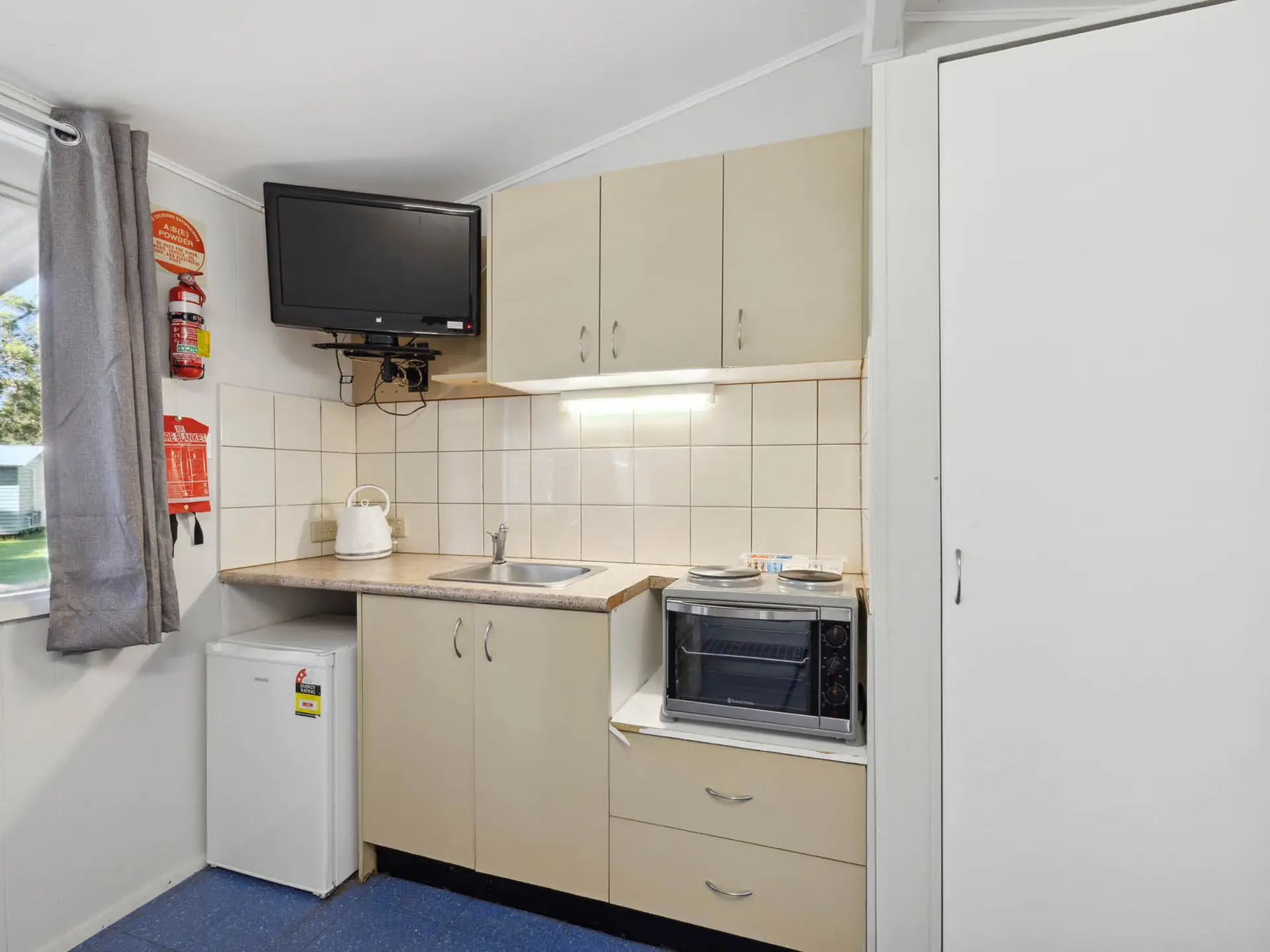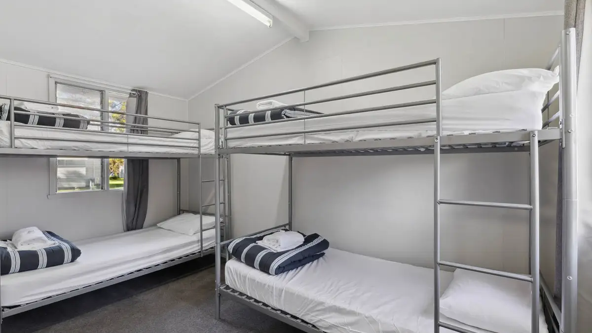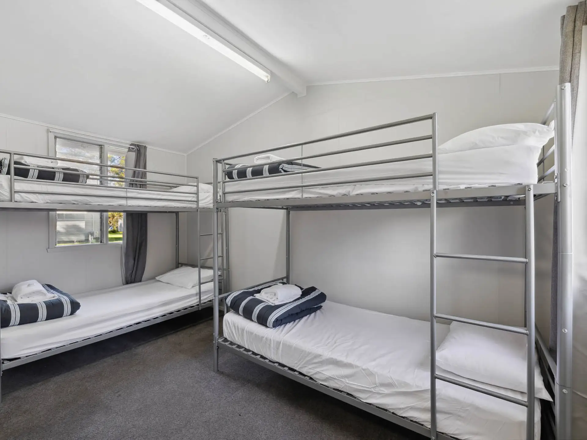 A practical option for travellers, this cabin sleeps up to six guests with a double bed in the main area and two sets of single bunk beds in a separate room. The interior features a compact kitchenette with a bar fridge, microwave, toaster and kettle. Enjoy casual meals at the dining table or relax in front of the TV. Step outside onto the private deck for a peaceful moment after a day exploring the nearby beach and reserve.