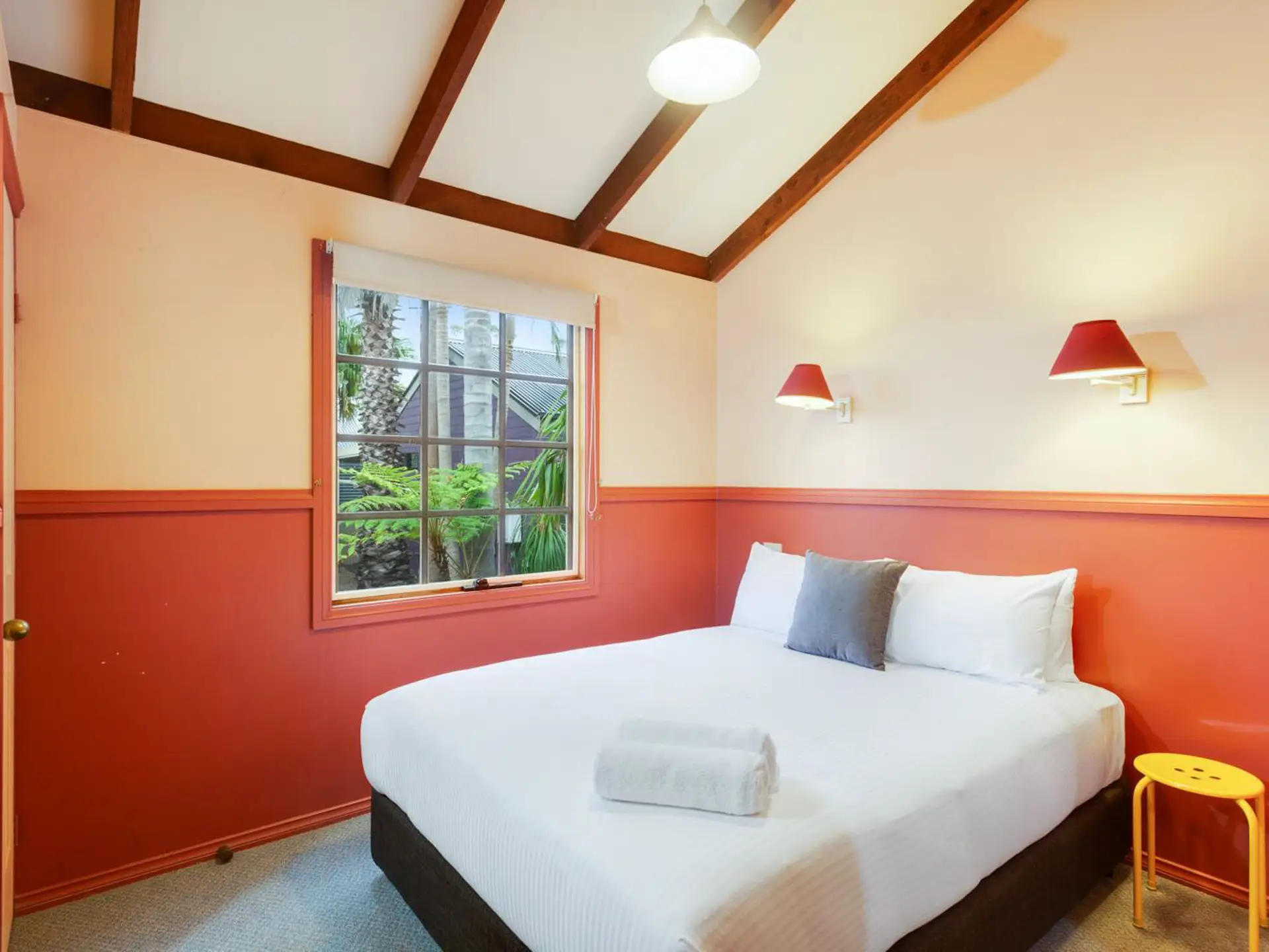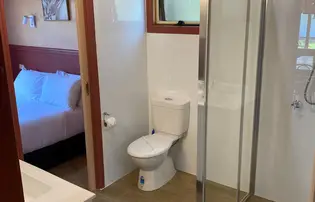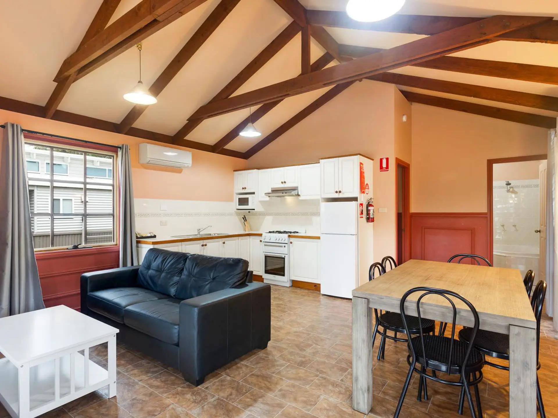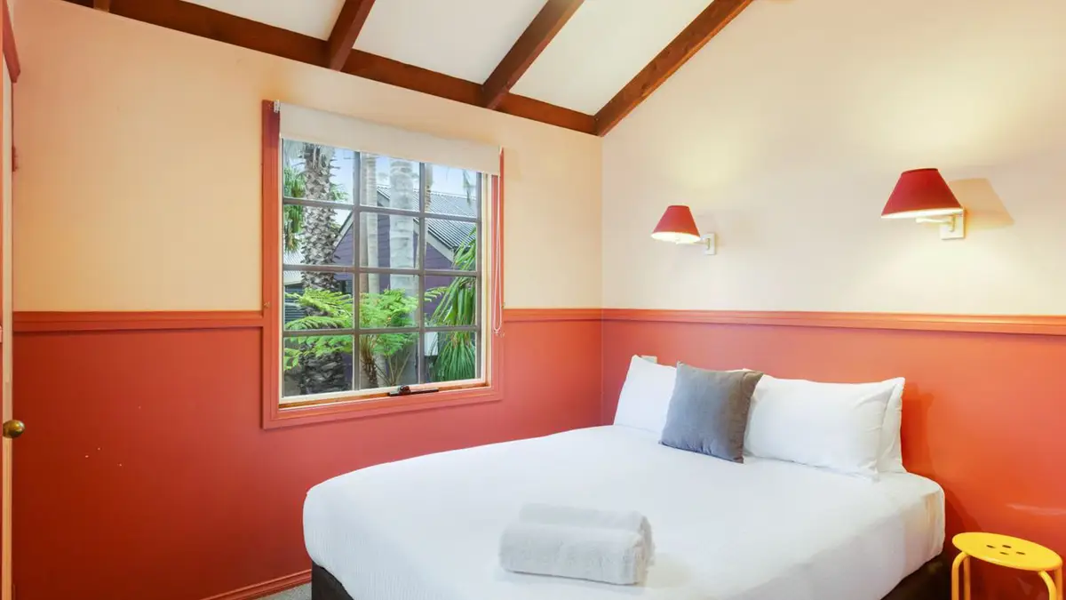 Stay in the heart of history with the Olde Town General Store cabin. With its classic shopfront and cosy interior, this two-bedroom retreat sleeps up to five guests with one queen bed and a single-over-double bunk. A practical kitchen with electric oven and full fridge makes meals simple, while the private balcony offers views to relax and reconnect—just steps from the beach.