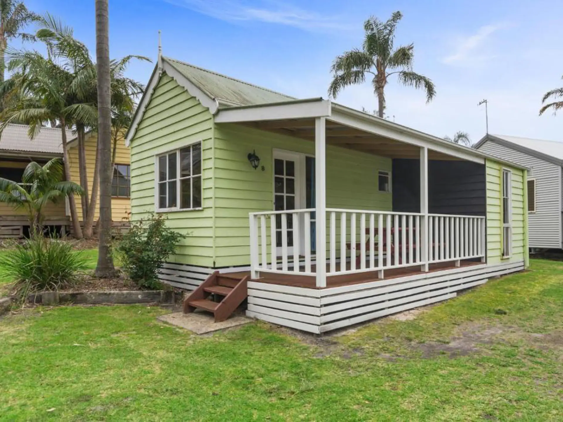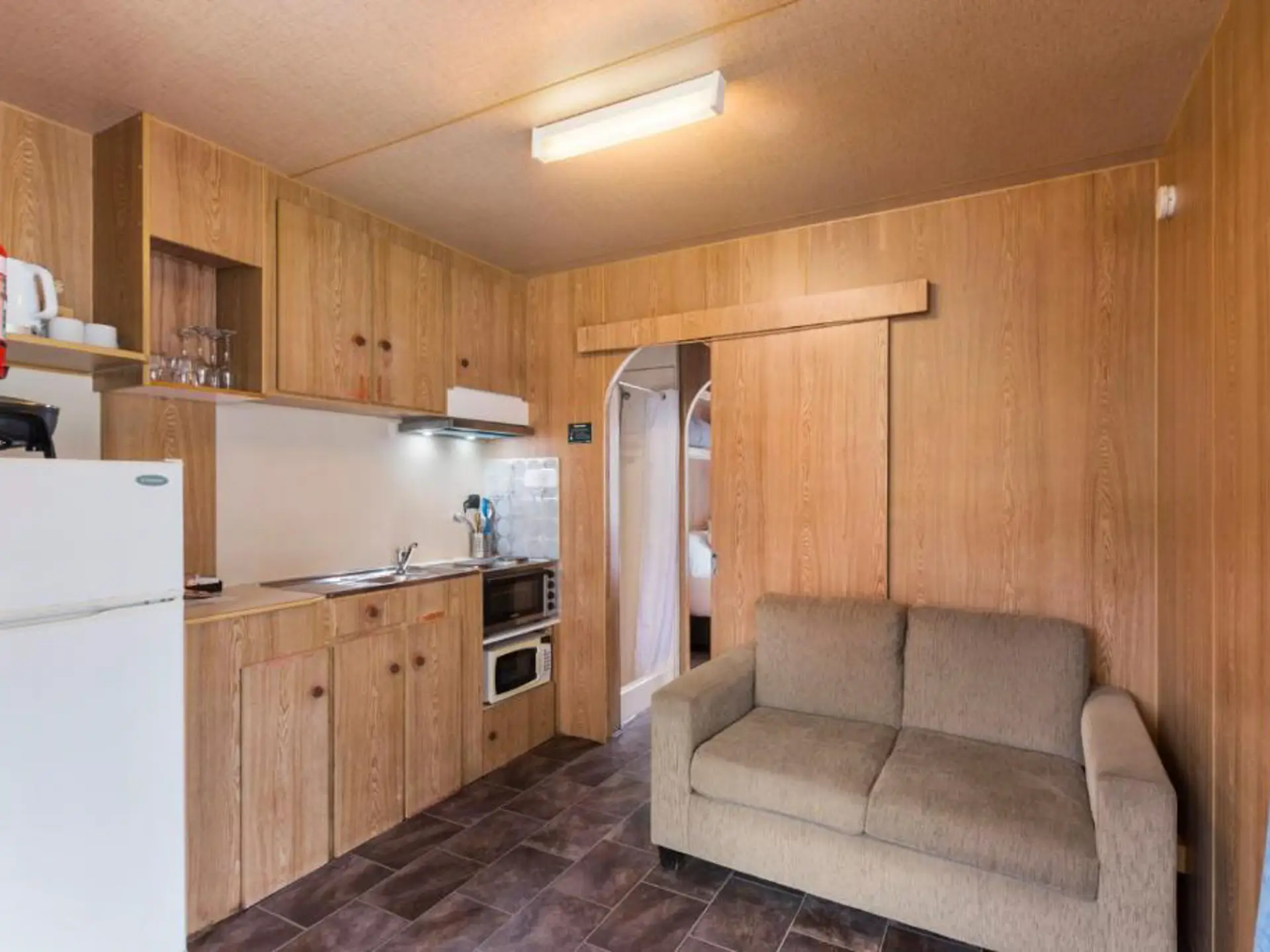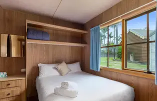 Designed for affordability and ease, this cosy two-bedroom cabin sleeps up to four with one queen bed and a bunk bed. The air-conditioned living space includes a kitchenette with stovetop, fridge, and microwave, plus a private bathroom with complimentary toiletries. A covered patio offers space to relax and dine outdoors. It’s a simple, self-contained option just minutes from the beach.