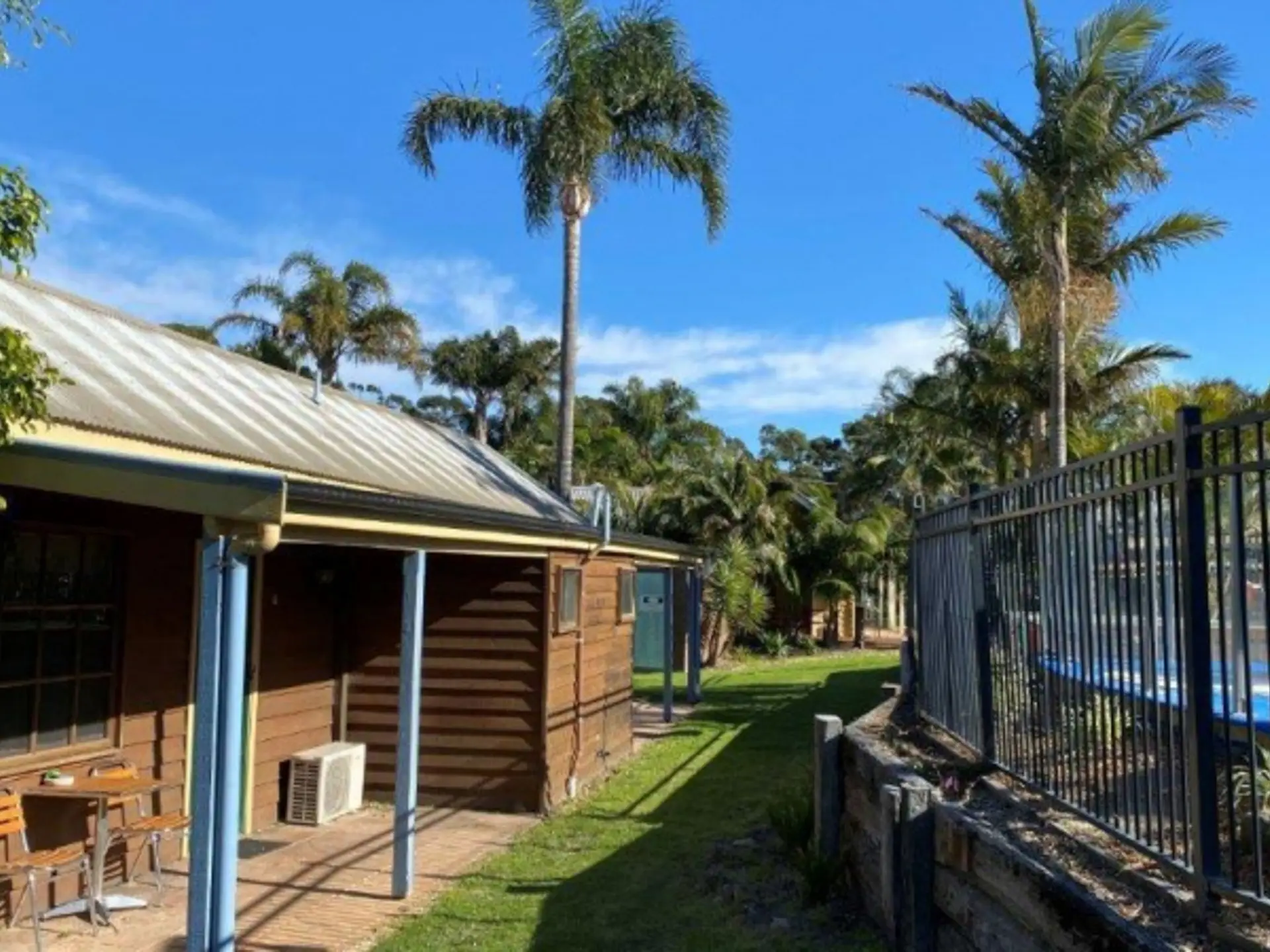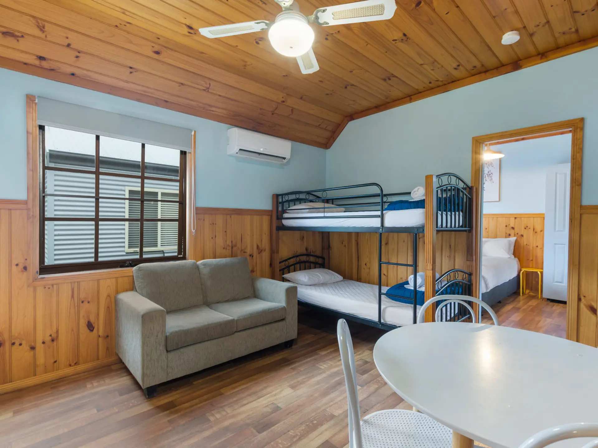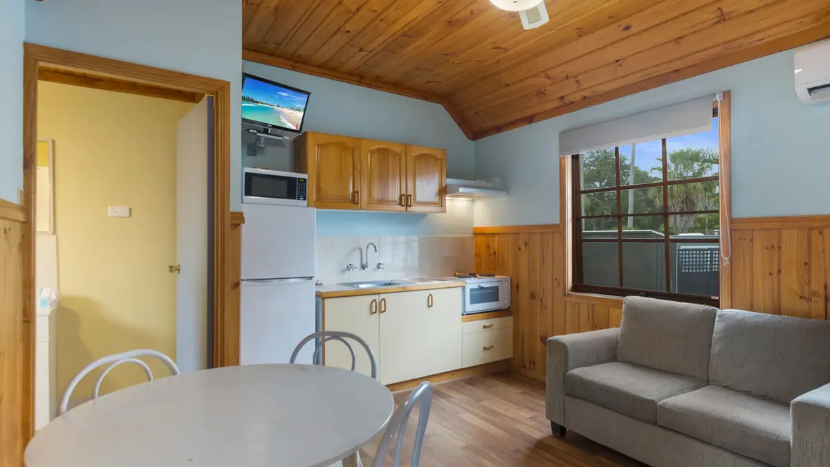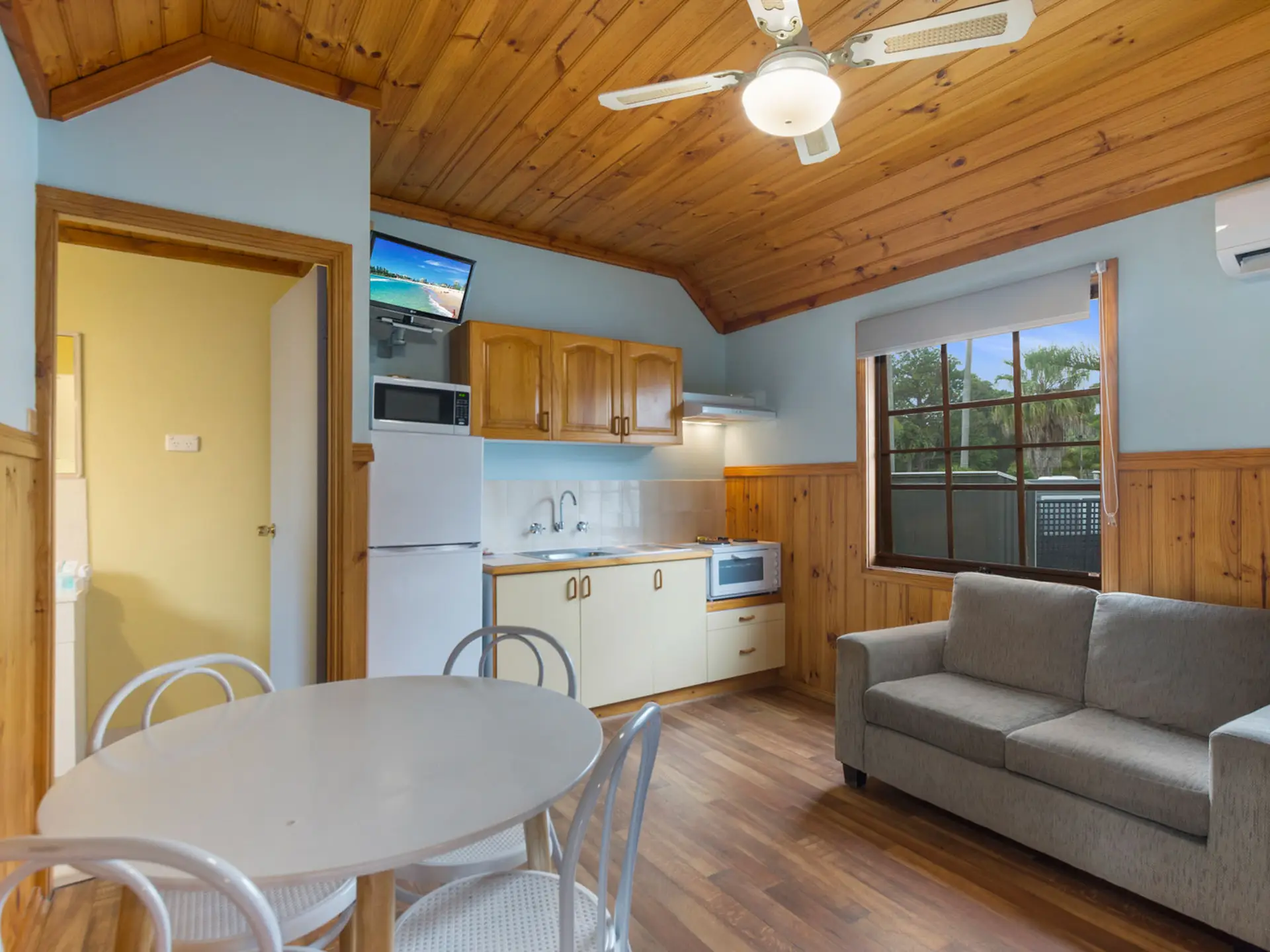Ideal for couples or small families, this one-bedroom cabin accommodates up to four guests with one queen bed and a single bunk. Enjoy the convenience of a kitchenette with microwave and fridge, plus air conditioning and a dining area. Step outside to your private patio with garden and pool views, perfect for unwinding after a day exploring Wairo Beach.