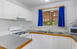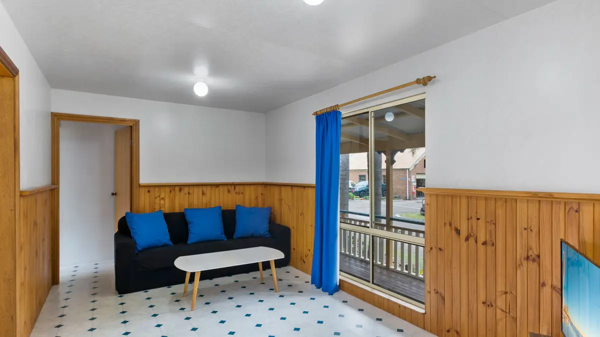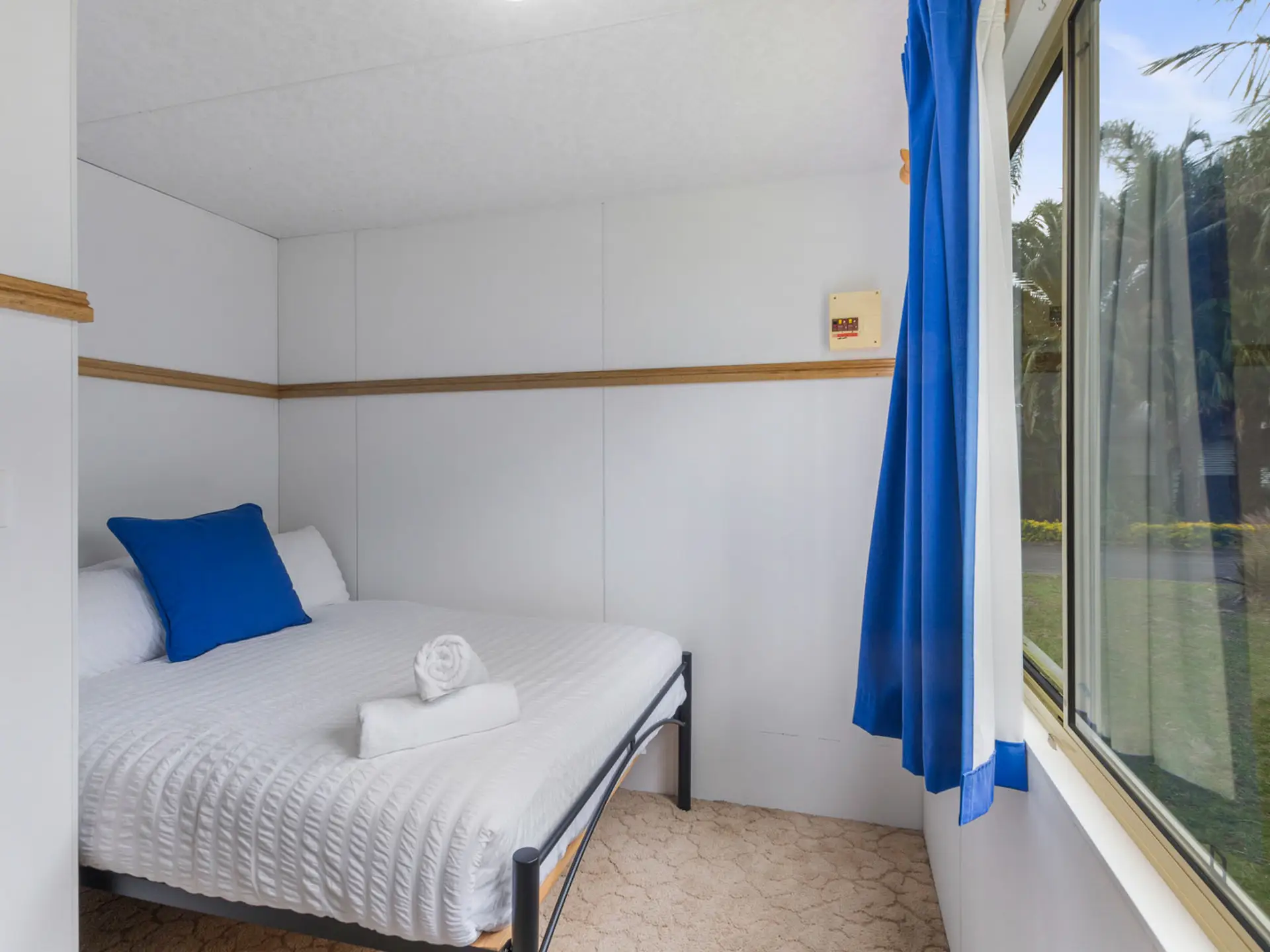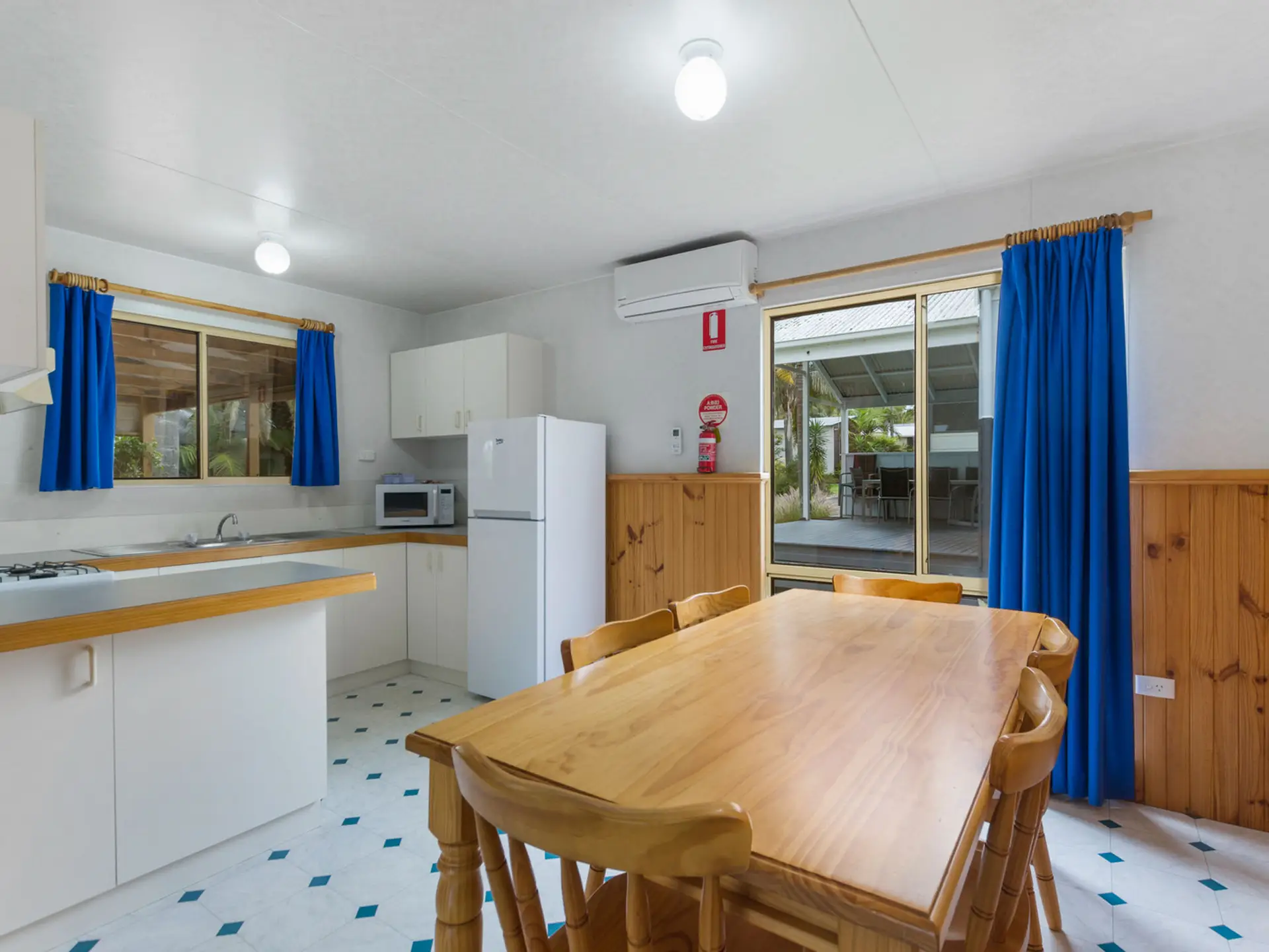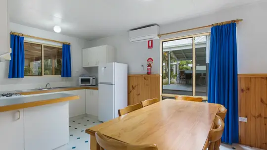 Perfect for a relaxing family holiday, this spacious two-bedroom cabin accommodates up to six guests with one queen bed and two bunk beds. The full kitchen includes a stovetop, microwave, and full fridge, while the bathroom offers a spa bath for extra indulgence. Air conditioning ensures comfort year-round, and the private deck is ideal for outdoor meals after a beachside adventure.
