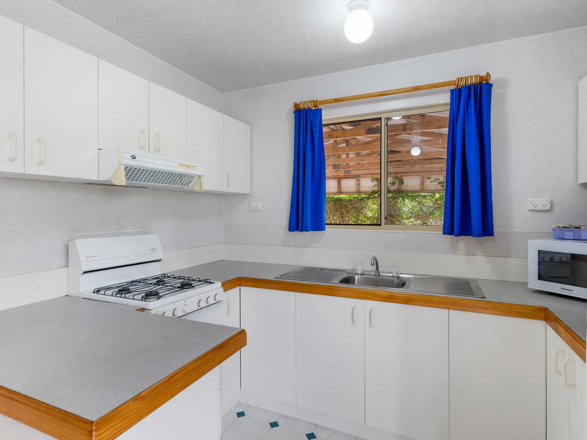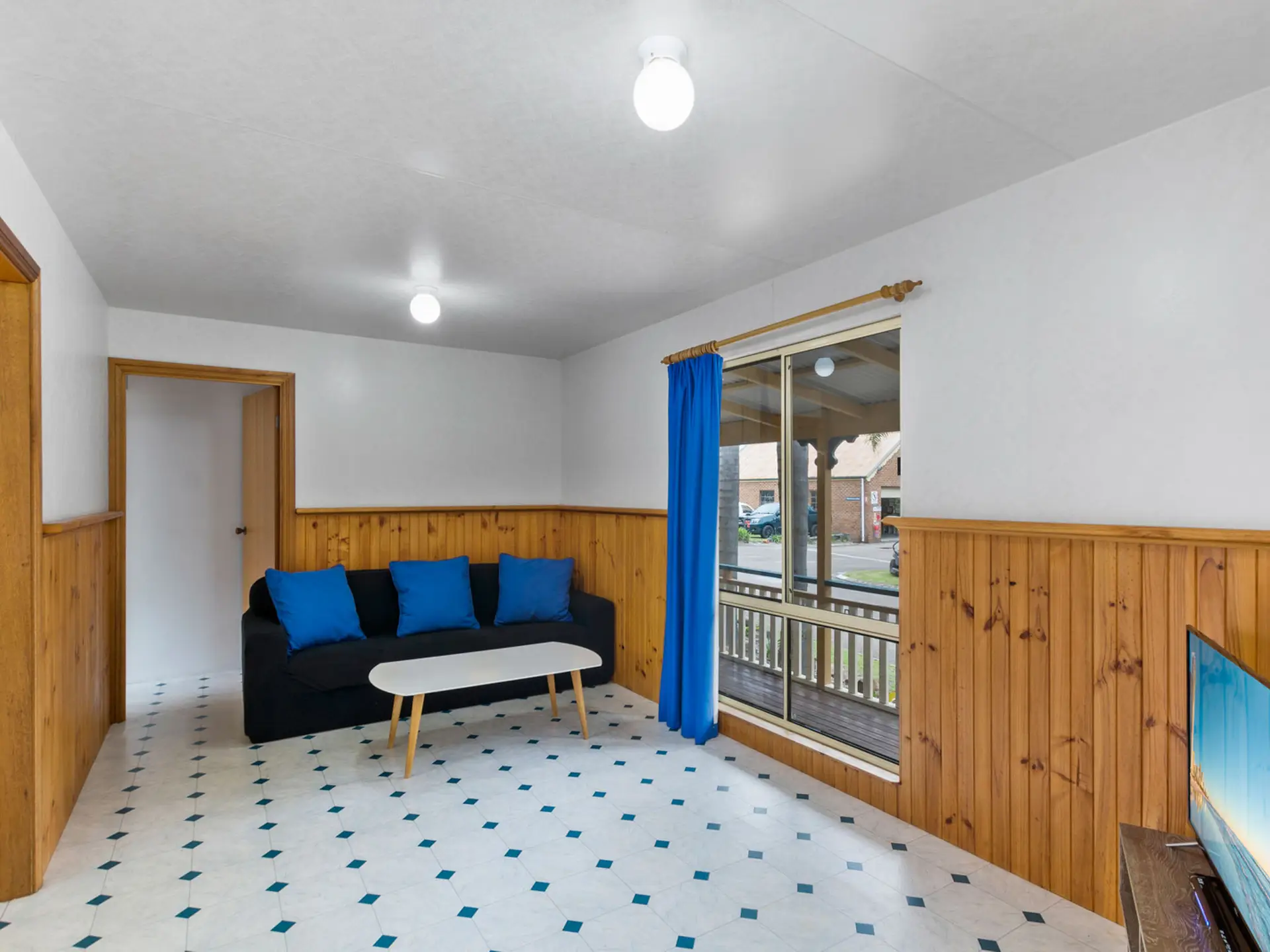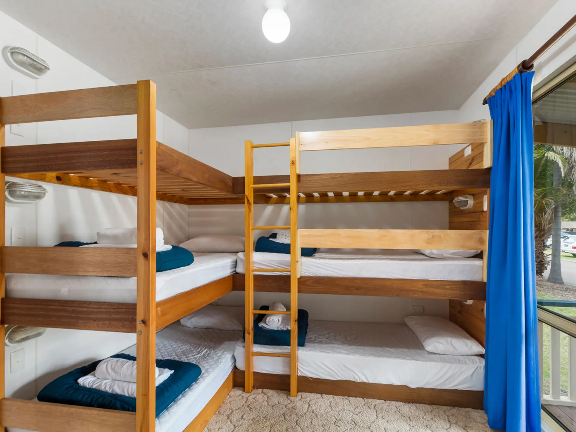 Perfect for a relaxing family holiday, this spacious two-bedroom cabin accommodates up to six guests with one queen bed and two bunk beds. The full kitchen includes a stovetop, microwave, and full fridge, while the bathroom offers a spa bath for extra indulgence. Air conditioning ensures comfort year-round, and the private deck is ideal for outdoor meals after a beachside adventure.