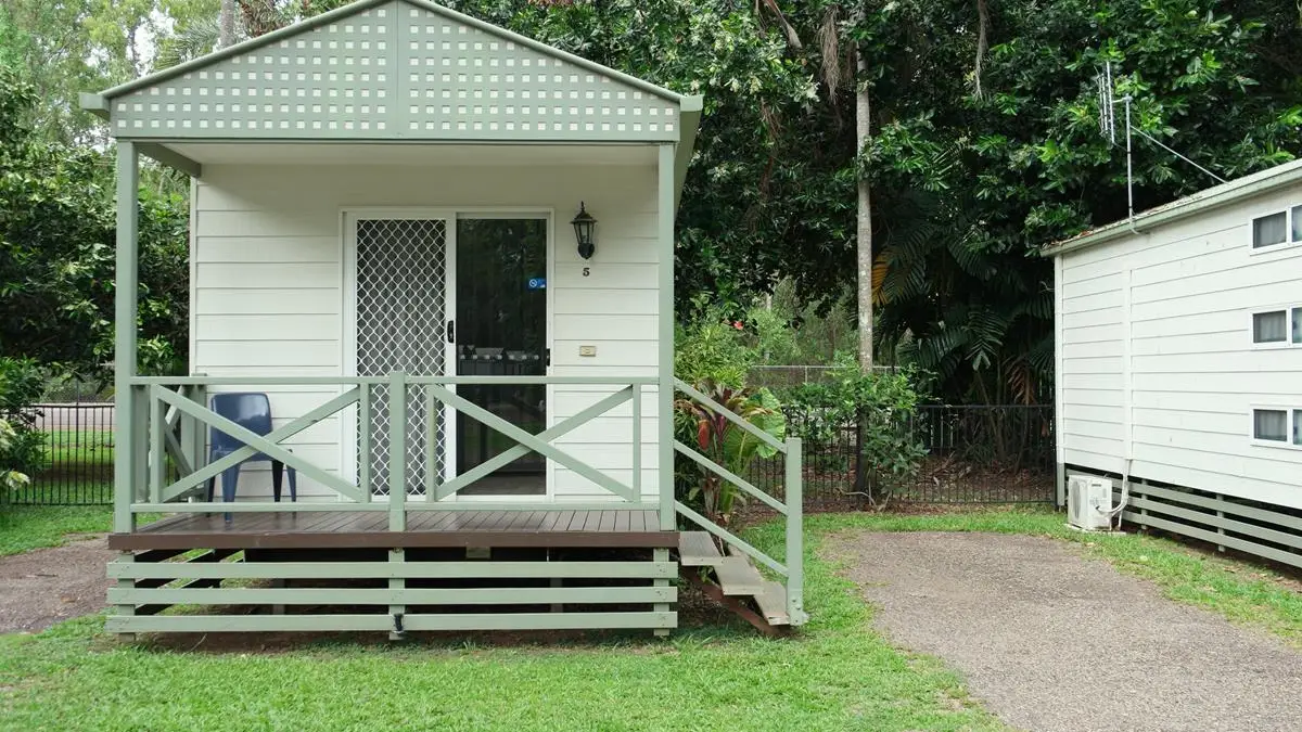This cabin boasts an open-plan layout includes a double bed and a set of single bunk beds suited for children. A compact kitchenette with cooktop, microwave, and bar fridge provides the essentials for easy meals. With air conditioning and a TV, plus a shaded veranda, you’ll enjoy both comfort and value.