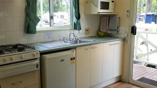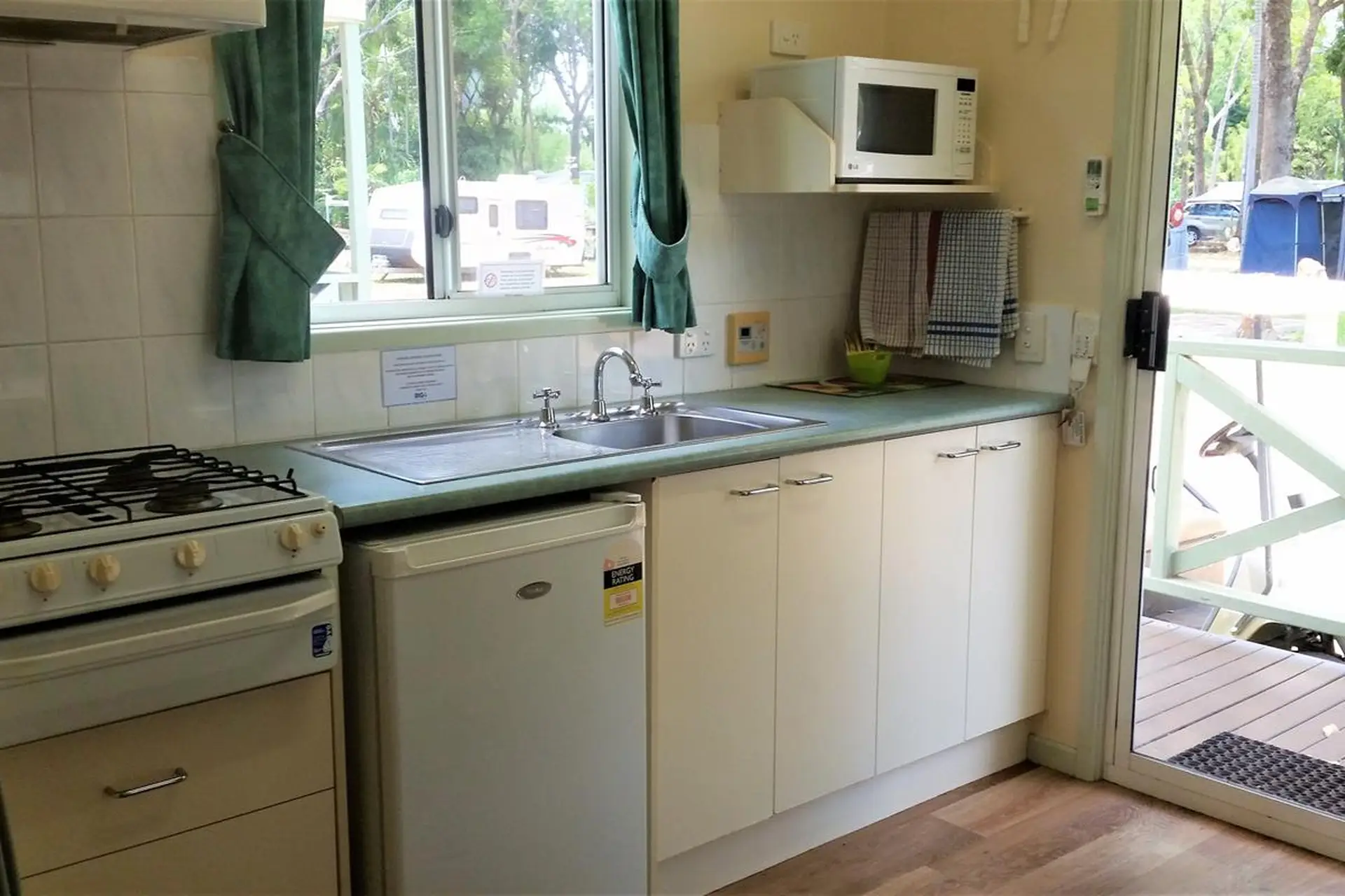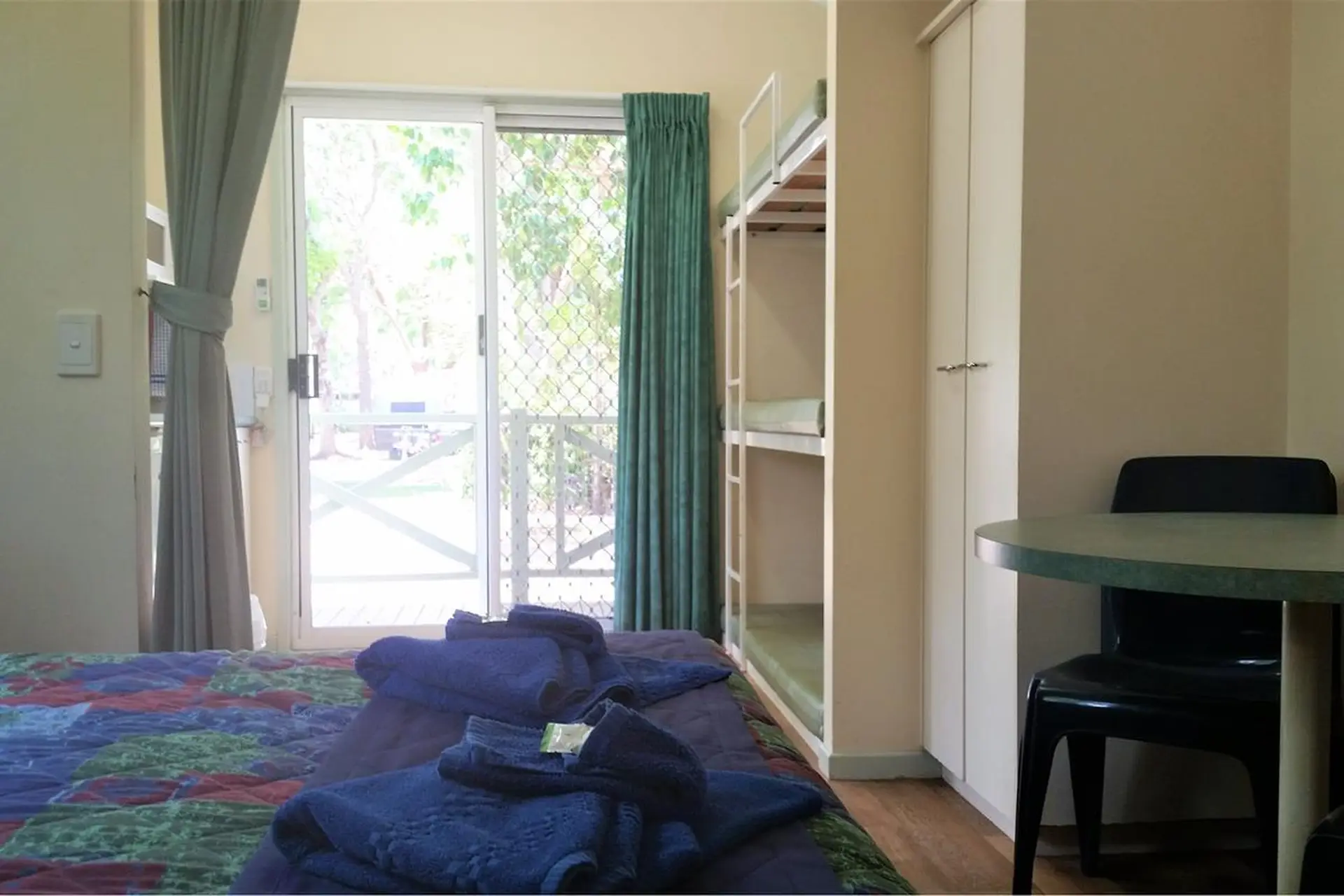 Bring the whole family—including your furry friend—to this pet-friendly cabin. Sleeping up to four, it features a double bed and child-friendly single bunk beds in an open-plan layout. Prepare meals in the compact kitchenette with cooktop, microwave, and bar fridge. With air conditioning, TV, and a shaded veranda, it’s a comfortable base for your Darwin escape.