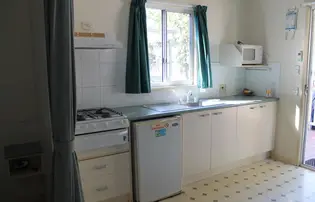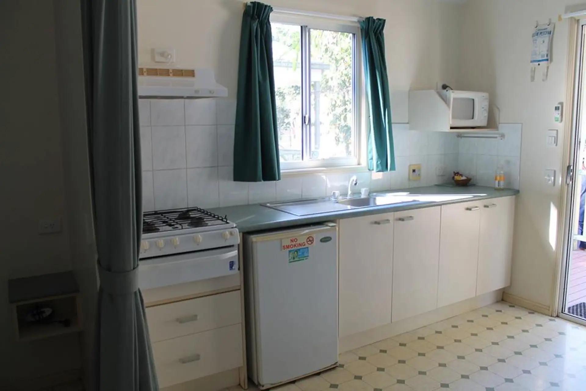 Ideal for couples or small families, this open-plan villa includes a queen bed and a set of single bunks suitable for children. The practical kitchenette features a cooktop, microwave, and bar fridge—perfect for light meals. Enjoy air conditioning, a TV, and a shaded veranda that invites you to relax and recharge after a day exploring the Top End.