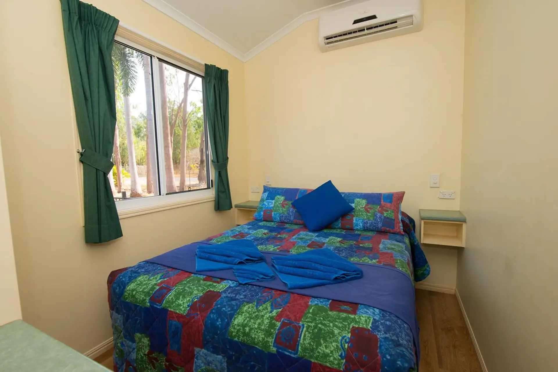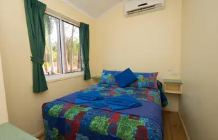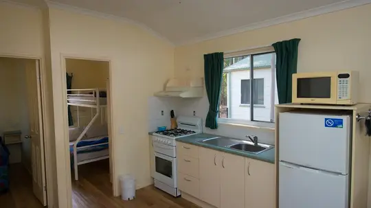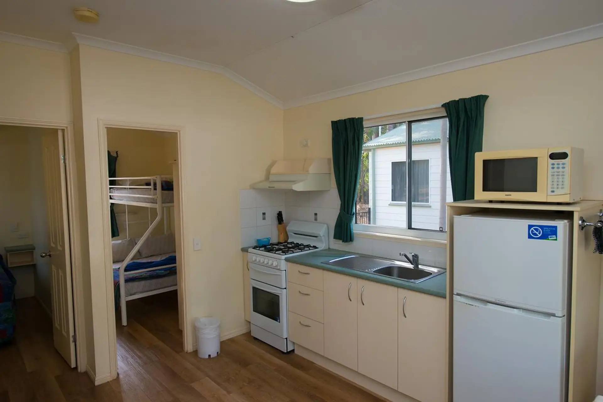Unwind in this self-contained retreat perfect for small families or couples. Sleeping up to five guests, it offers a double bed in one room and a tri-bunk in the second. A fully equipped kitchen with gas oven and full-size fridge makes mealtimes a breeze, while the private bathroom and shaded veranda offer added comfort. With air conditioning and a TV, you'll feel right at home. Conveniently located near the jumping pillow and main pool.