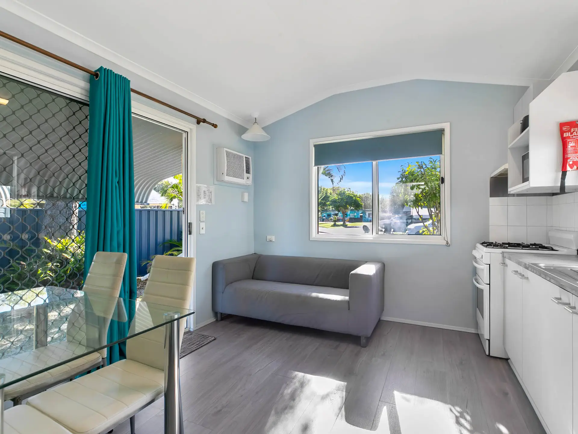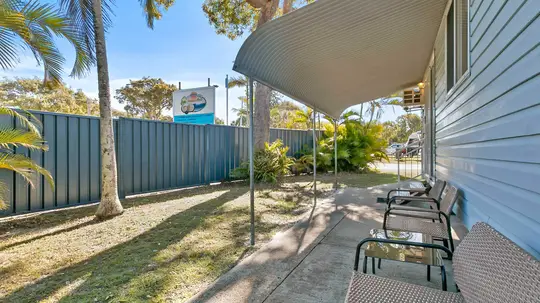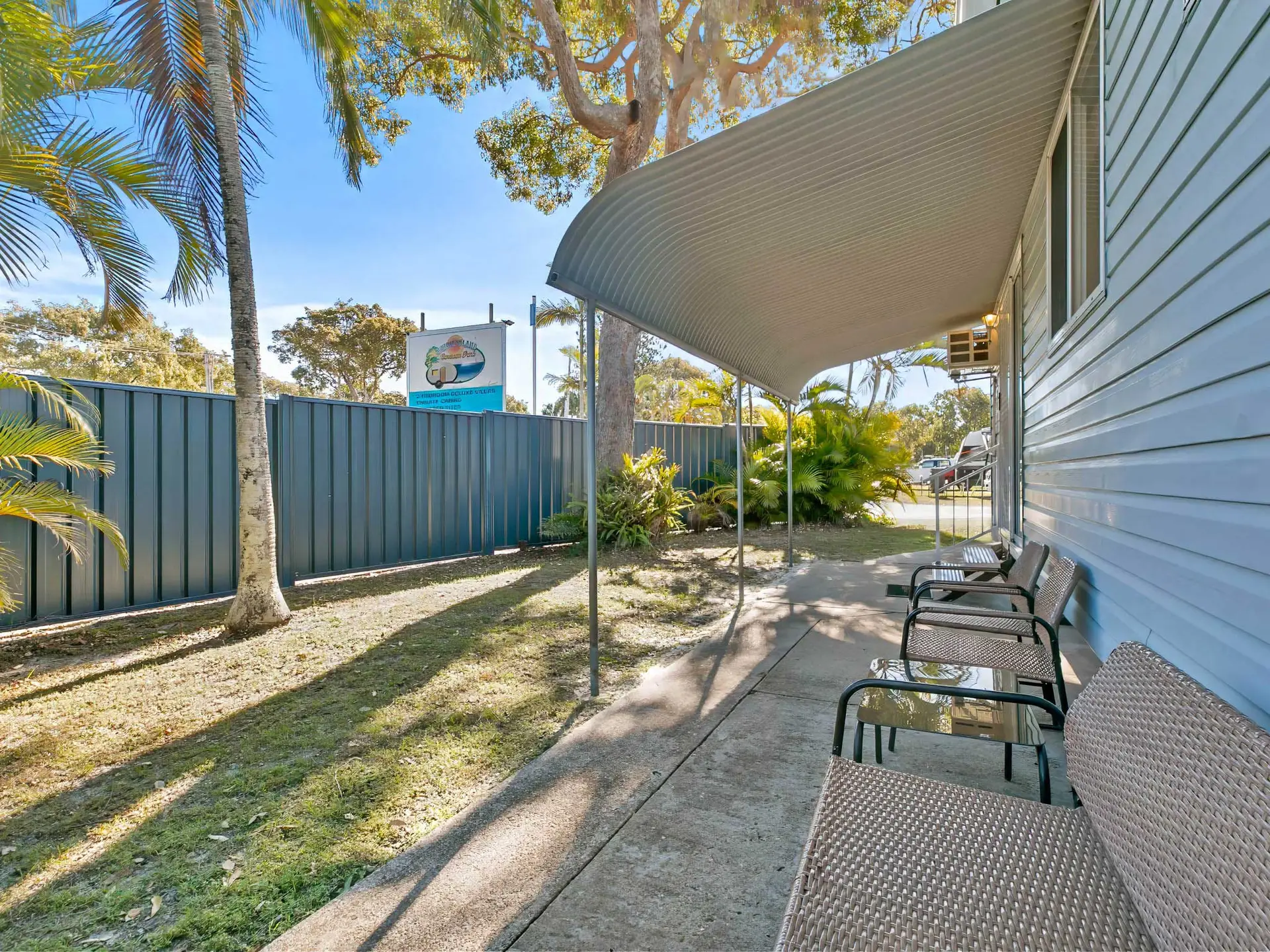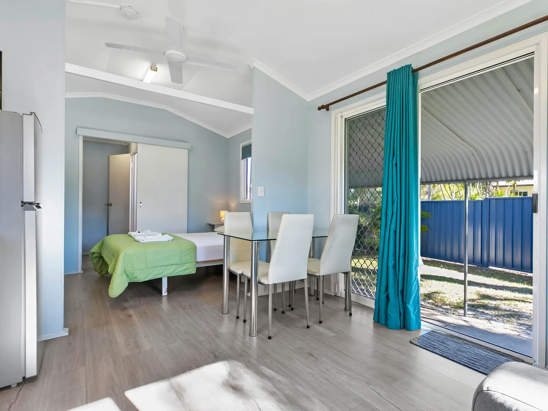 Ideal for couples or small families, this studio sleeps up to four with a queen bed and single bunks. The open-plan layout includes a full kitchen, dining space, TV, and private bathroom. Reverse-cycle air conditioning and ceiling fans offer year-round comfort. Step outside to a covered patio with outdoor setting—perfect for relaxed mornings or sunset wind-downs. With linen supplied, it’s a peaceful and affordable beachside retreat. Note: Bunk beds are best suited to children and may not comfortably accommodate adults.