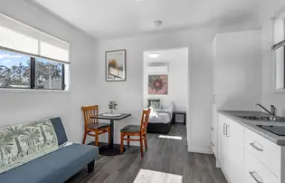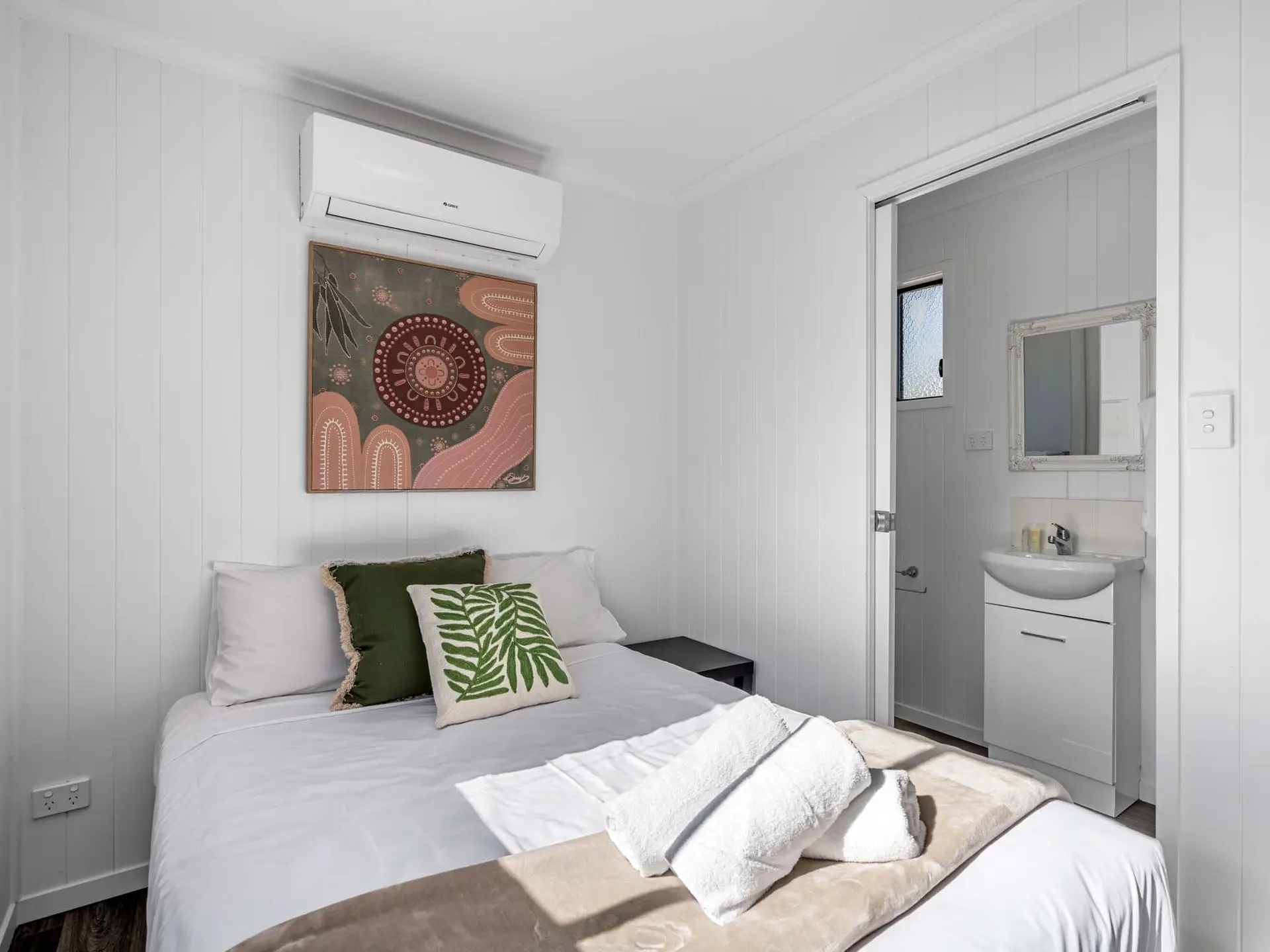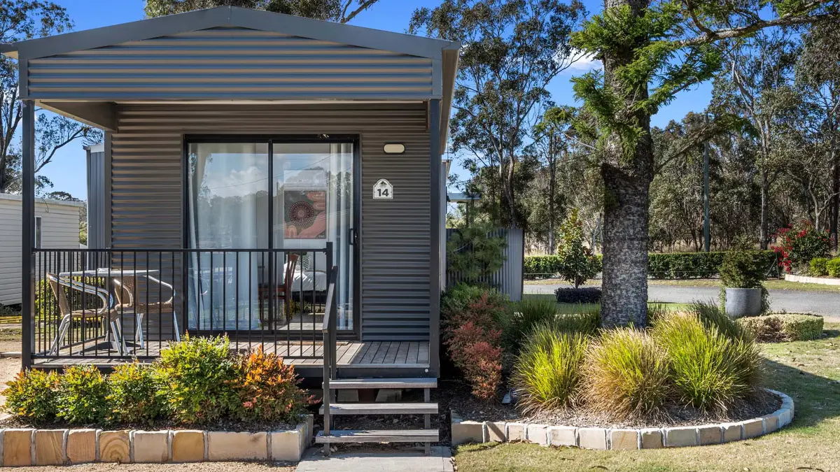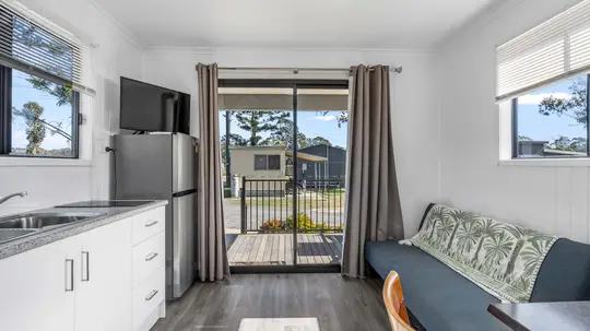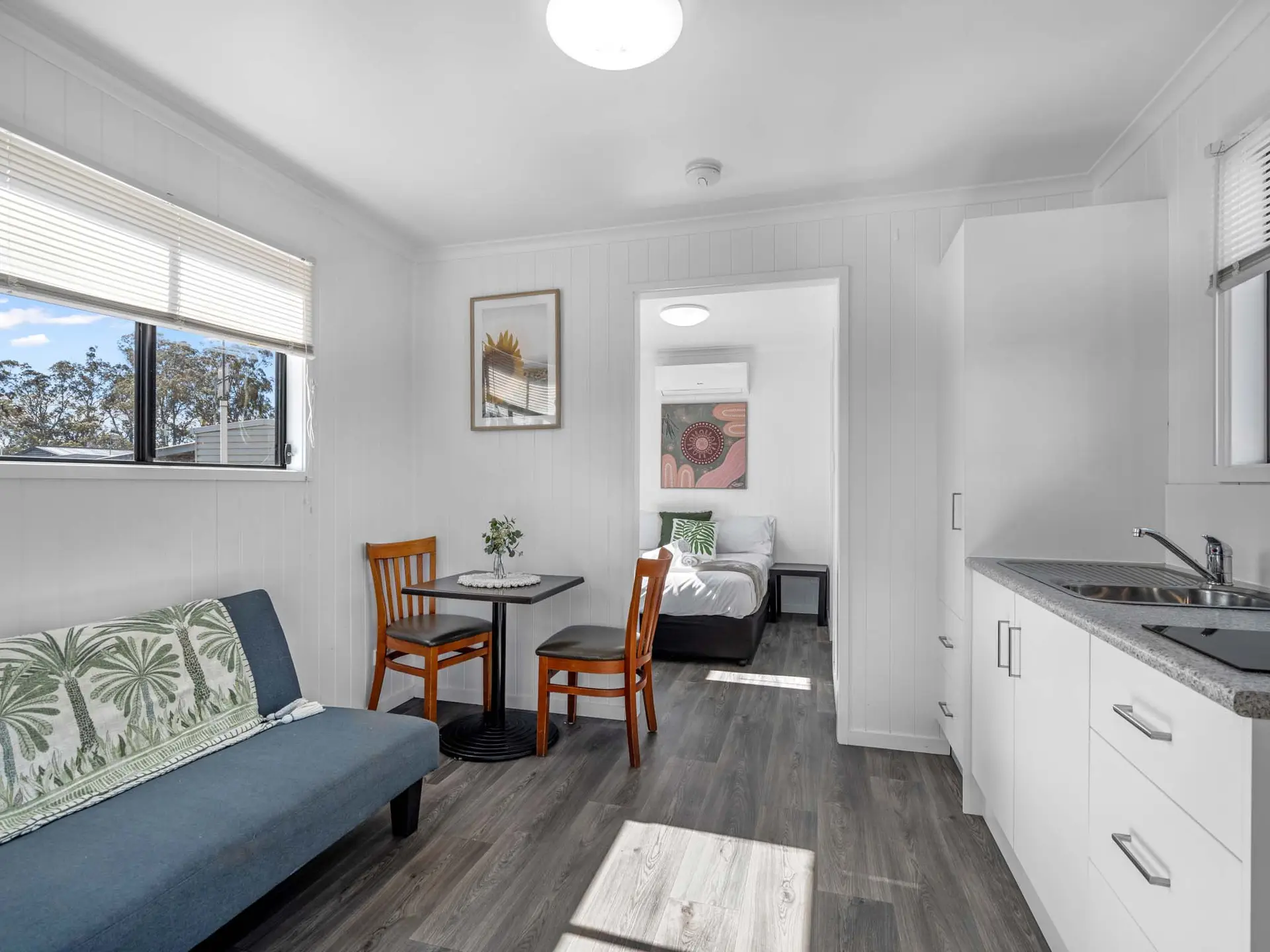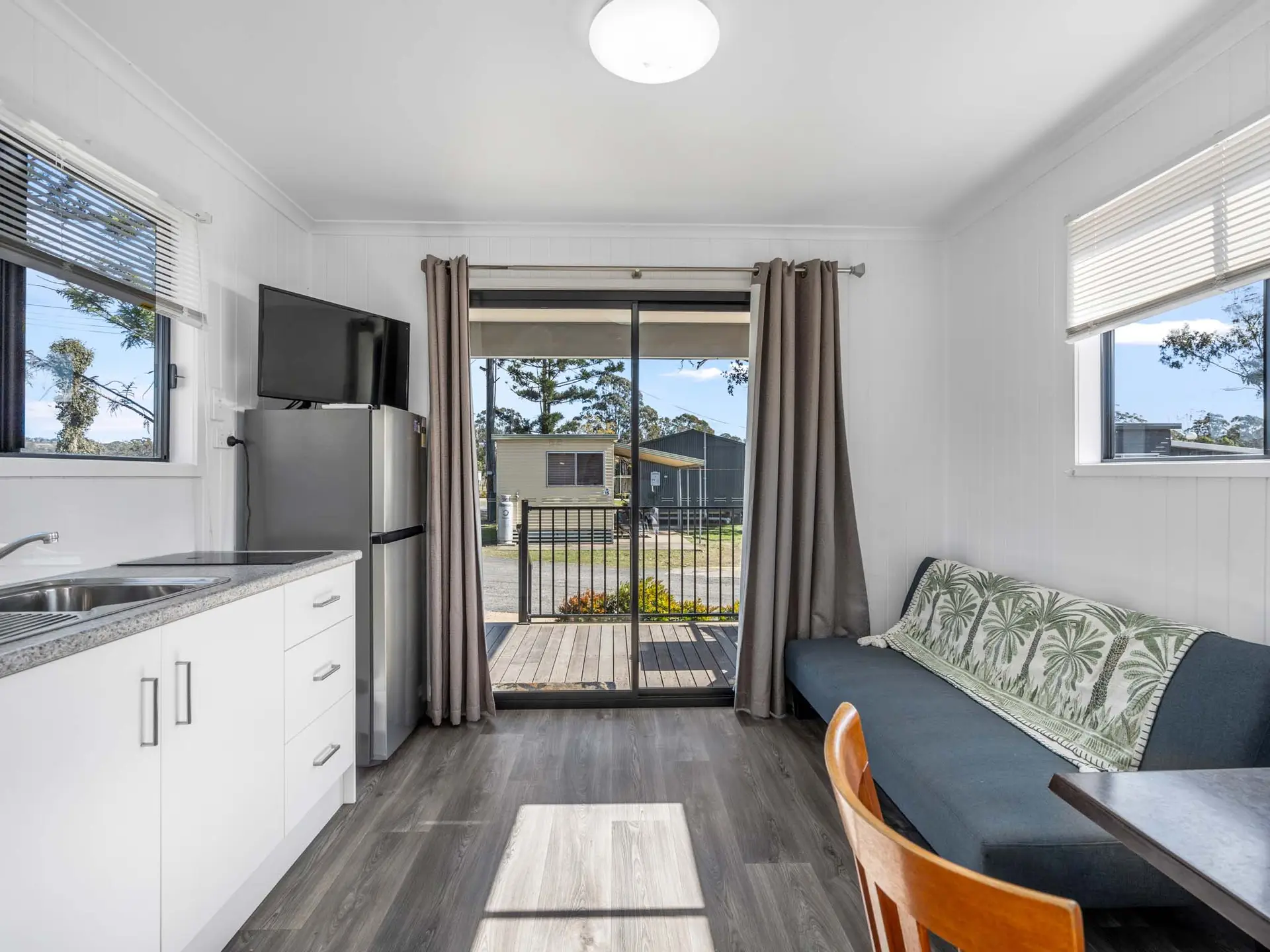 This one-bedroom cabin is perfect for couples or solo travellers, with a double bed and fold-out futon for a child or guest. Enjoy a self-contained kitchen, cosy lounge with TV, and private bathroom. Airy and welcoming, the outdoor patio with dining is great for relaxed mornings or quiet evenings. A peaceful, well-equipped base for your next escape.