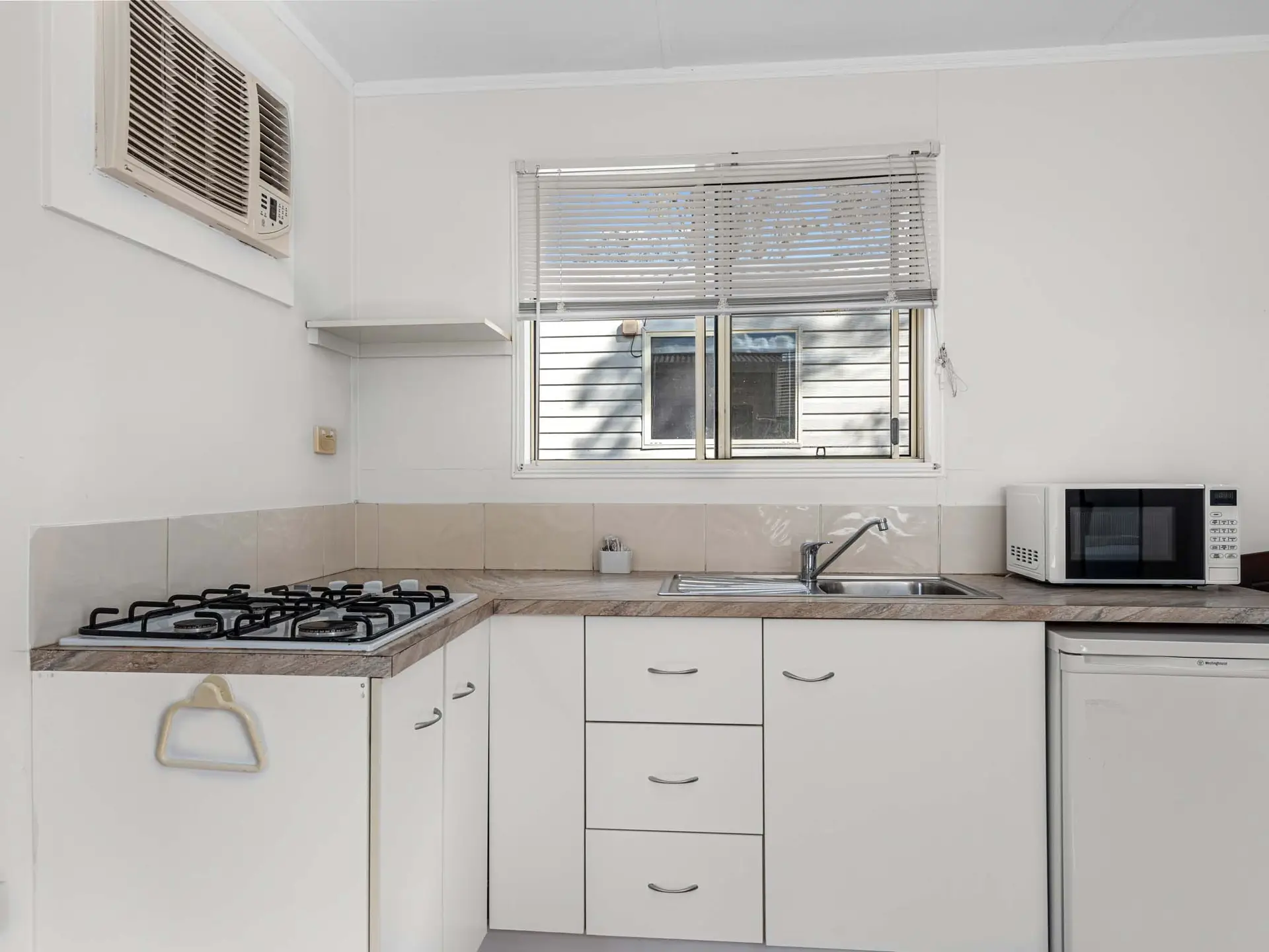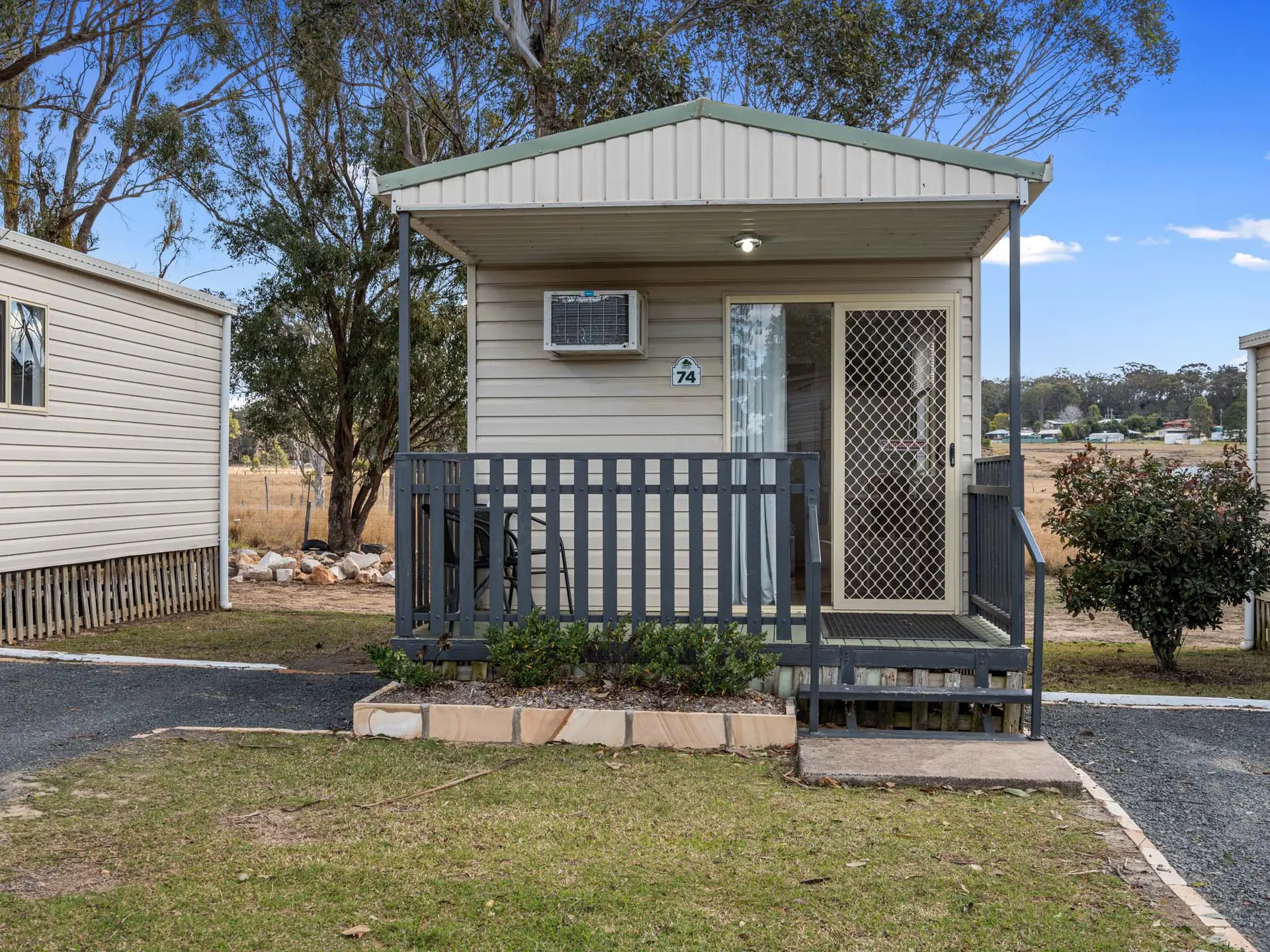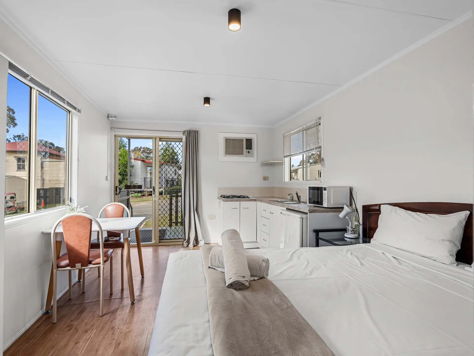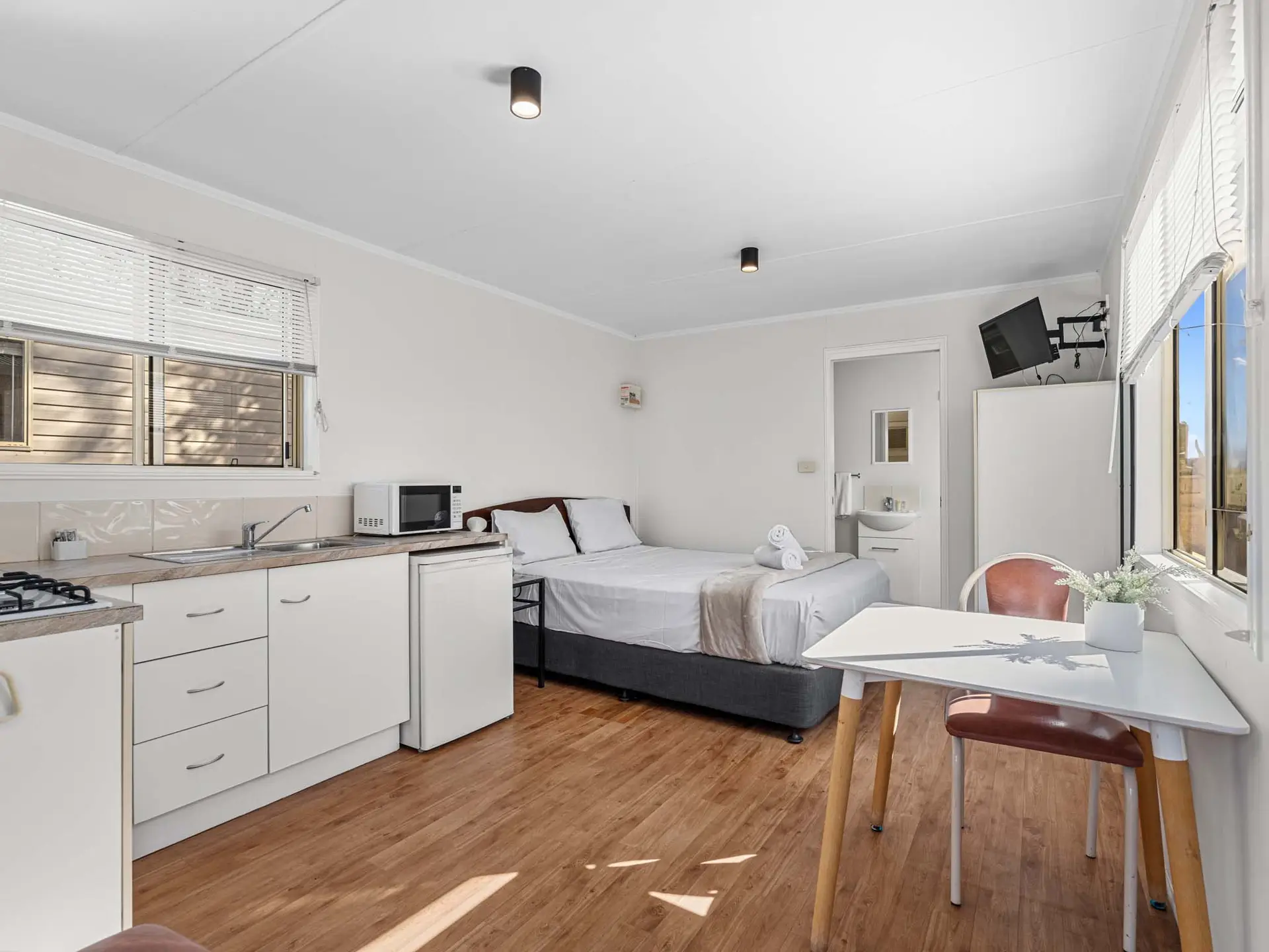 Ideal for solo travellers or couples, this compact studio cabin features a double bed and open-plan layout with a kitchenette, dining space, and private bathroom. Air-conditioning and heating provide year-round comfort, while the balcony with outdoor setting is perfect for relaxed moments. Simple and budget-friendly, it’s a great value base for a peaceful stay.