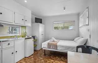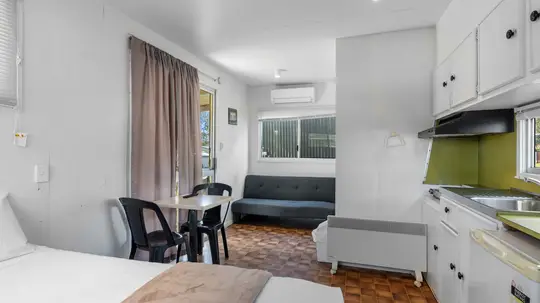This pet-friendly cabin sleeps up to four with a double bed and fold-out futon for children—ideal for couples, solo travellers, or small families. It features a kitchenette, dining area, TV, and private bathroom, with heating and air-conditioning for comfort. Relax outdoors on the private patio with outdoor seating. Simple, affordable, and welcoming to pets, it’s a great base for an easygoing holiday.