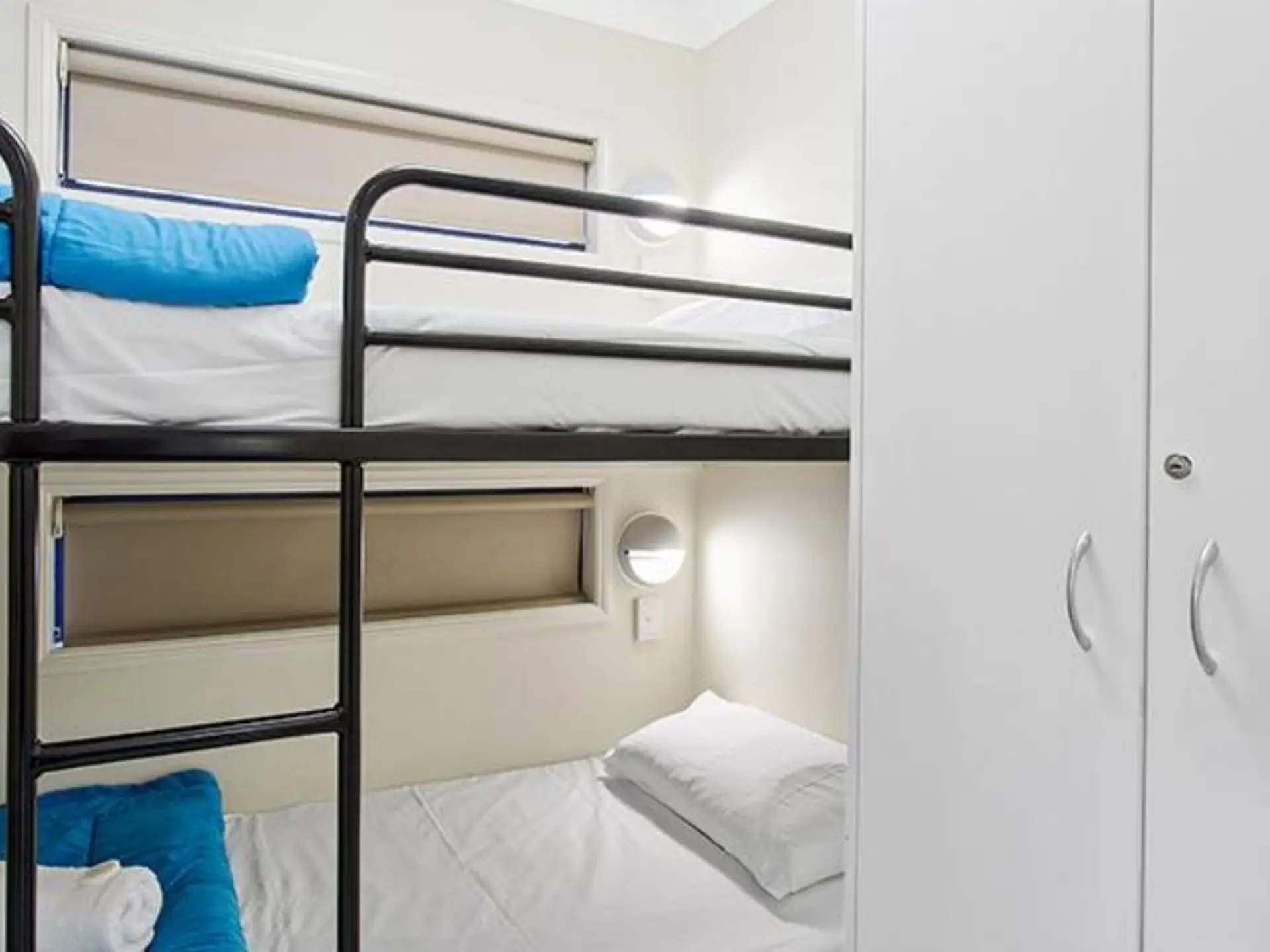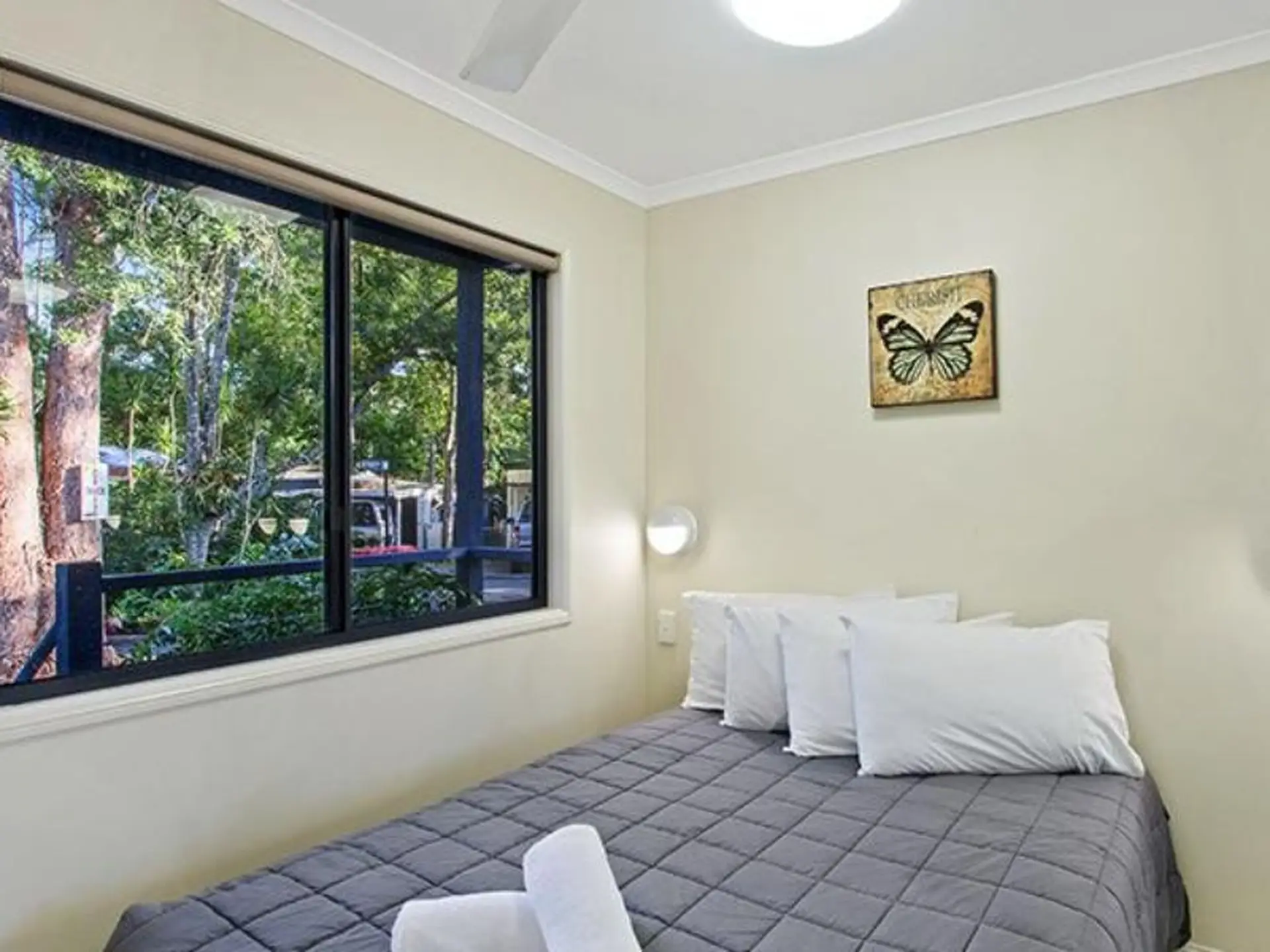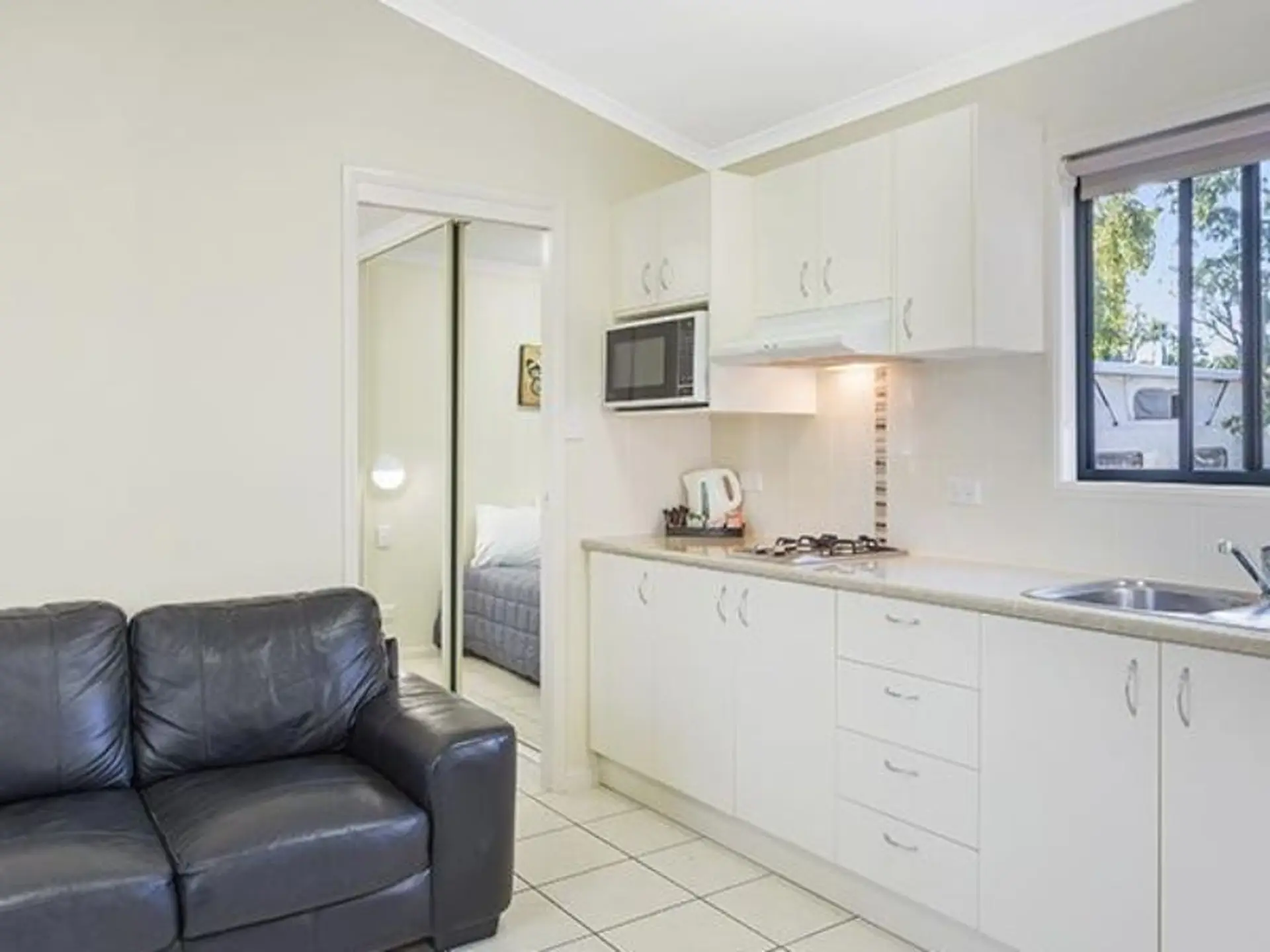 Unwind in this comfortable two-bedroom cabin, ideal for up to four guests. The main bedroom features a queen bed, while the second offers single bunks—great for families. A well-equipped kitchen, cosy living area with TV, and air conditioning ensure a relaxed stay. Enjoy quiet mornings or evenings on your private balcony.