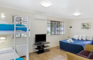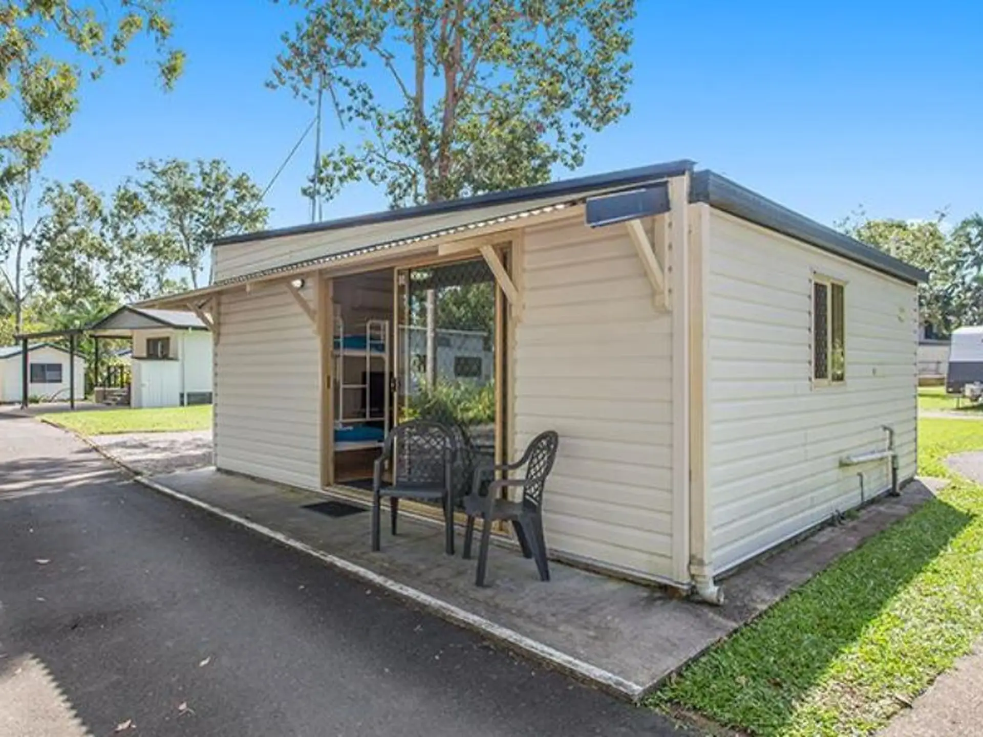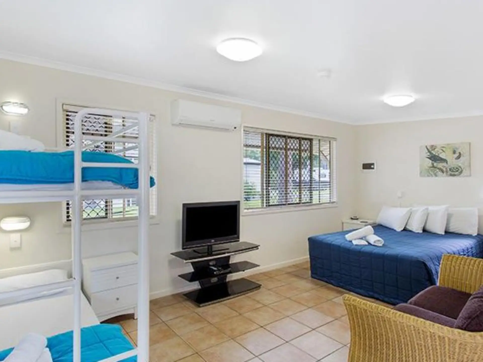 Ideal for couples or small families, this open-plan studio cabin sleeps up to four guests with a queen bed and single bunks. It features a convenient kitchenette, air conditioning, and a comfortable living area with TV. A great base to relax after a day of exploring, with all essentials close at hand.