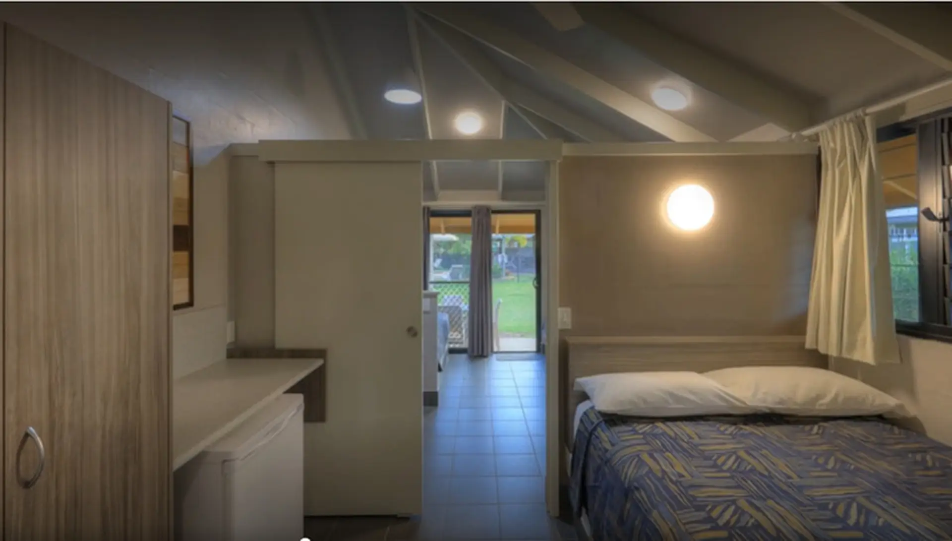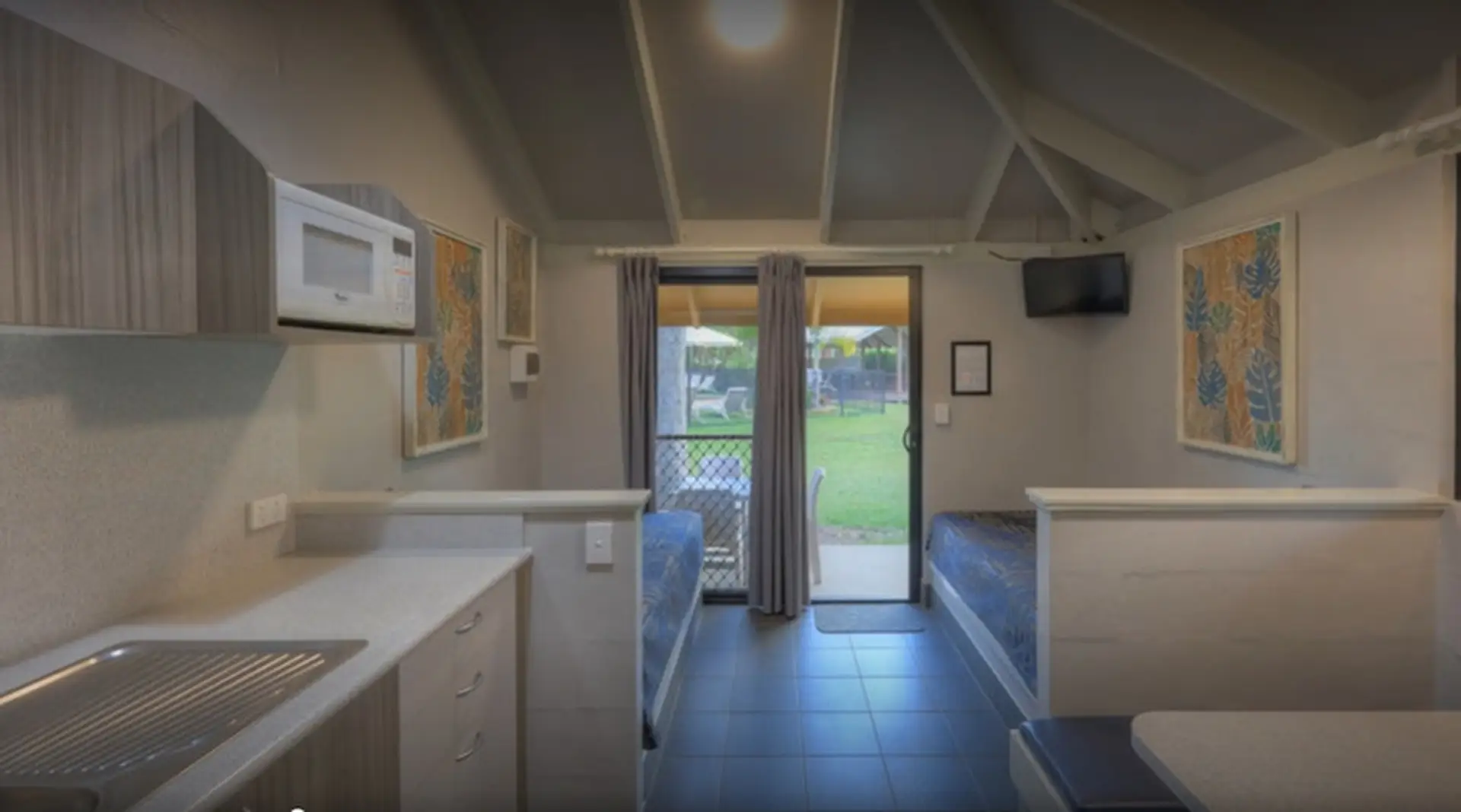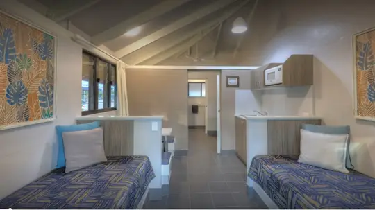 Designed for up to four guests, this air-conditioned cabin features one double bed and two singles. A compact kitchenette includes a fridge/freezer, microwave and stovetop, ideal for simple meals. With a dining area, TV, and a shaded outdoor patio, it’s a practical base for families or small groups.