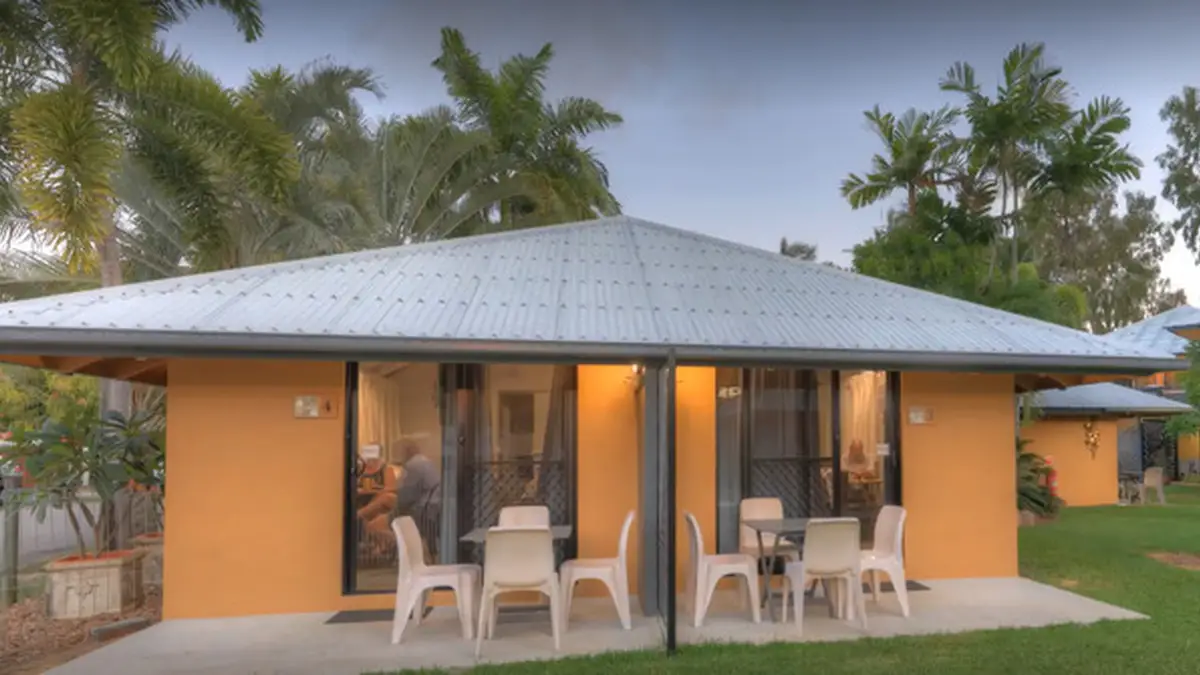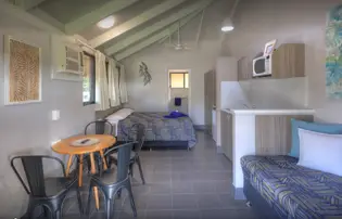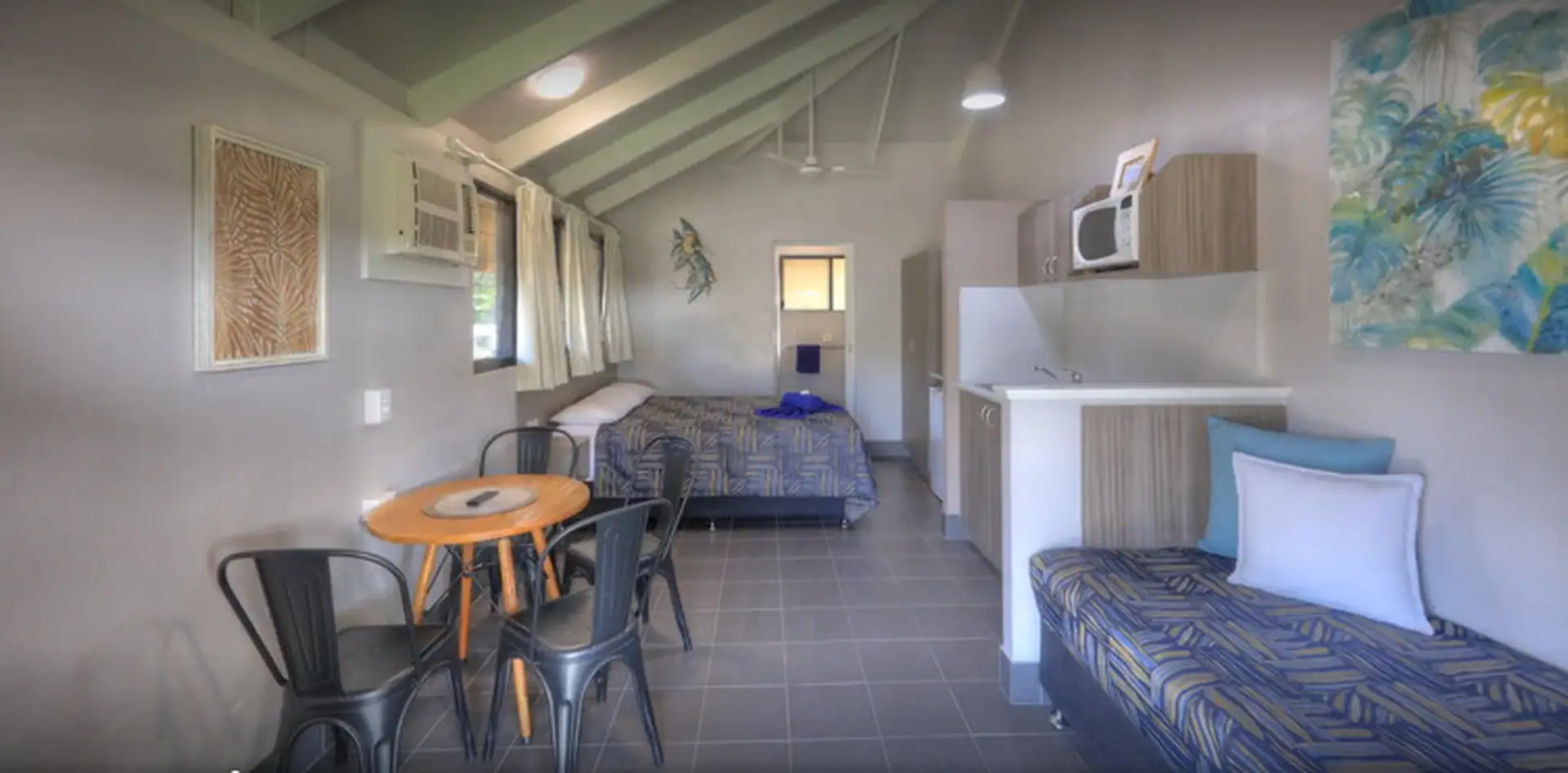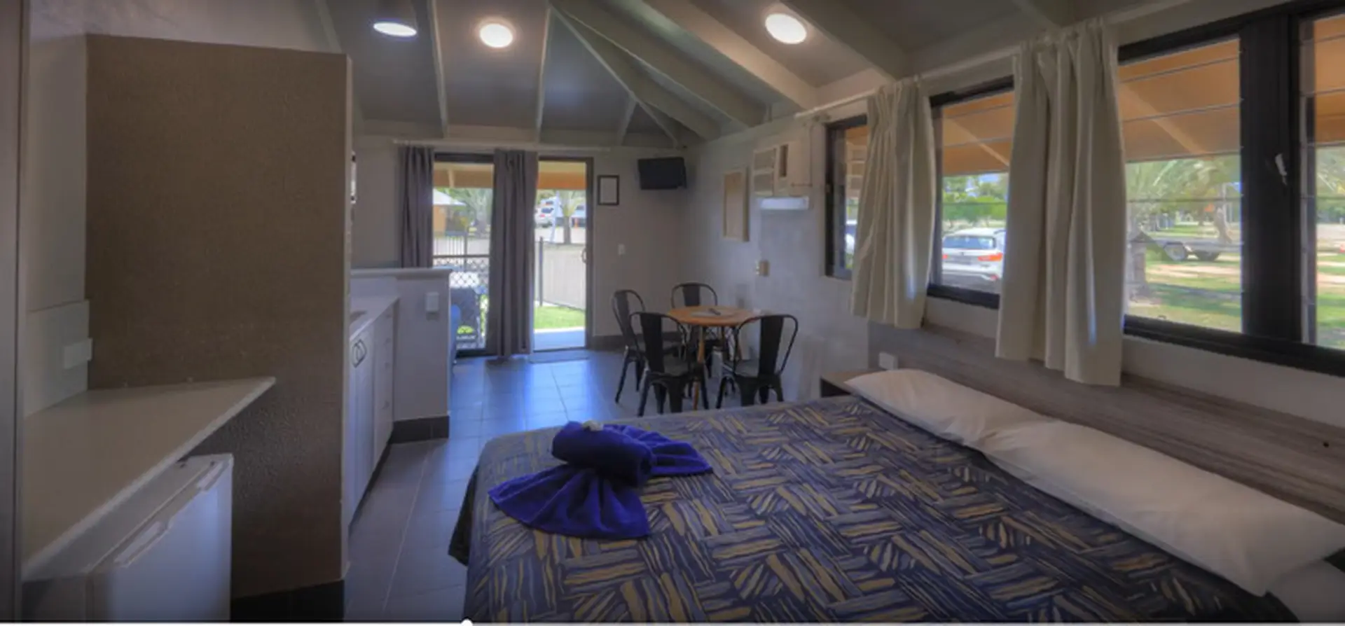 Ideal for couples or small families, this cabin sleeps up to three with a queen bed and a single. It includes air conditioning, a kitchenette with fridge/freezer and microwave, and a patio with outdoor dining. Just steps from the pool and BBQ area, it offers a simple, relaxed stay.