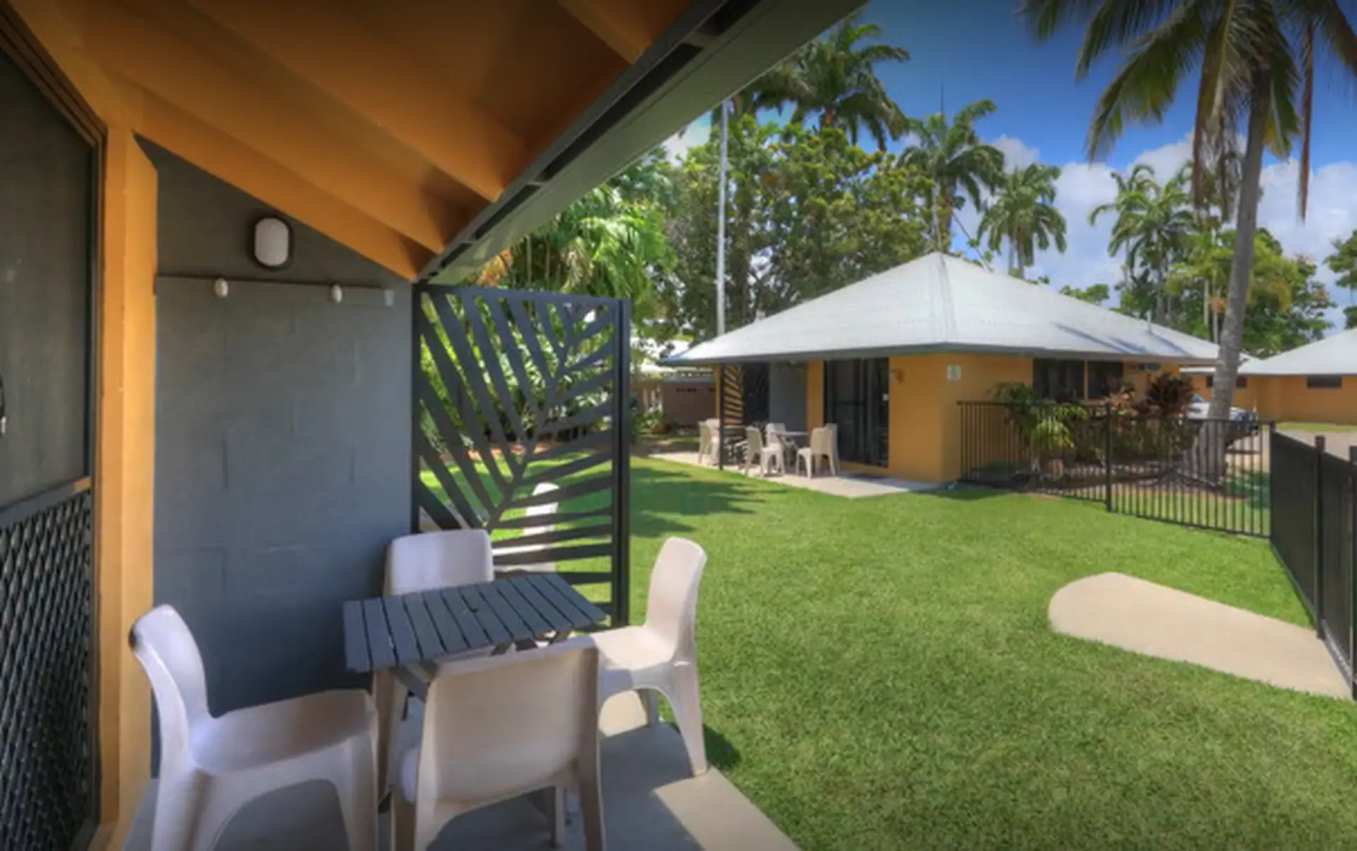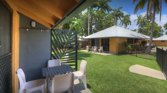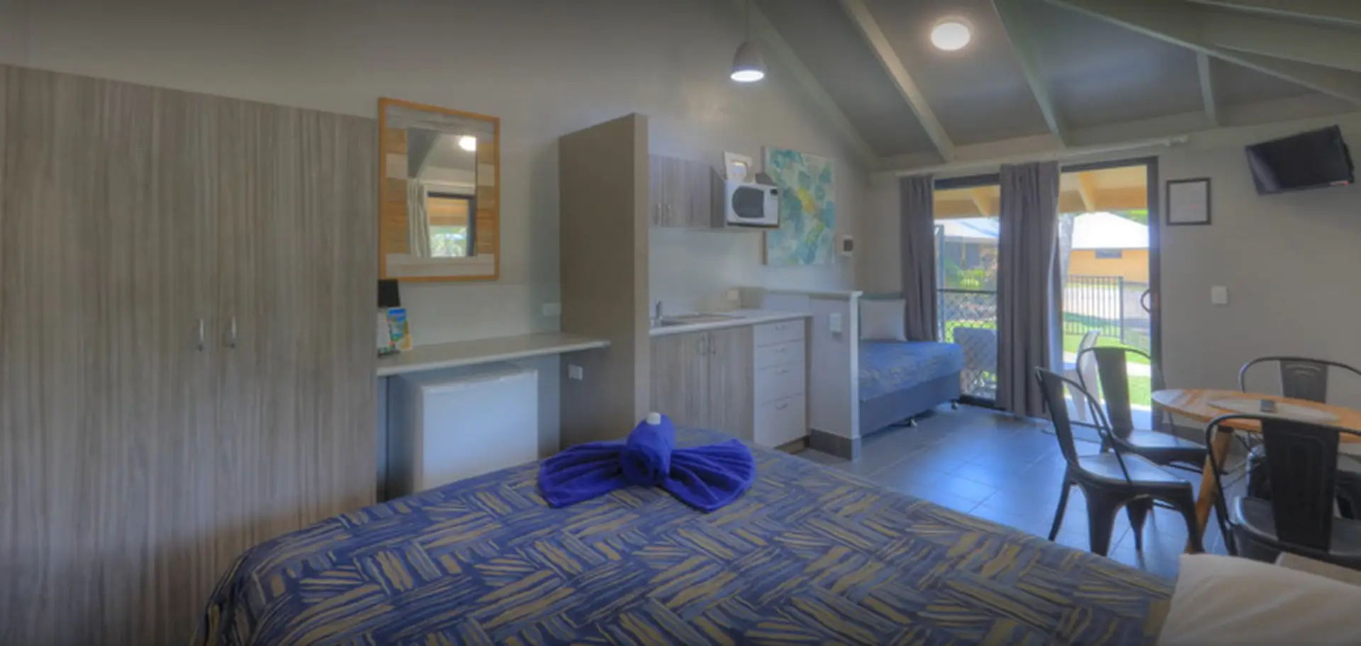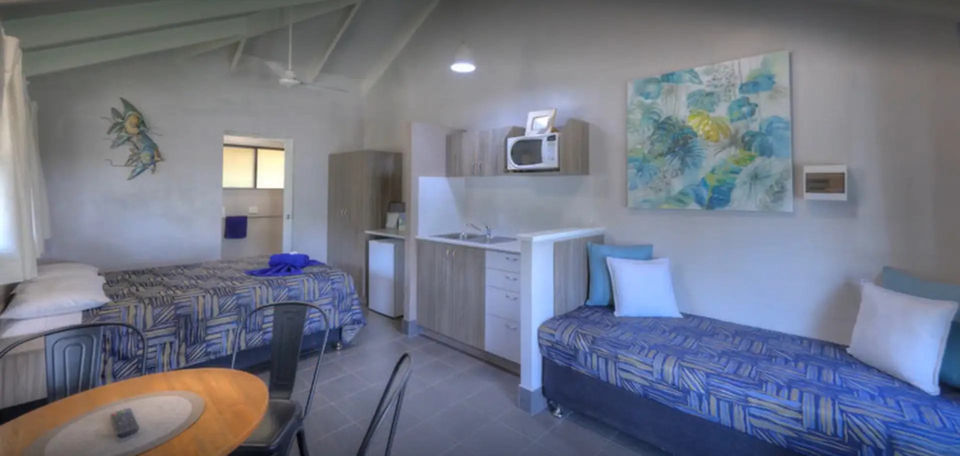 Ideal for couples or small families, this cabin sleeps up to three with a queen bed and a single. It includes air conditioning, a kitchenette with fridge/freezer and microwave, and a patio with outdoor dining. Just steps from the pool and BBQ area, it offers a simple, relaxed stay.