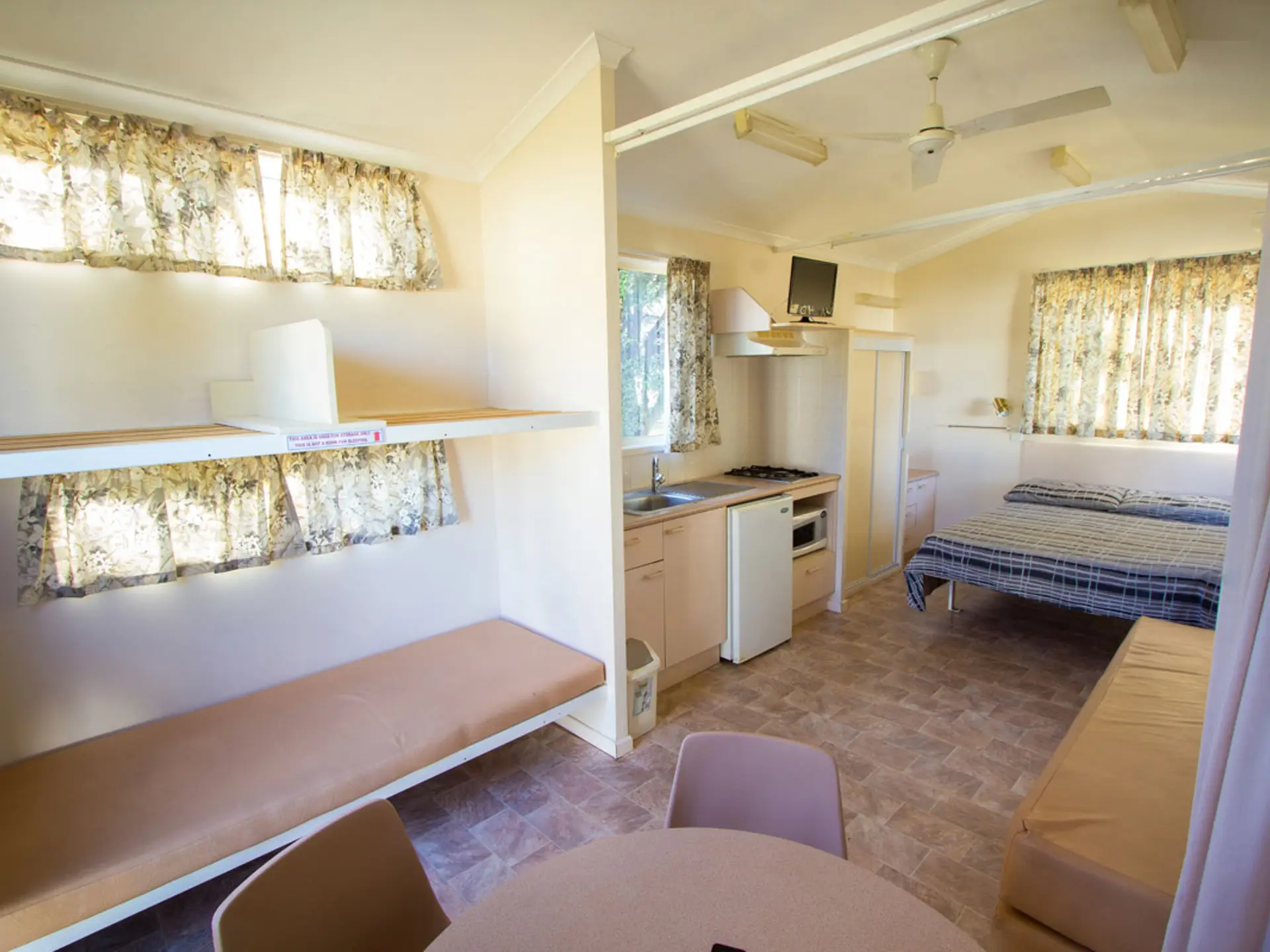This pet-friendly cabin is a great choice for up to three guests. It features a double bed and a bunk, with a basic kitchenette including a gas oven, stovetop, microwave, toaster, kettle, and bar fridge. While there’s no ensuite, guests are just steps from the park’s amenities block, BBQ area, camp kitchen, and laundry. A practical option for simple stays.