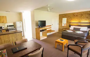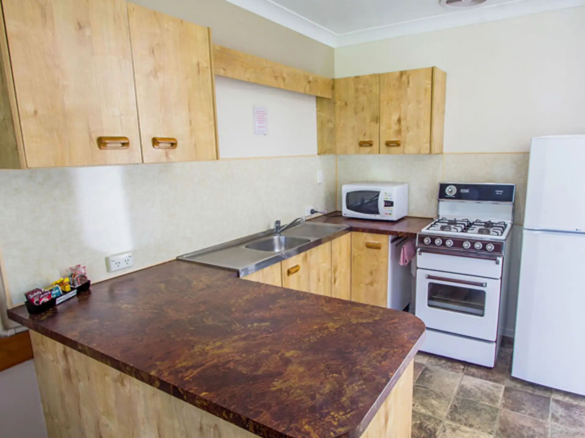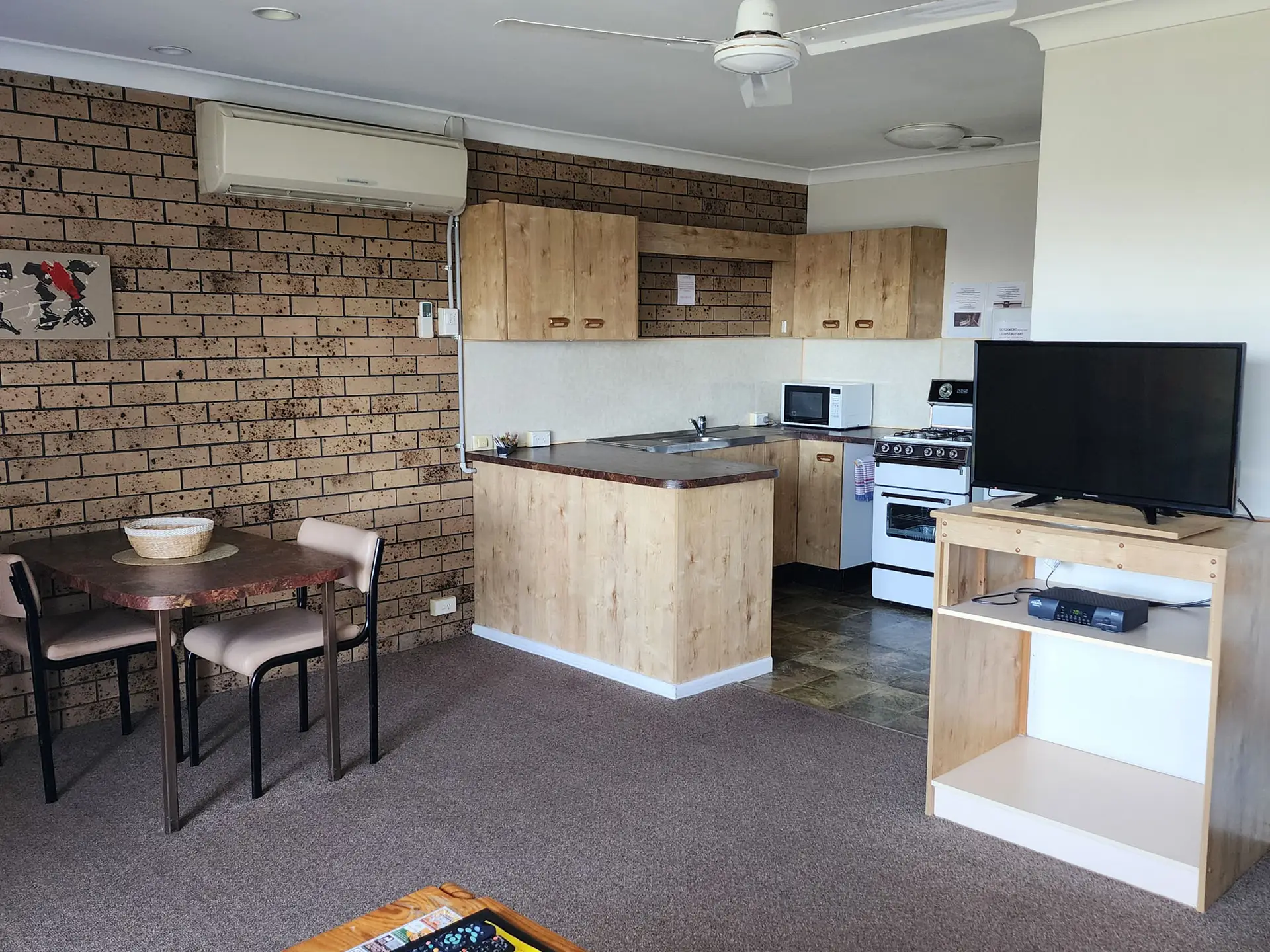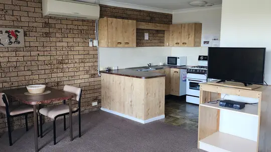 Ideal for families or small groups, this spacious one-bedroom unit sleeps up to five with a queen bed, two singles, and a trundle. Enjoy a full kitchen with gas oven, stovetop, microwave, and full-size fridge. The air-conditioned living area features a dining space and TV for relaxed nights in. Clean, comfortable, and pet-friendly, it’s a practical base for your stay in Toowoomba.