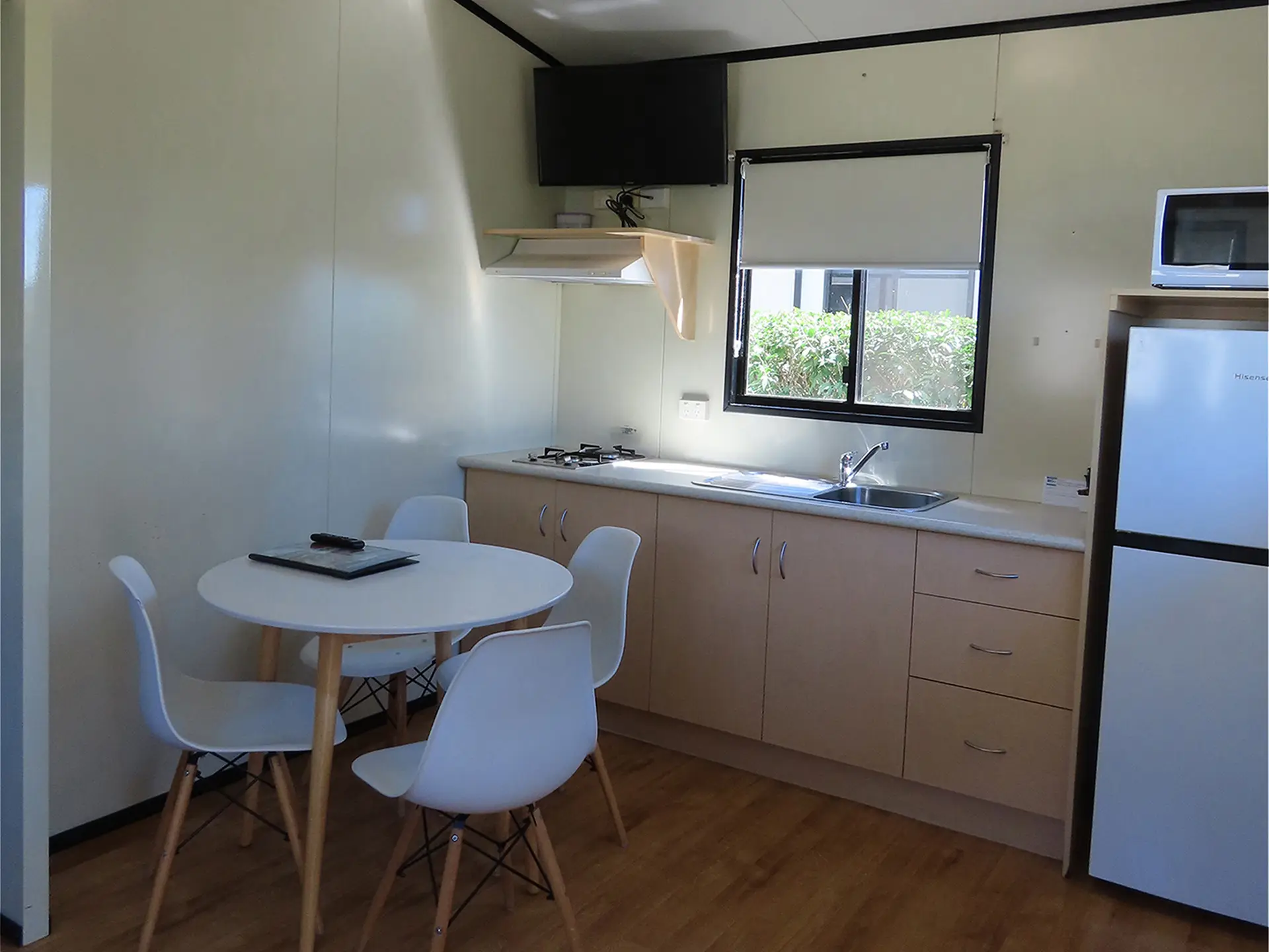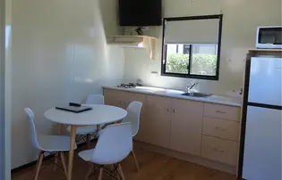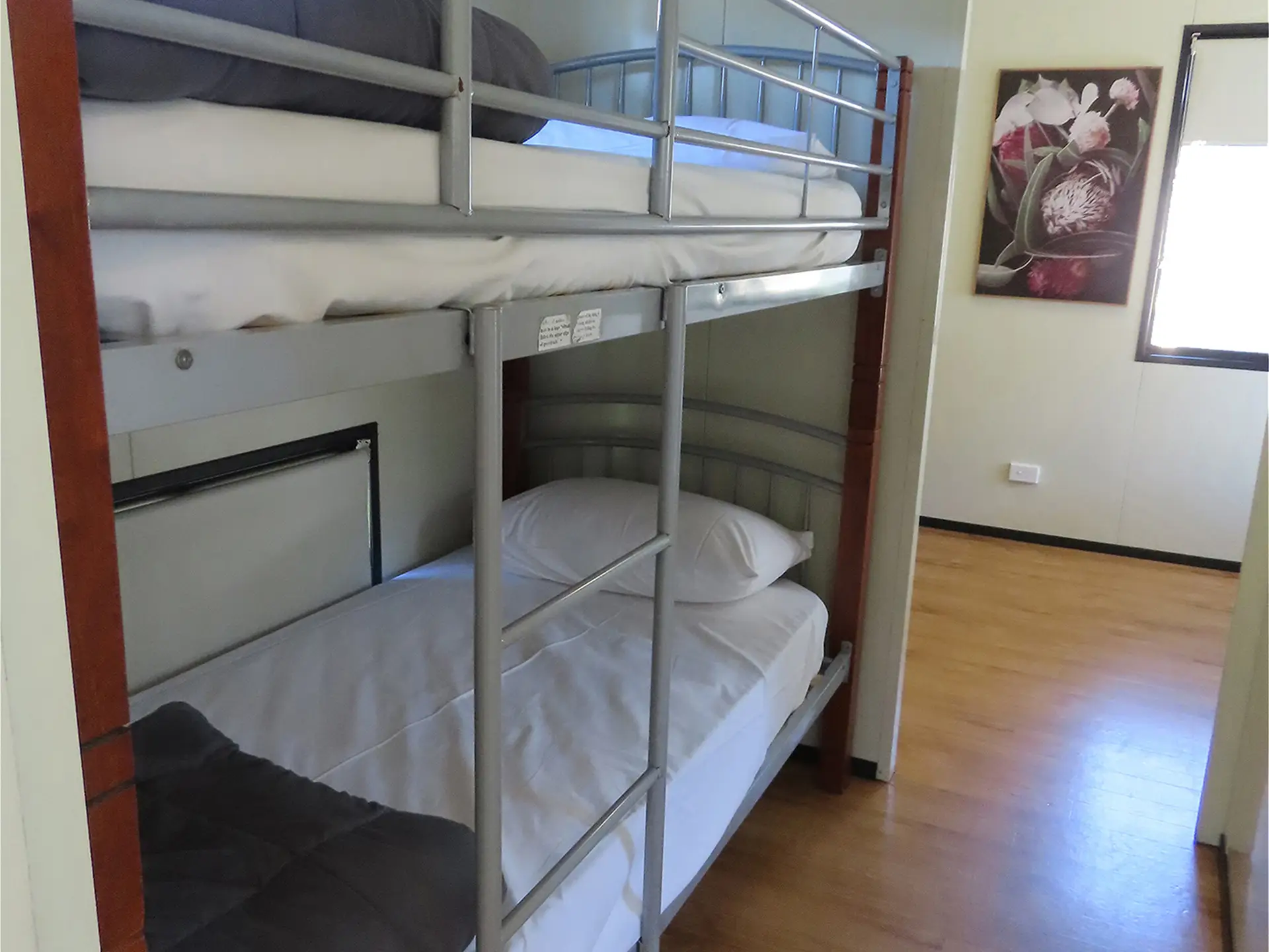 This fully self-contained modern 1 bedroom cabin with cooking facilities offers the room to move and sleeps up to 4 people. The bedroom has a queen bed with ensuite. The bunk beds are separated from the living area by sliding doors. It has split system/reverse cycle air conditioning for your comfort, digital television, outdoor setting and it's set amongst our award-winning gardens.